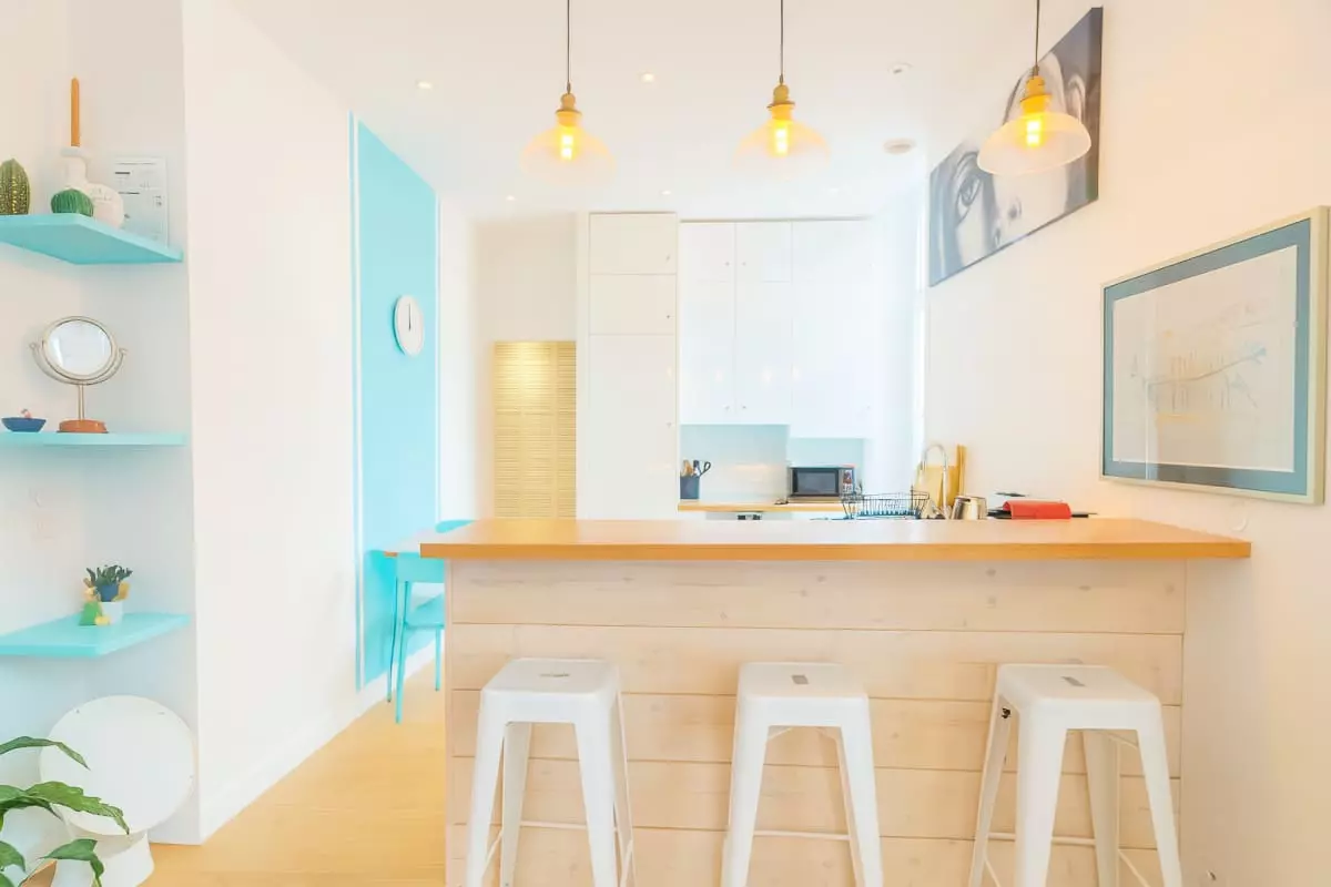 dishwasher, Nespresso coffee machine, kettle, toaster, refrigerator with freezer compartment, oven, microwave, small metal table with two chairs, complemented by a bar and its three stools.