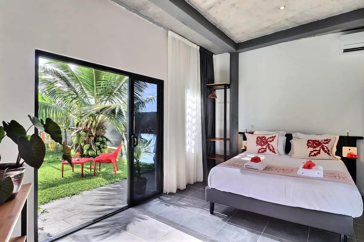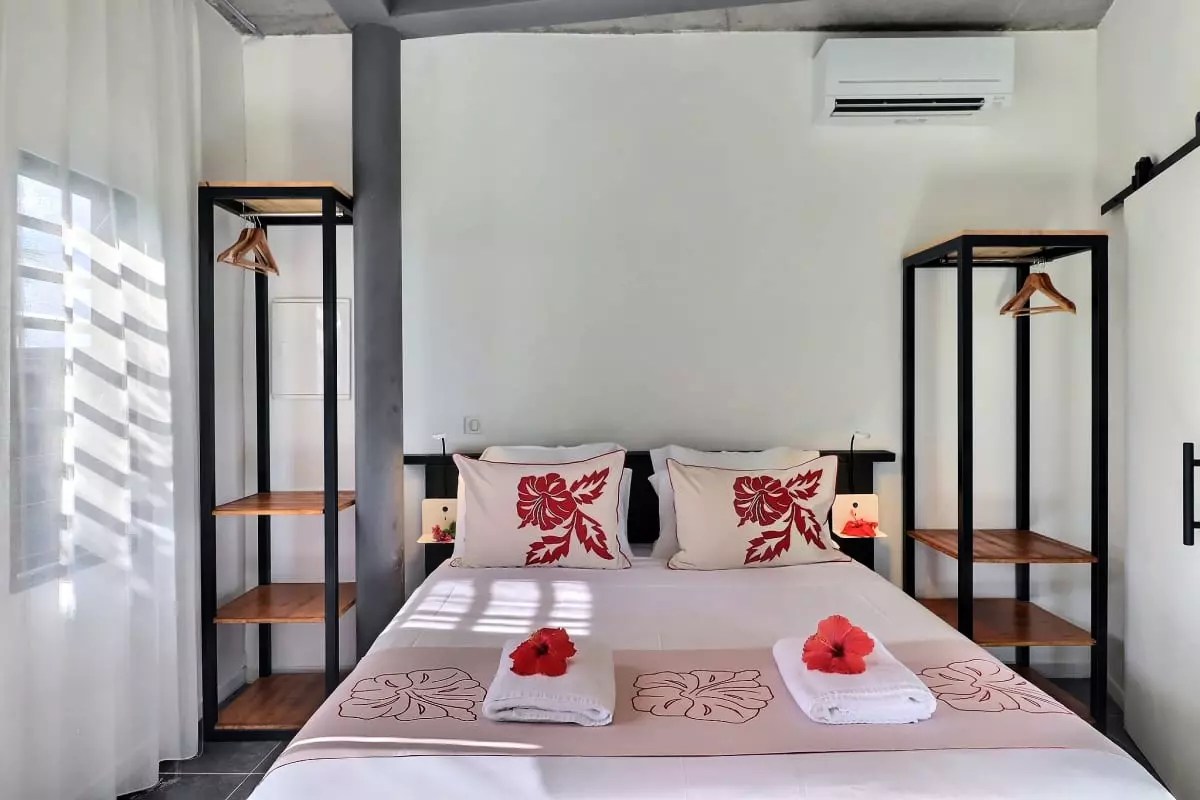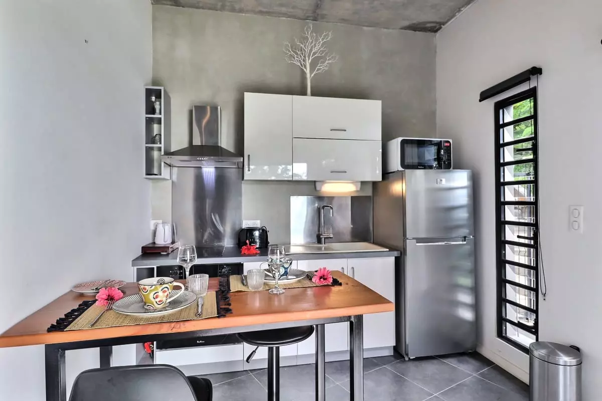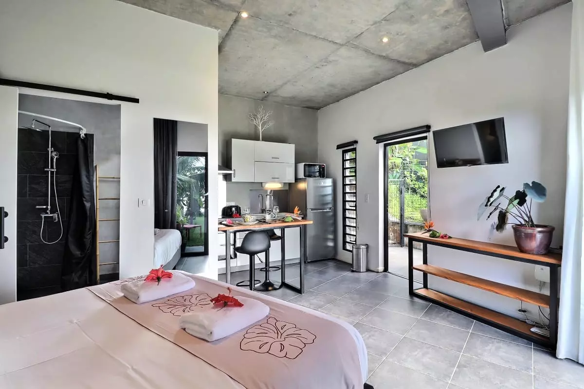 The annex, approximately 27 m², features a king-size bed, a fully equipped kitchen, a modern bathroom with shower, vanity unit and toilet, as well as direct access to the infinity pool. From its terrace, you can enjoy breathtaking views of the island of Moorea and the ocean.