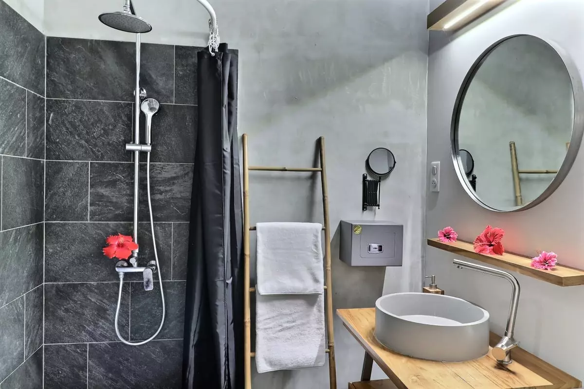 The outdoor spaces – infinity pool, garden, terrace – are shared with the owner, who lives in the main house. Rarely present during the day, she guarantees your peace and quiet while remaining available should you need anything. You might encounter two very affectionate and sociable dogs, who only live on the property when the owner is there. They are gentle, playful, and sometimes seek cuddles. When the owner is away, they are always kept in their kennel to ensure your tranquility.