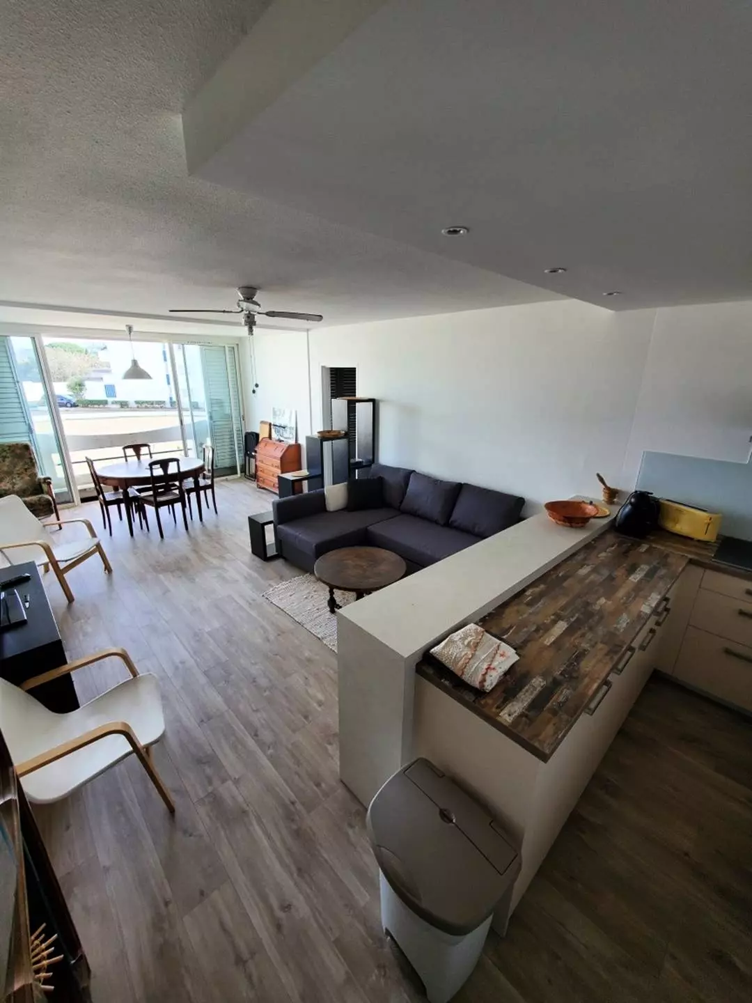 BOUCANET - In a prestigious beachfront residence with a swimming pool (open mid-June to mid-September), a 70m² (approx.) 3-bedroom apartment on the 1st floor with sea views. It comprises a bright living room with a sofa, a dining area, a TV, a brand new fully equipped kitchen (microwave, fridge/freezer, dishwasher, hob), a bedroom with a balcony offering partial sea views and two single beds pushed together, a bedroom with a sea view and a queen-size bed (160cm), and a windowless bedroom with a bunk bed and en-suite shower room. There is also a second shower room with a washing machine and a separate WC. Secure, unassigned communal parking is available. 800m from the town centre. Sleeps 6. Pets are not allowed.