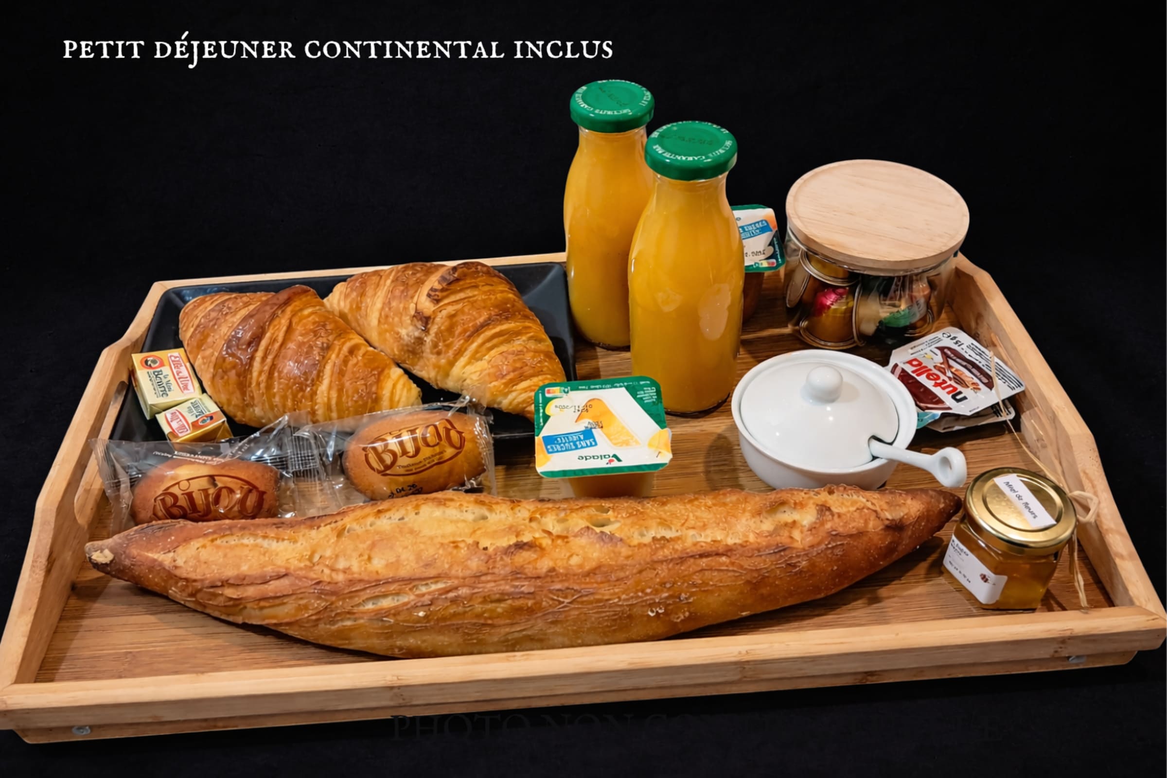 Petit déjeuner continental inclus : Jus d'orange, 2 croissants frais, 1 baguette fraiche, capsule multichoix, Thé, assortiment à tartiner (confiture, pate à tartiner, miel)