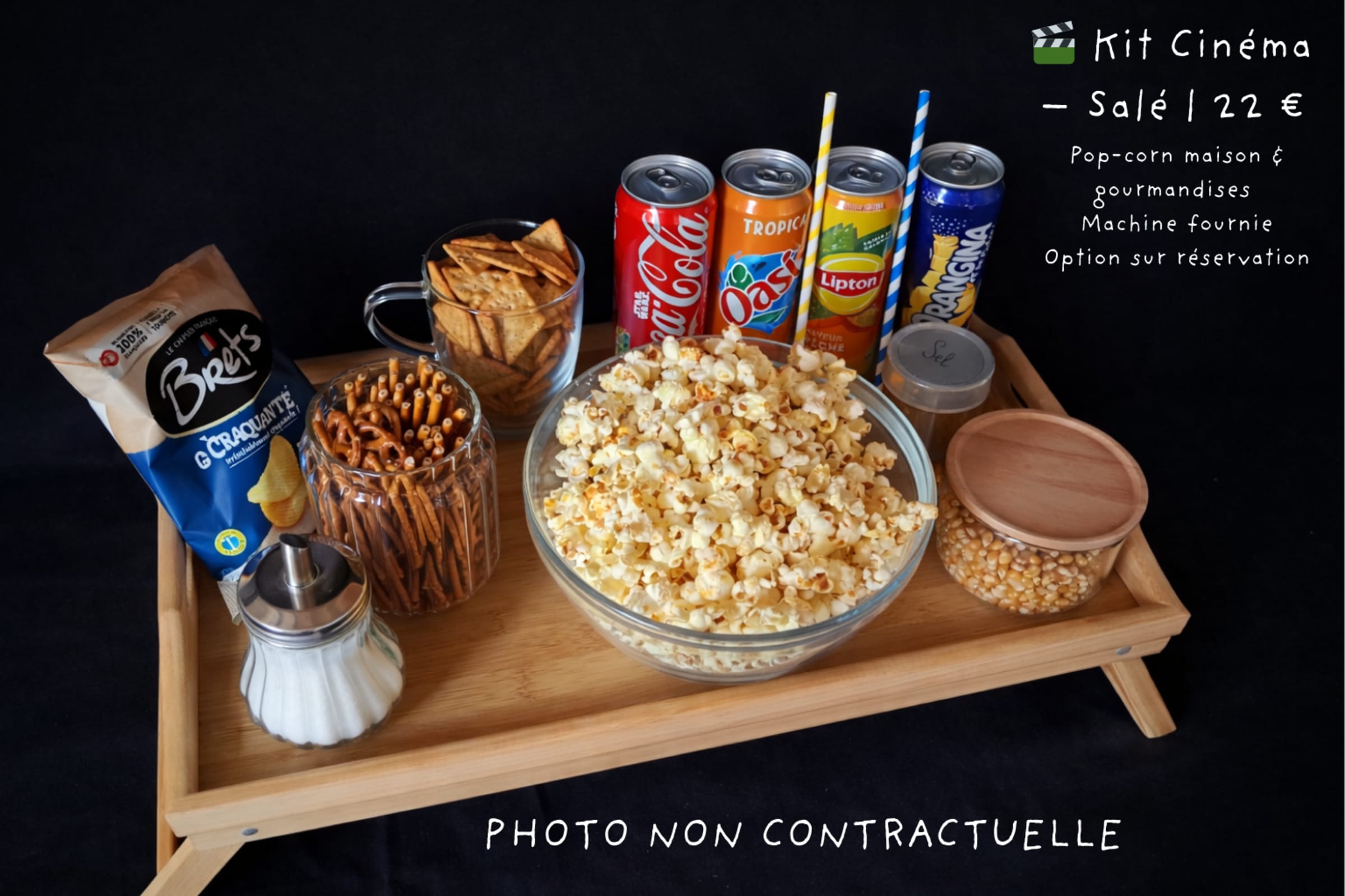Installez-vous confortablement, on s’occupe de tout : pop-corn à faire, snacks au choix (sucré ou salé) et boissons pour une séance cinéma comme à la maison… en mieux 🍿❤️