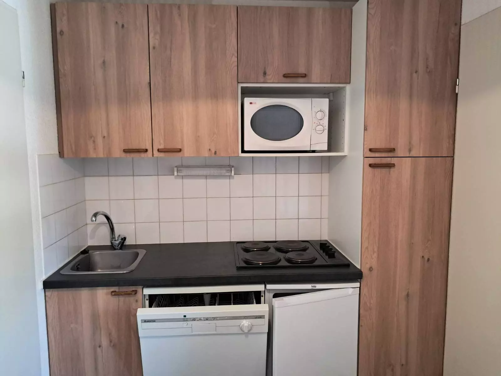 The kitchen, open to the living room, is equipped with a microwave, ceramic hob, refrigerator, and dishwasher.