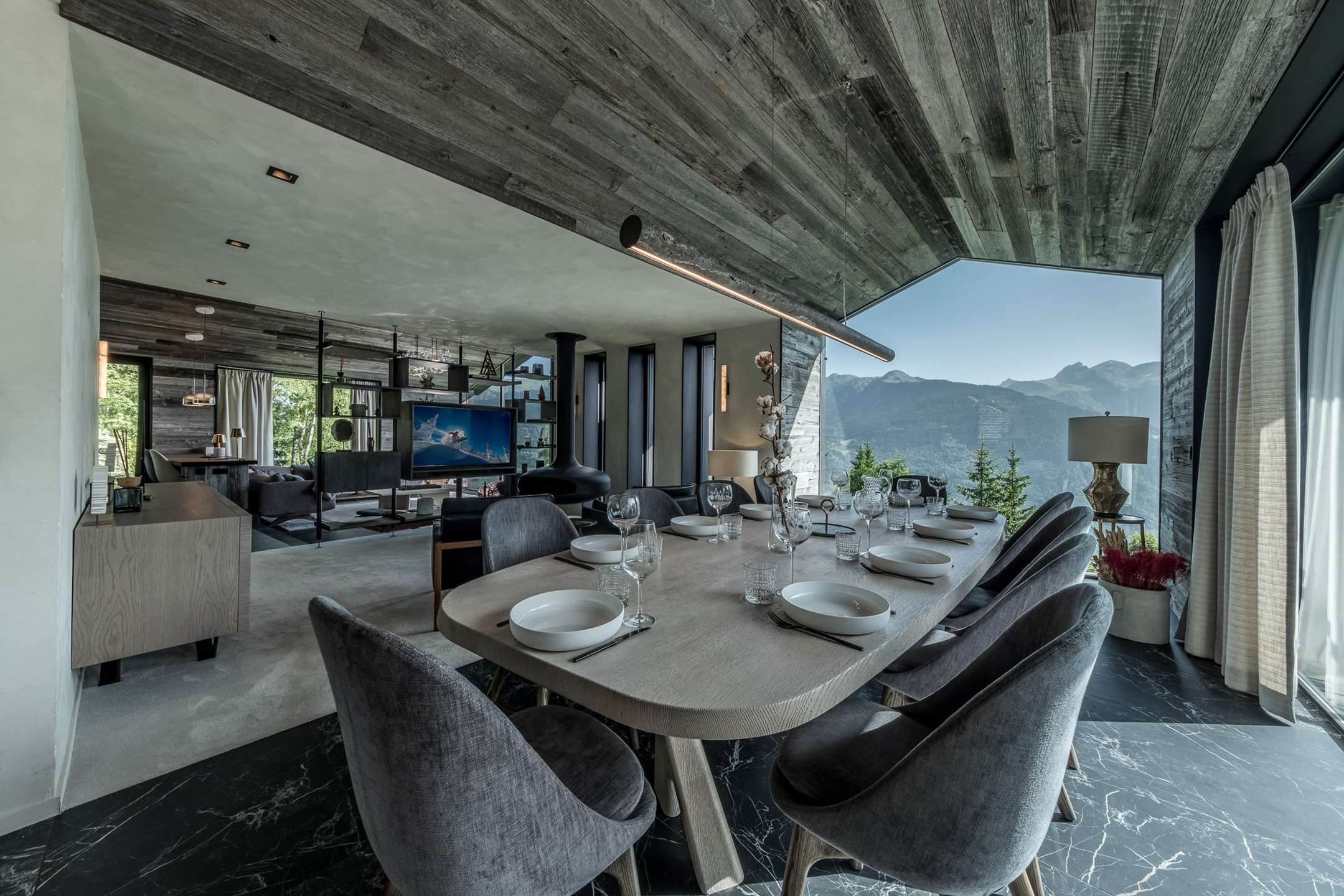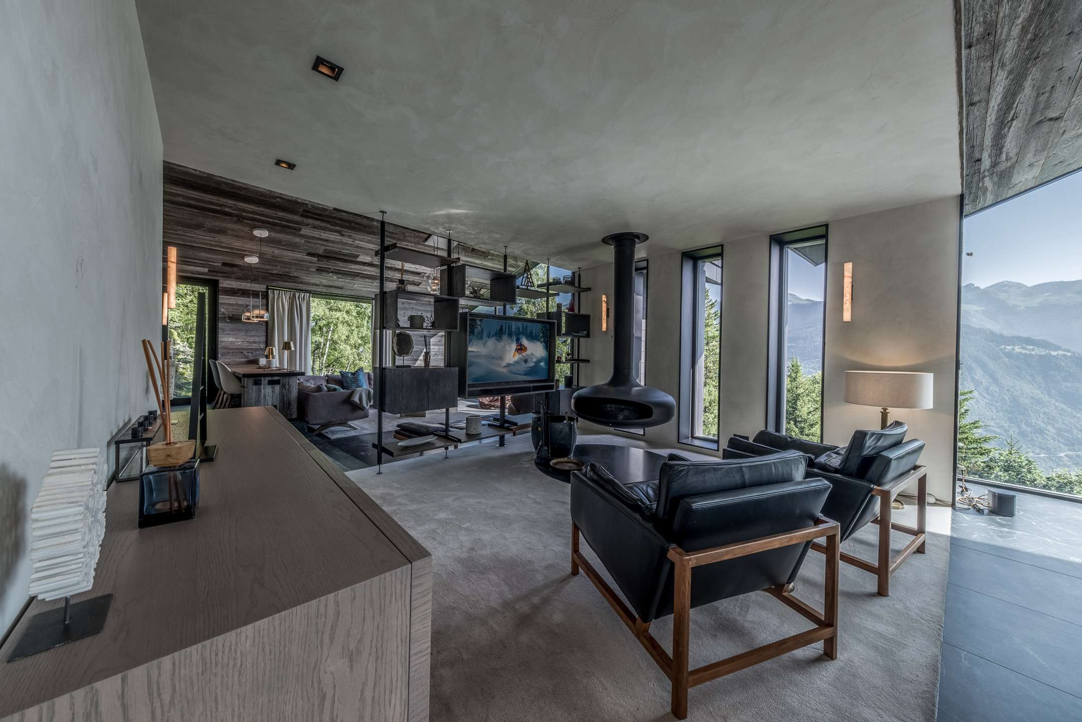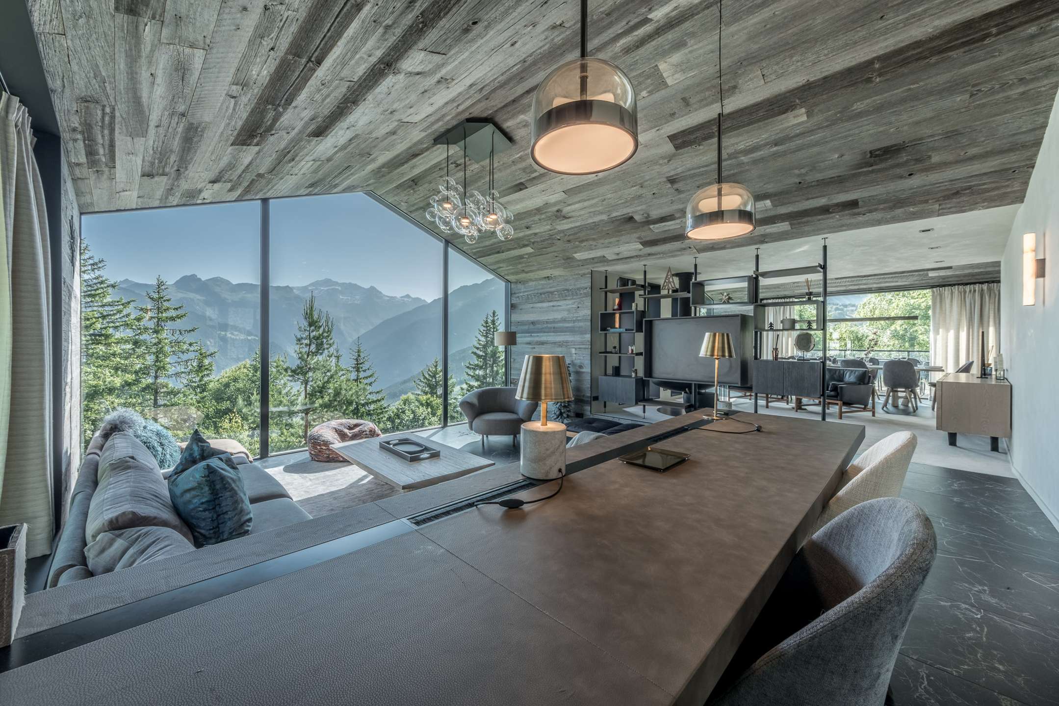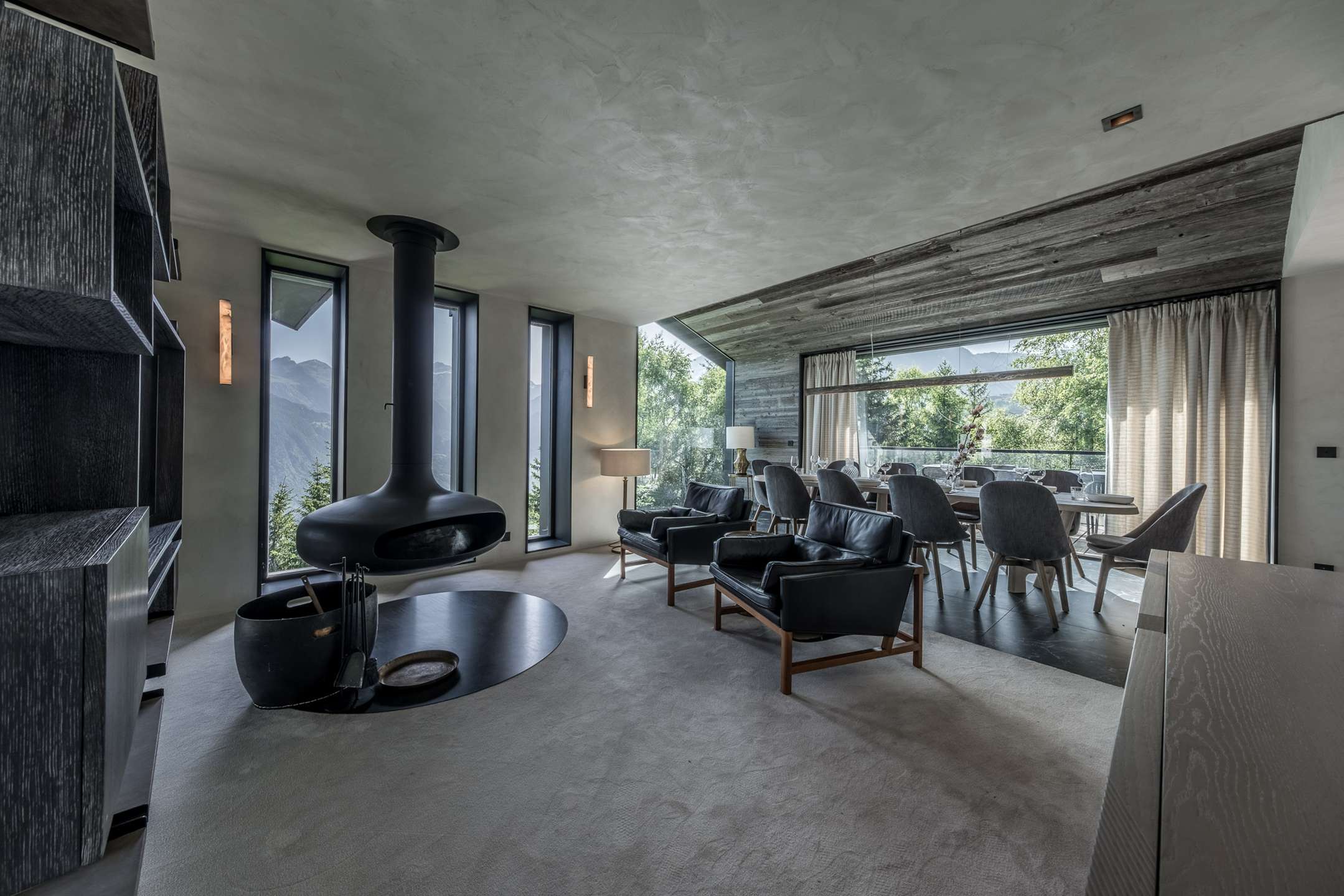- A living room / dining room with a suspended fireplace and a magnificent view of the mountain and the valley