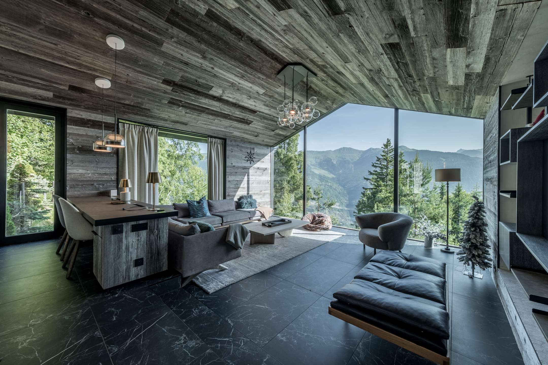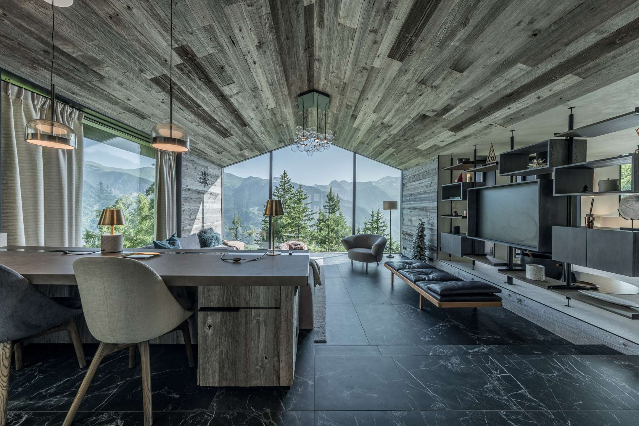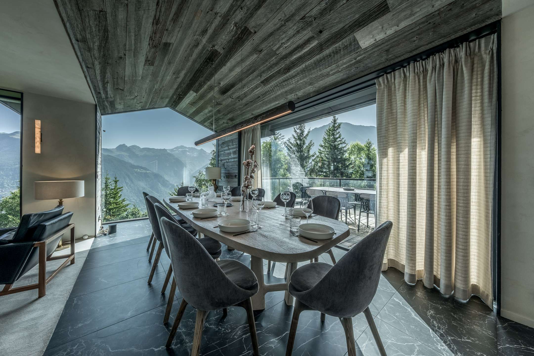 - A living room / dining room with a suspended fireplace and a magnificent view of the mountain and the valley