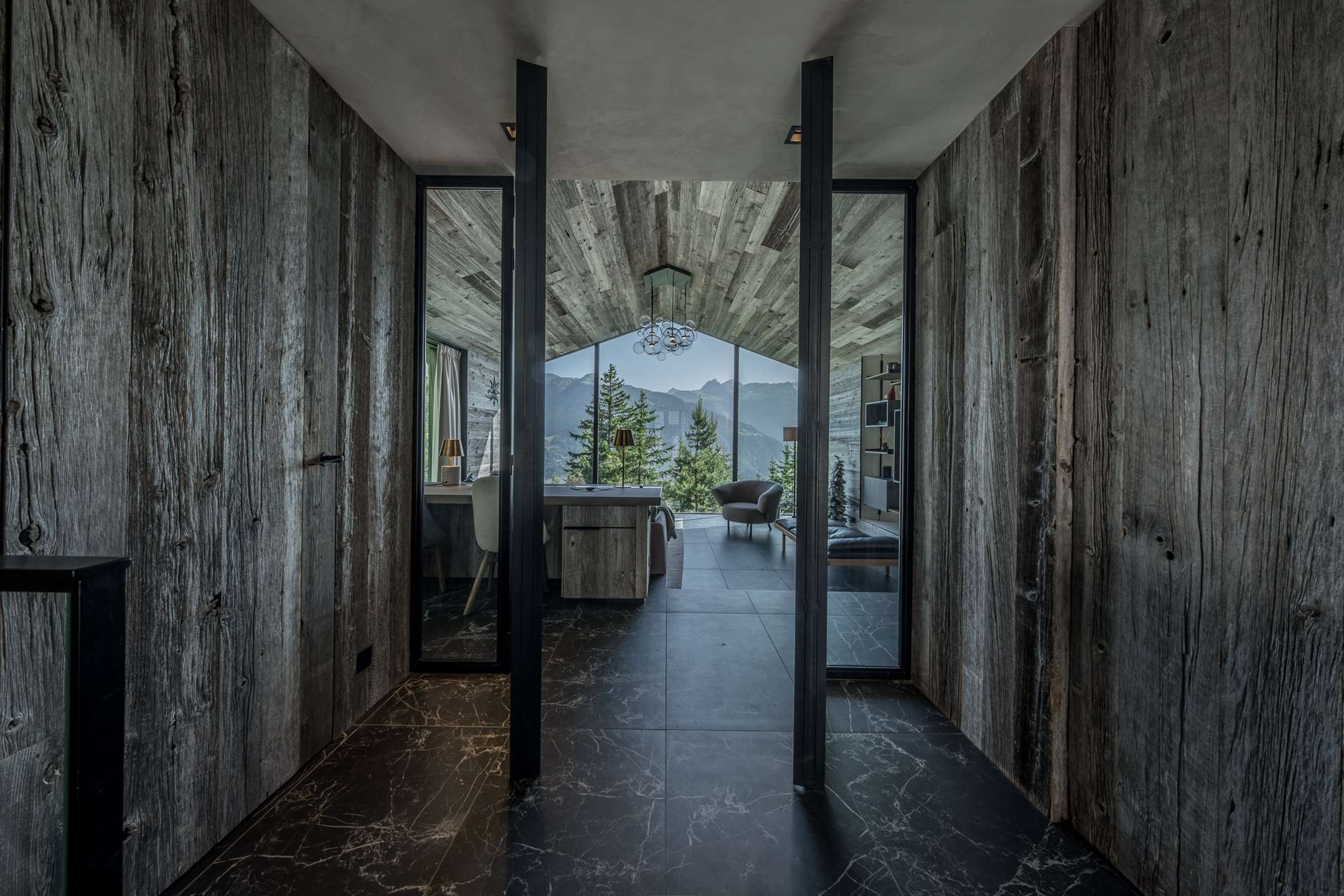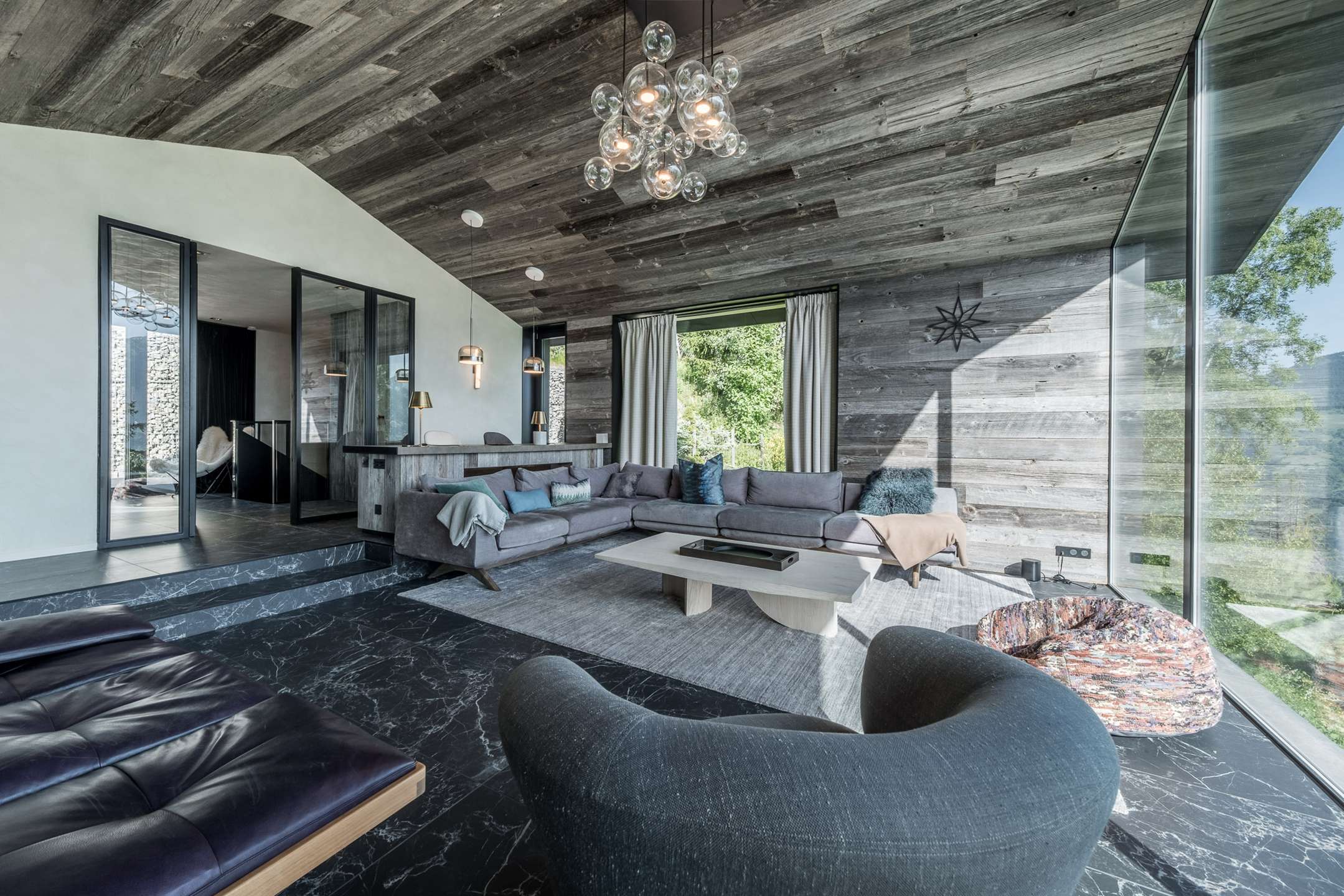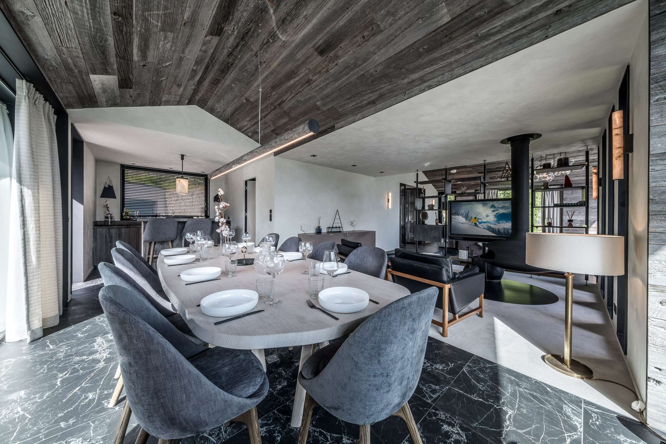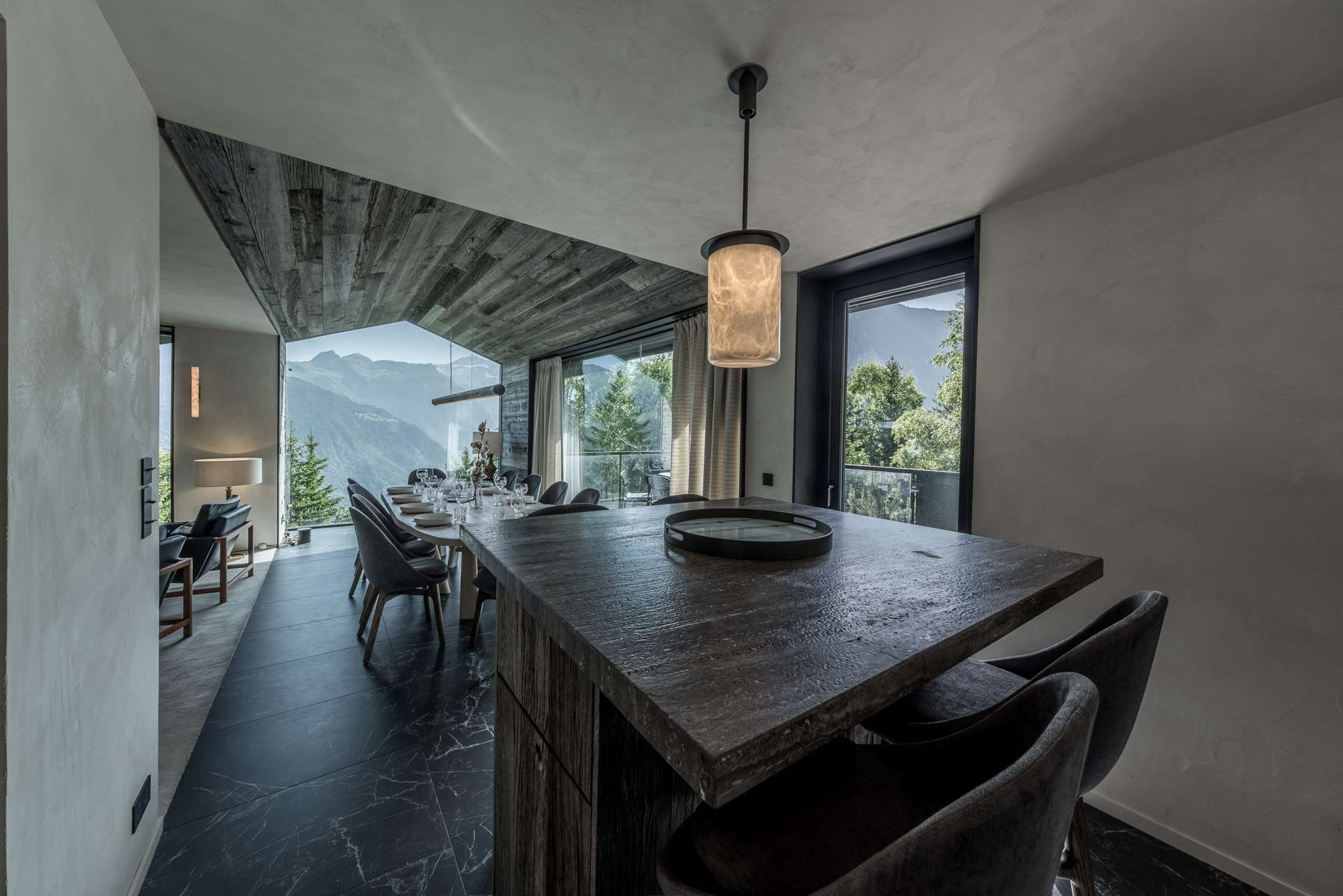 - A living room / dining room with a suspended fireplace and a magnificent view of the mountain and the valley