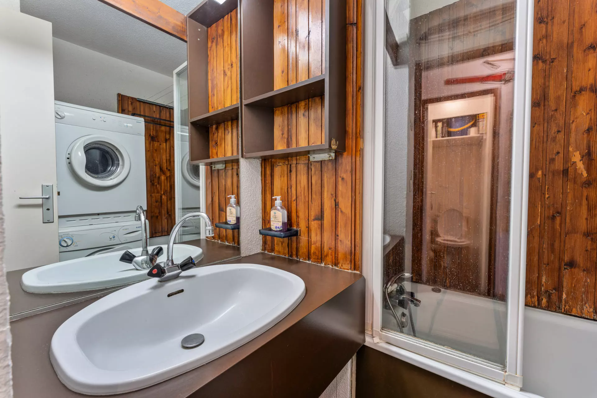 The bathroom has a bathtub for a relaxing moment after your favorite activities, as well as a washing machine and dryer to lighten your luggage.