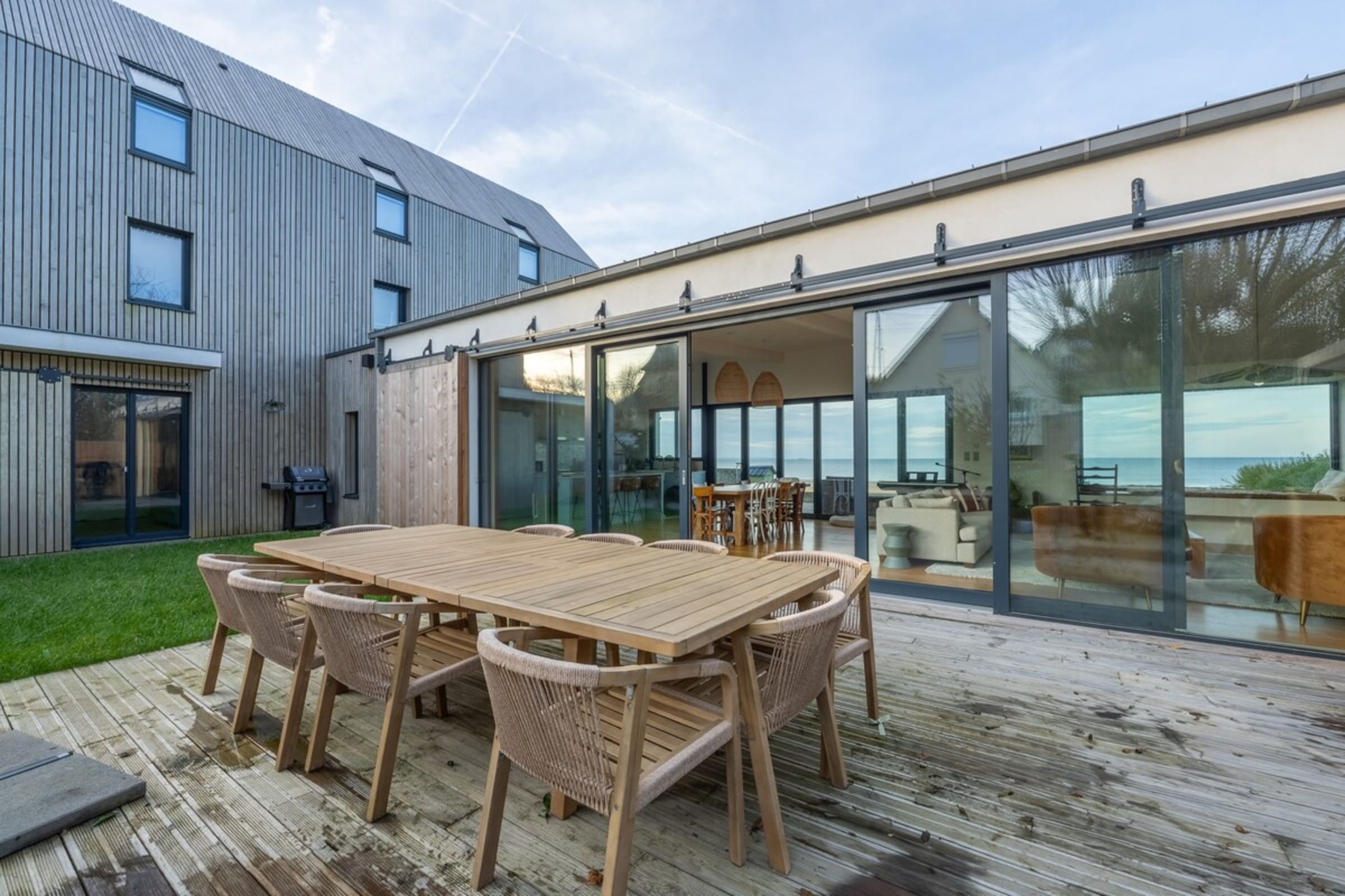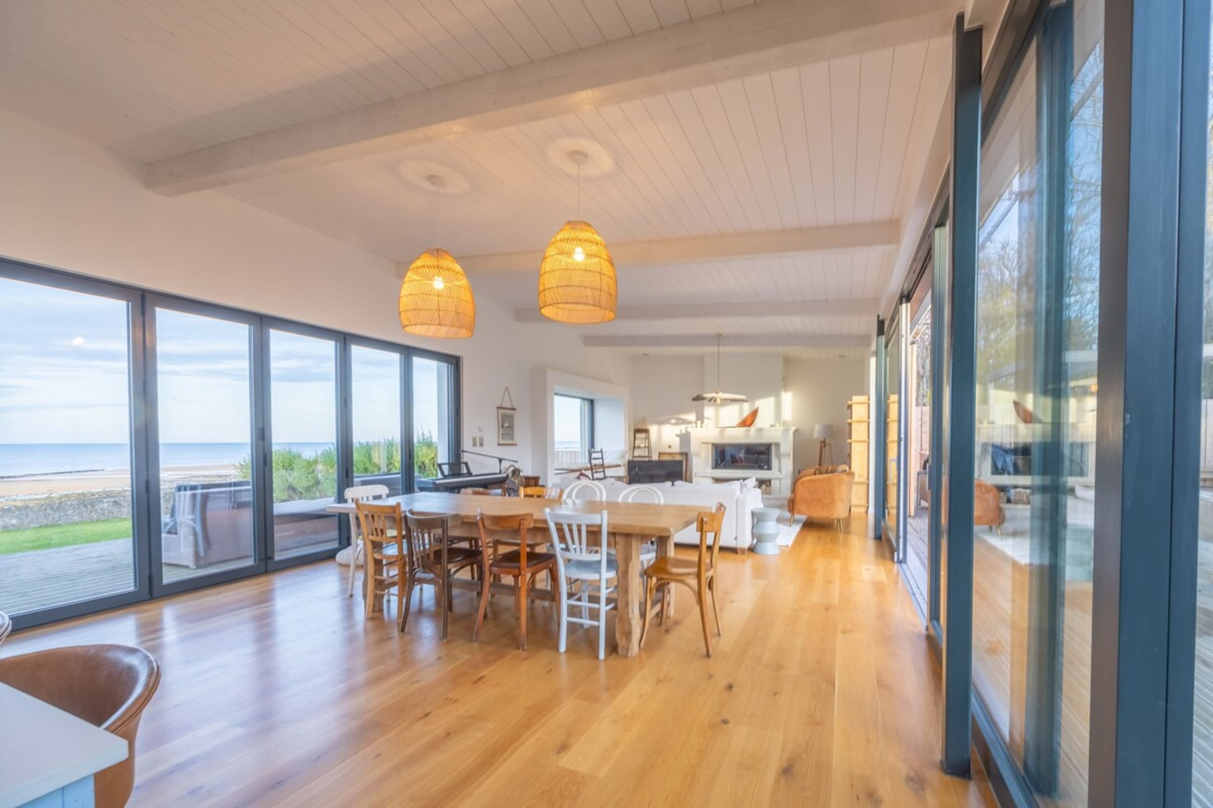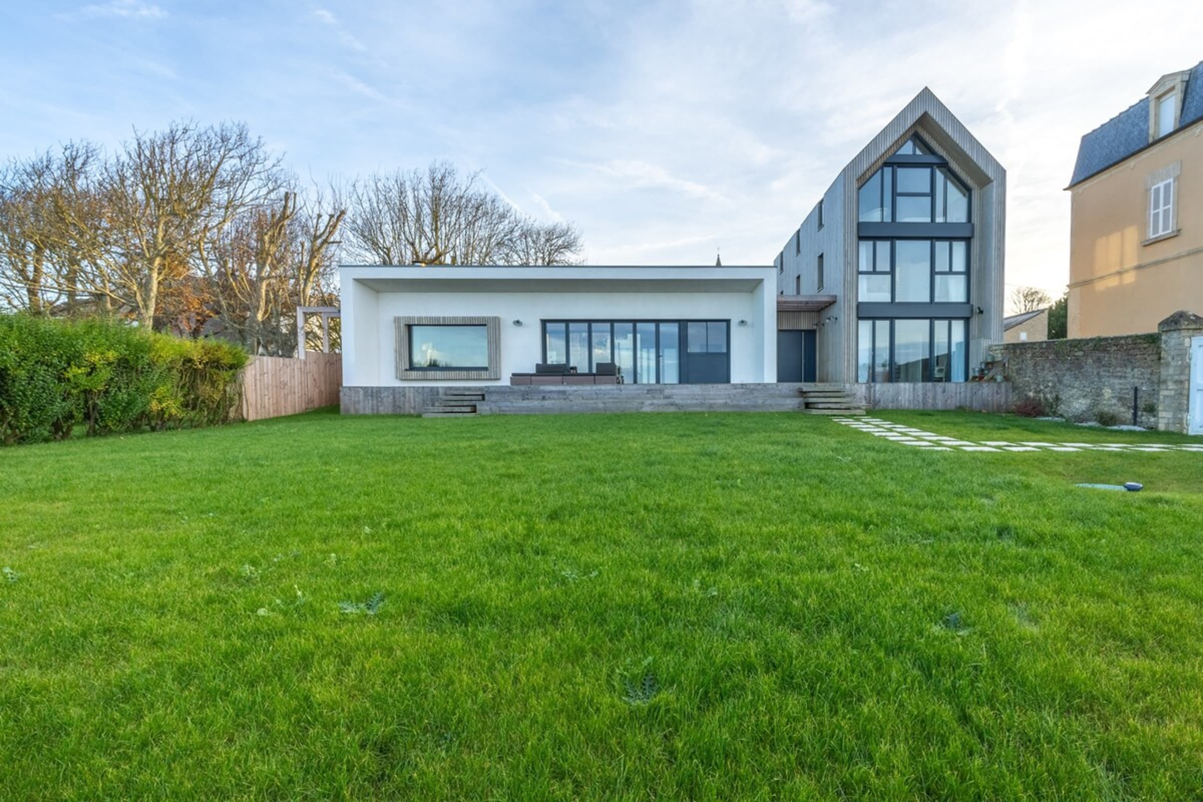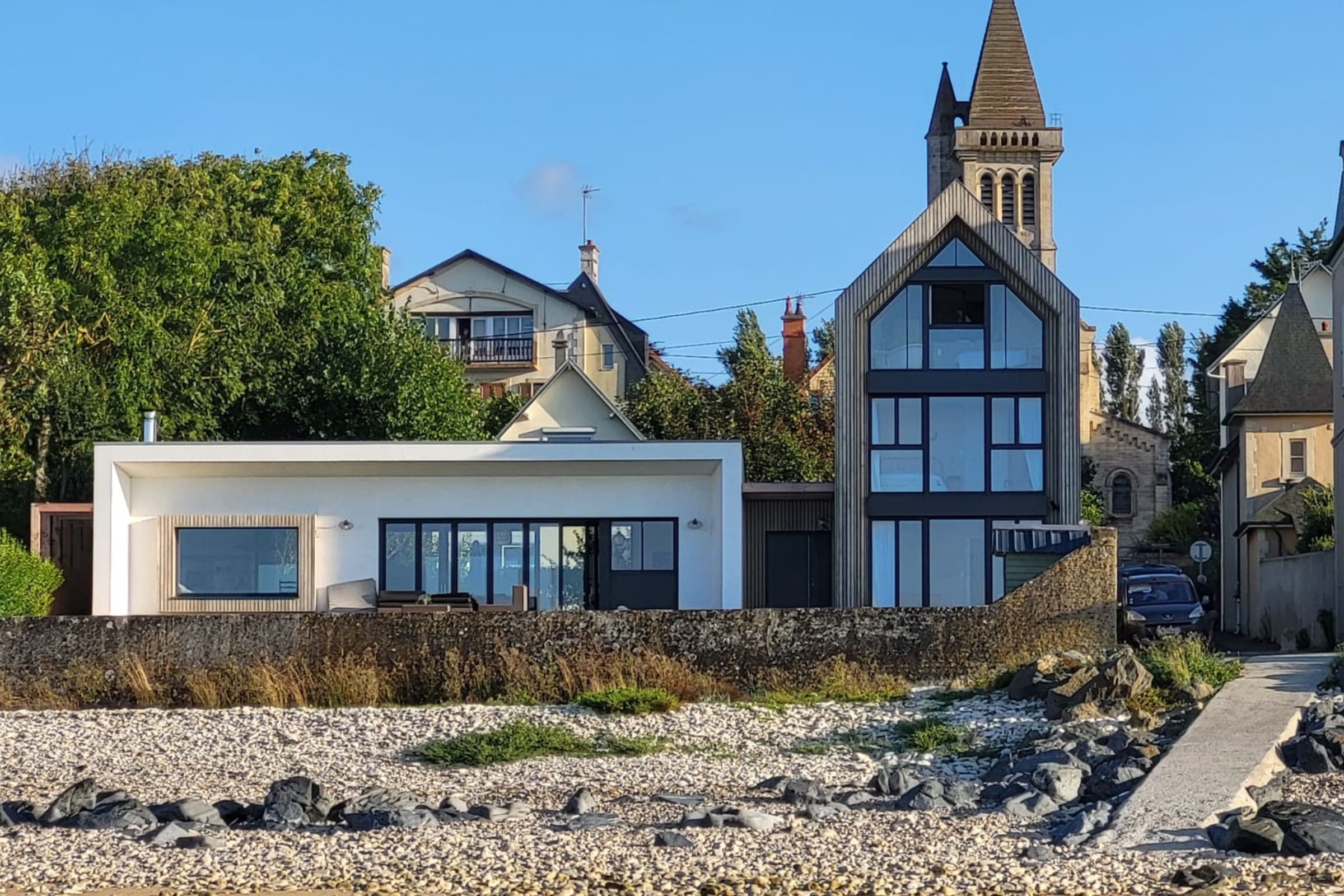 Superb architect’s house on the seafront. This beautiful set will delight you by its geographical location and the sea view it offers. Composed of an old part entirely redone for the night part, and a new extension grouping the kitchen open to the living room & dining room. This part has large windows opening sea side but also on the private garden.