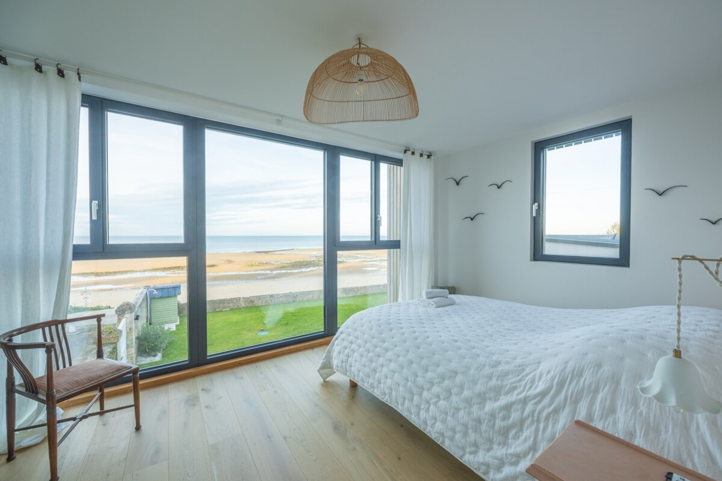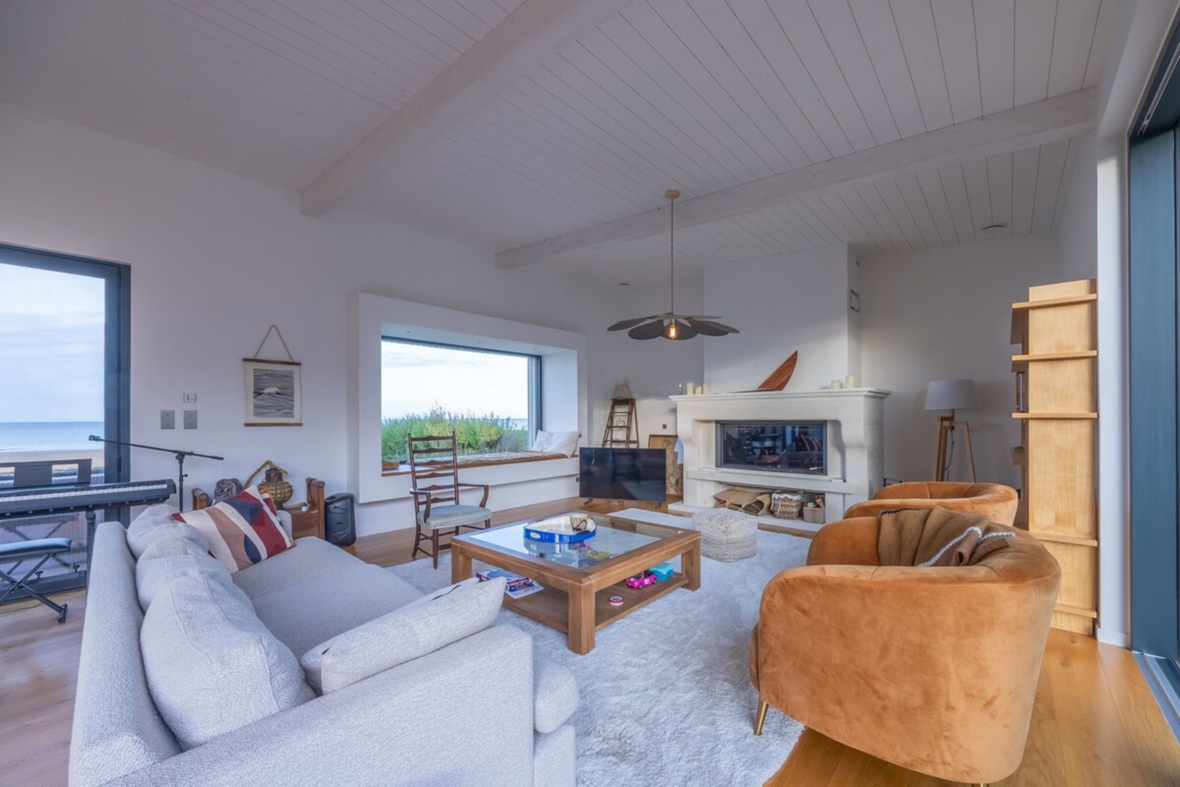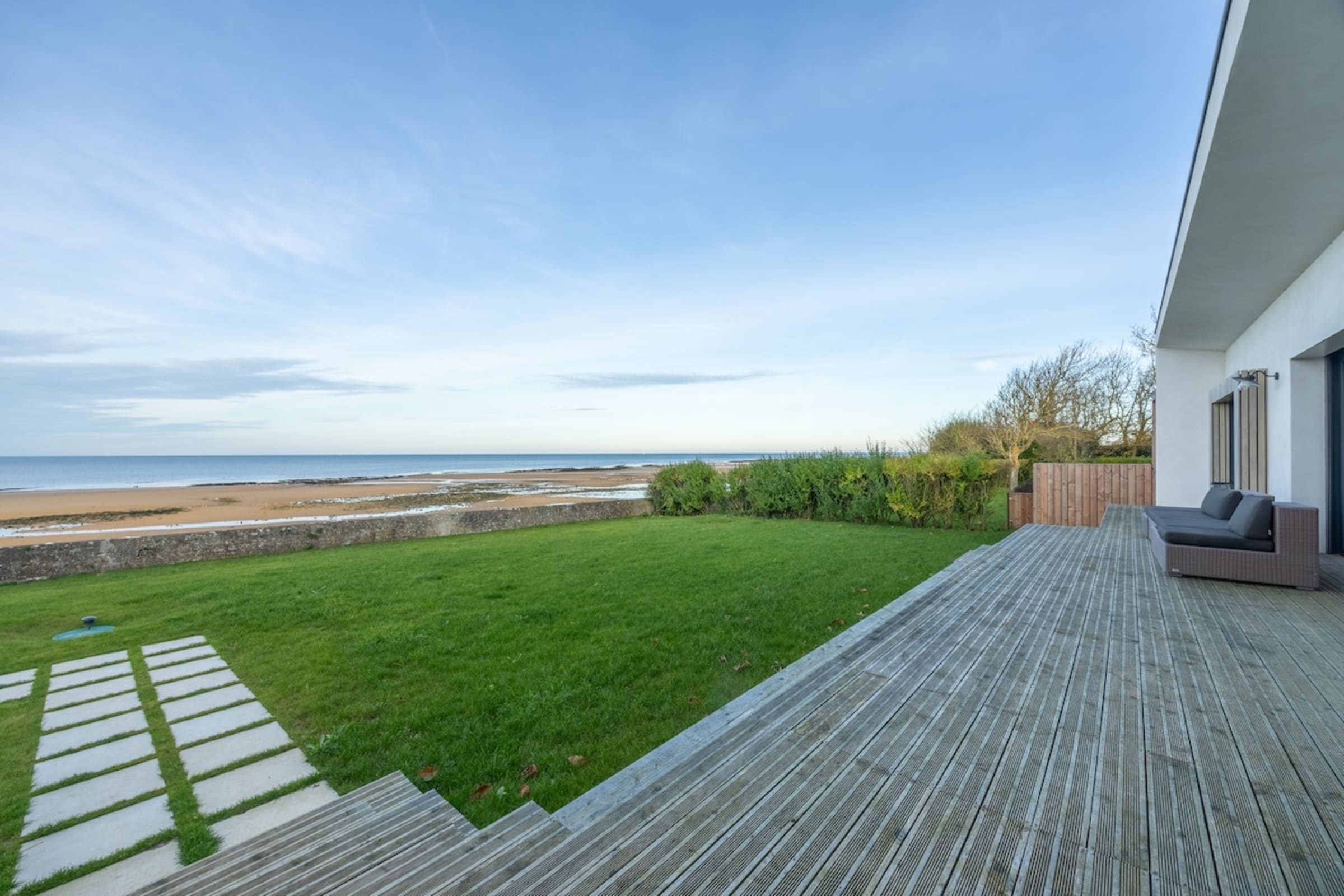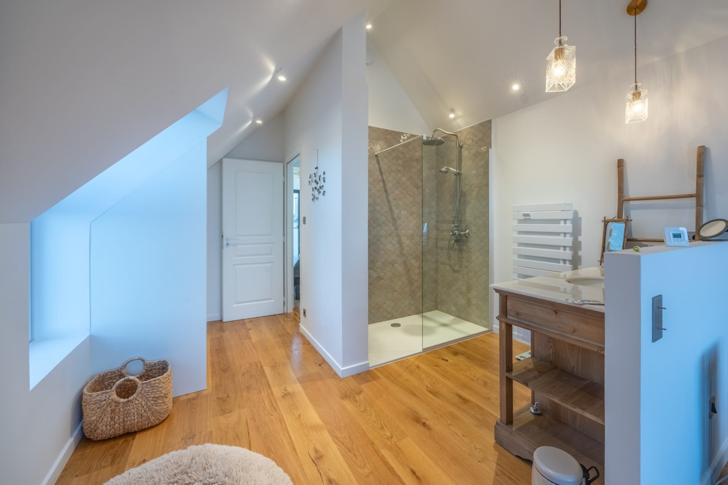 Superb architect’s house on the seafront. This beautiful set will delight you by its geographical location and the sea view it offers. Composed of an old part entirely redone for the night part, and a new extension grouping the kitchen open to the living room & dining room. This part has large windows opening sea side but also on the private garden.
