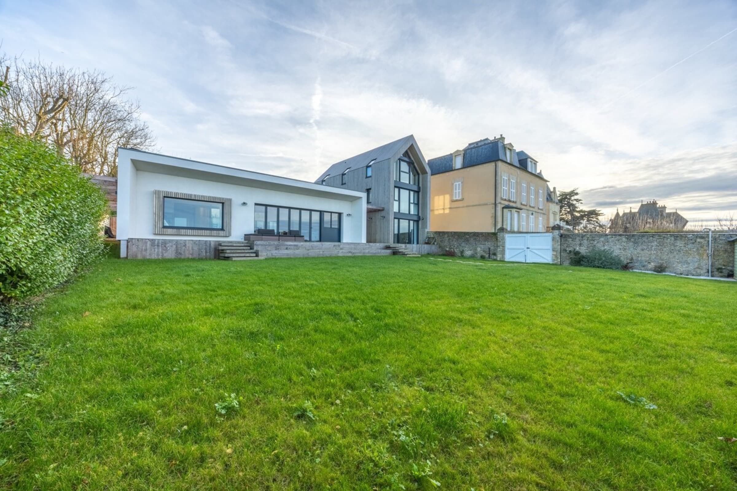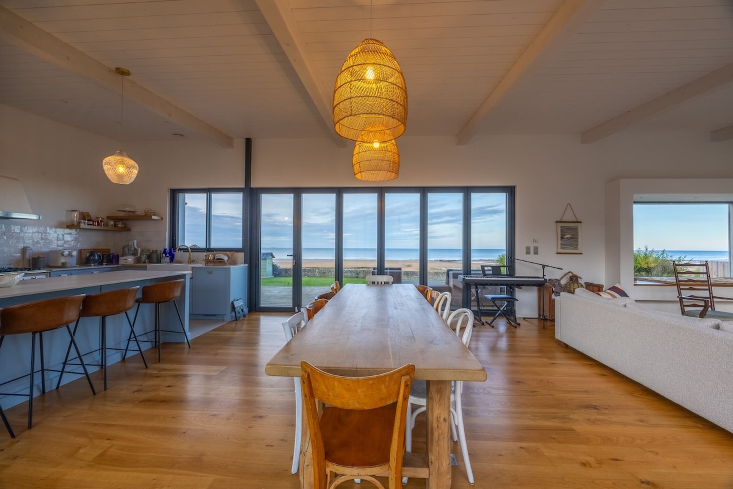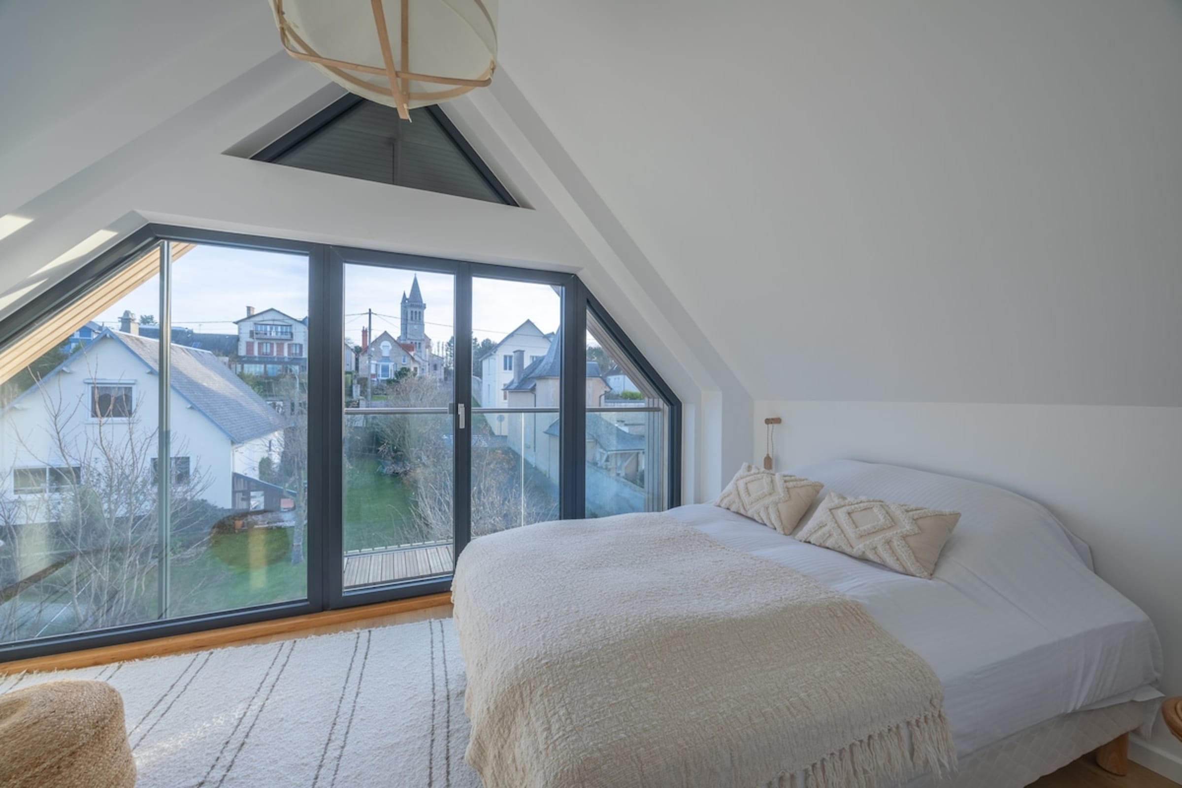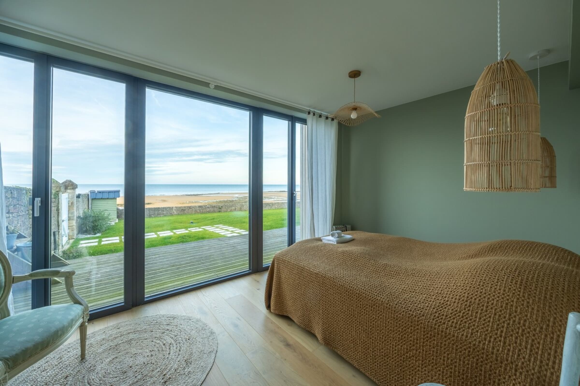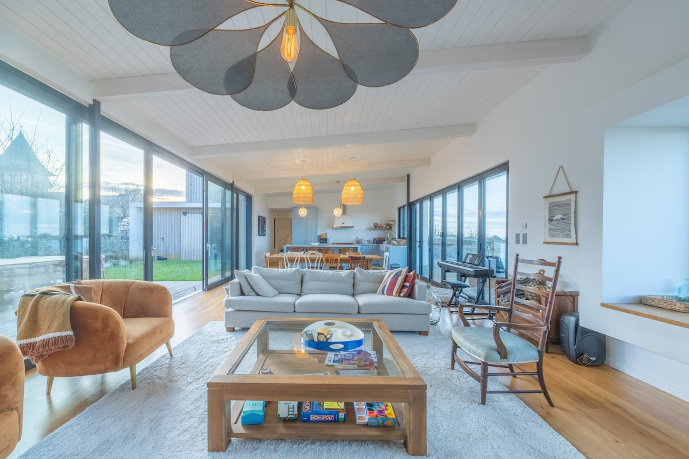 Superb architect’s house on the seafront. This beautiful set will delight you by its geographical location and the sea view it offers. Composed of an old part entirely redone for the night part, and a new extension grouping the kitchen open to the living room & dining room. This part has large windows opening sea side but also on the private garden.