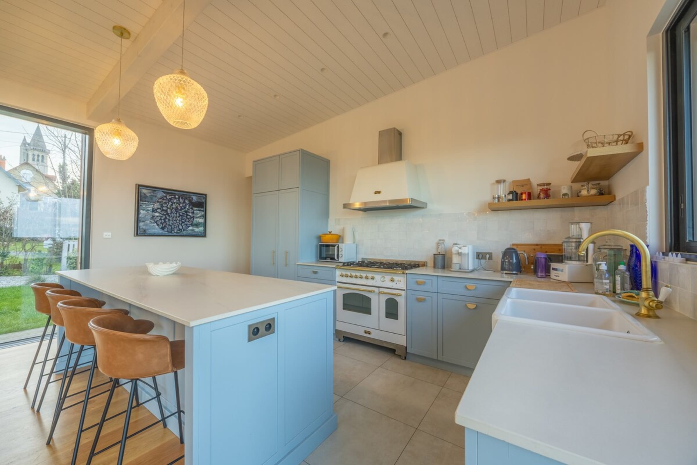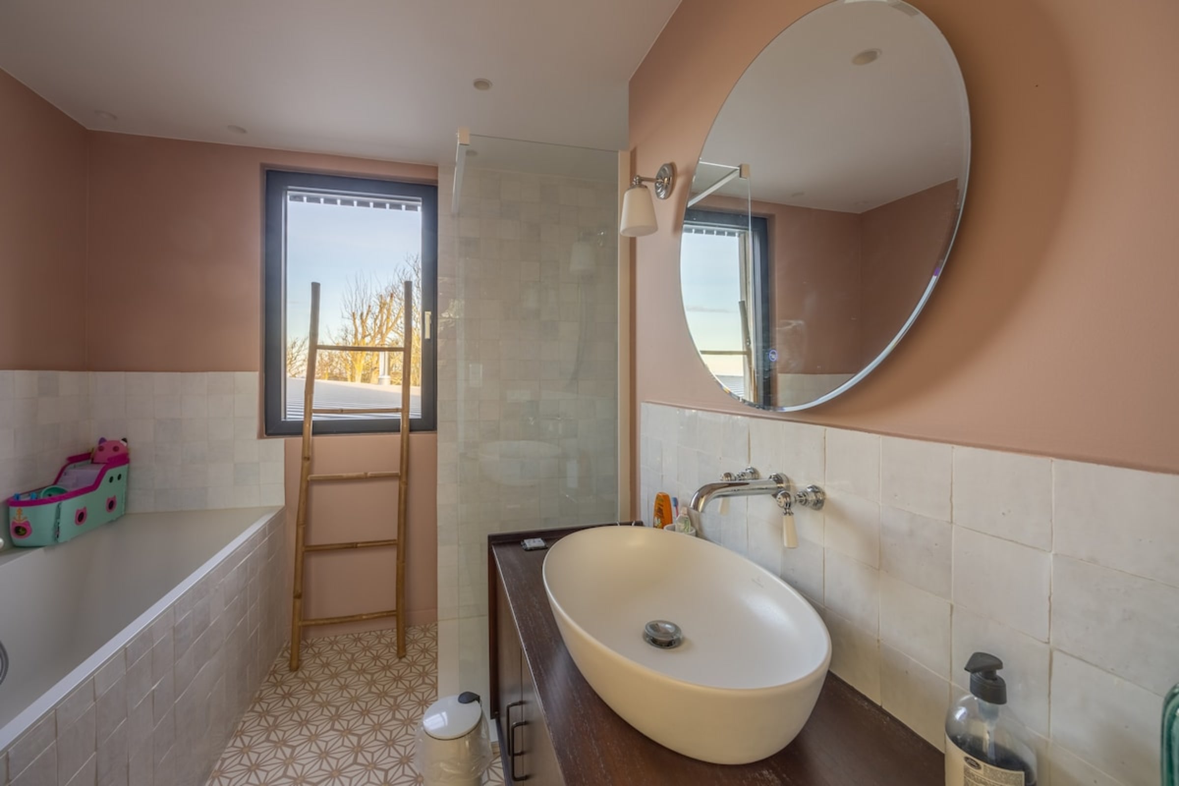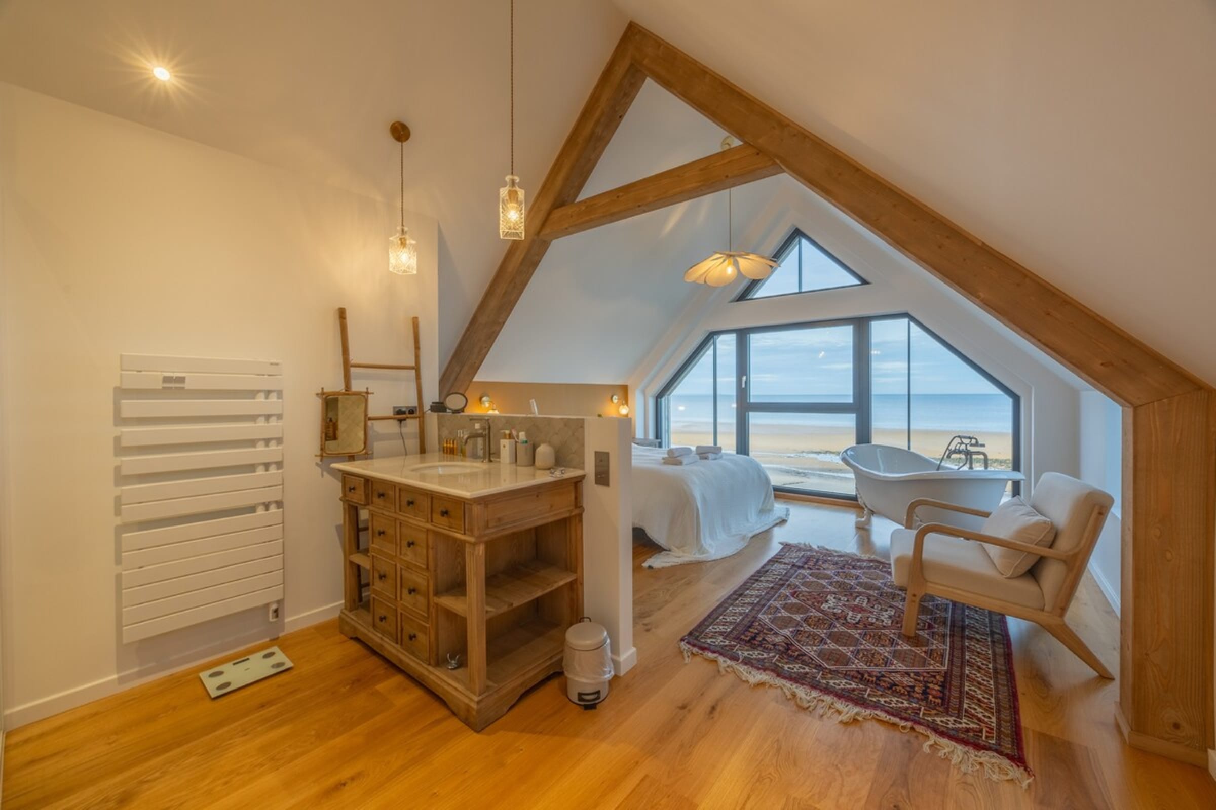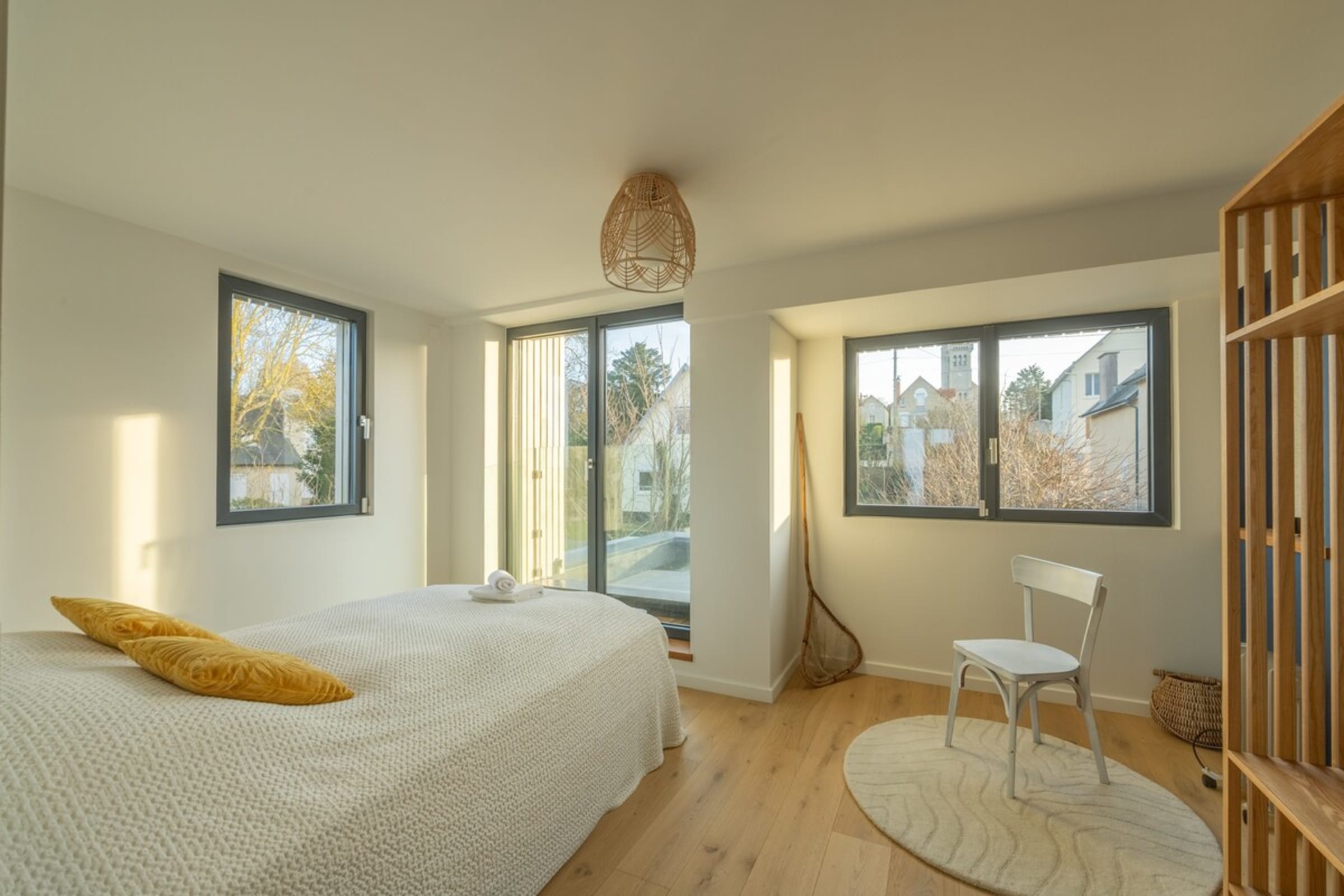 Superb architect’s house on the seafront. This beautiful set will delight you by its geographical location and the sea view it offers. Composed of an old part entirely redone for the night part, and a new extension grouping the kitchen open to the living room & dining room. This part has large windows opening sea side but also on the private garden.