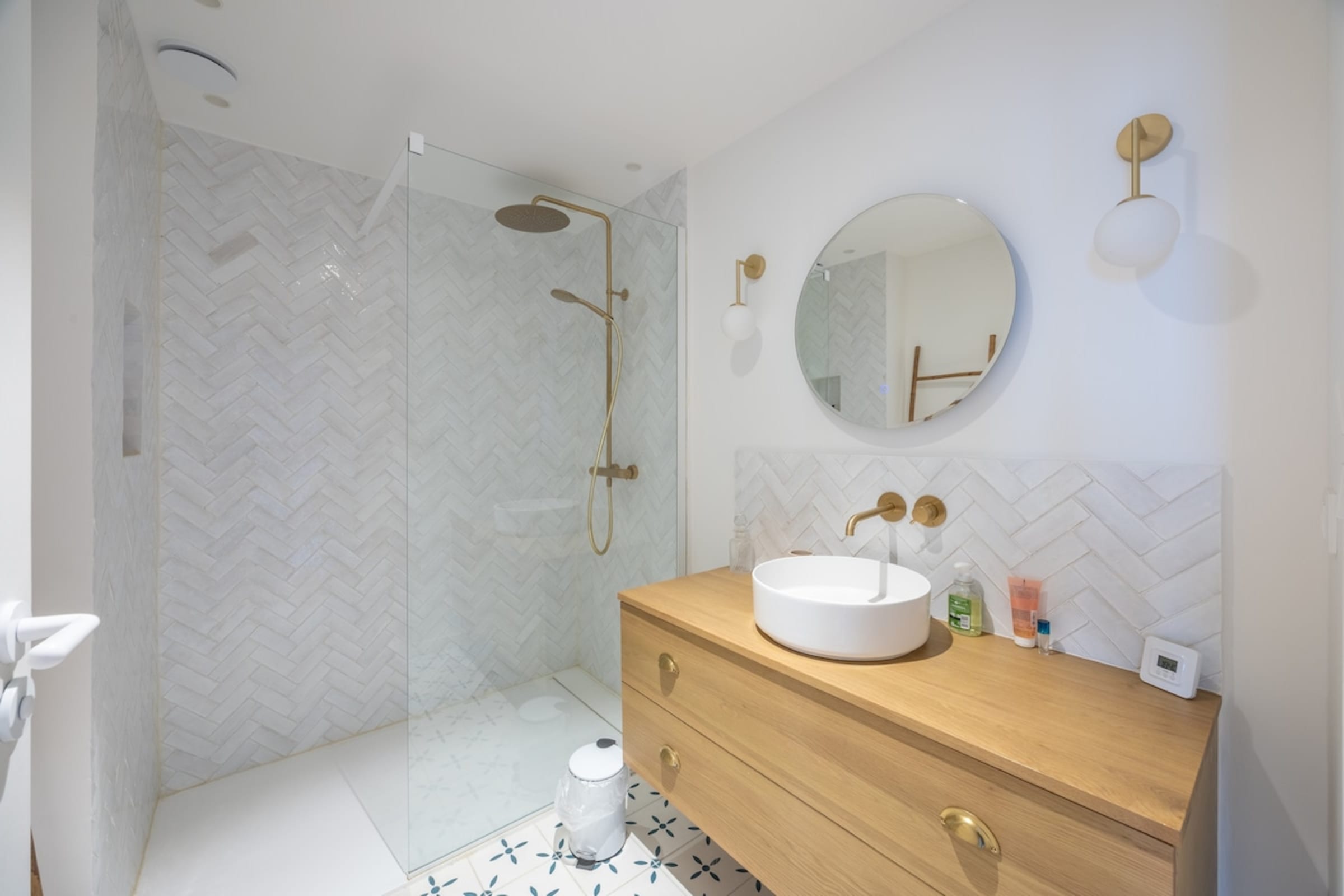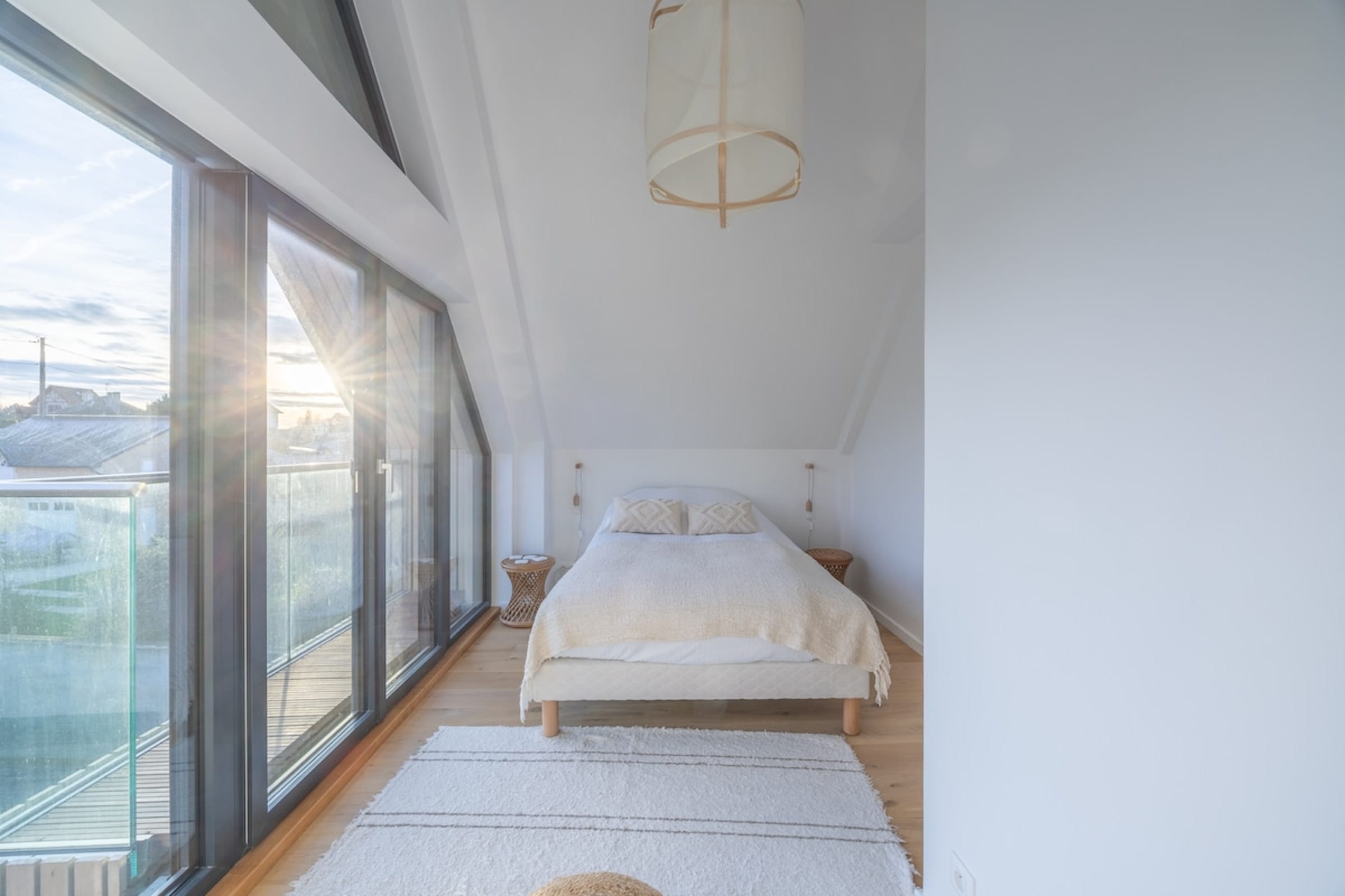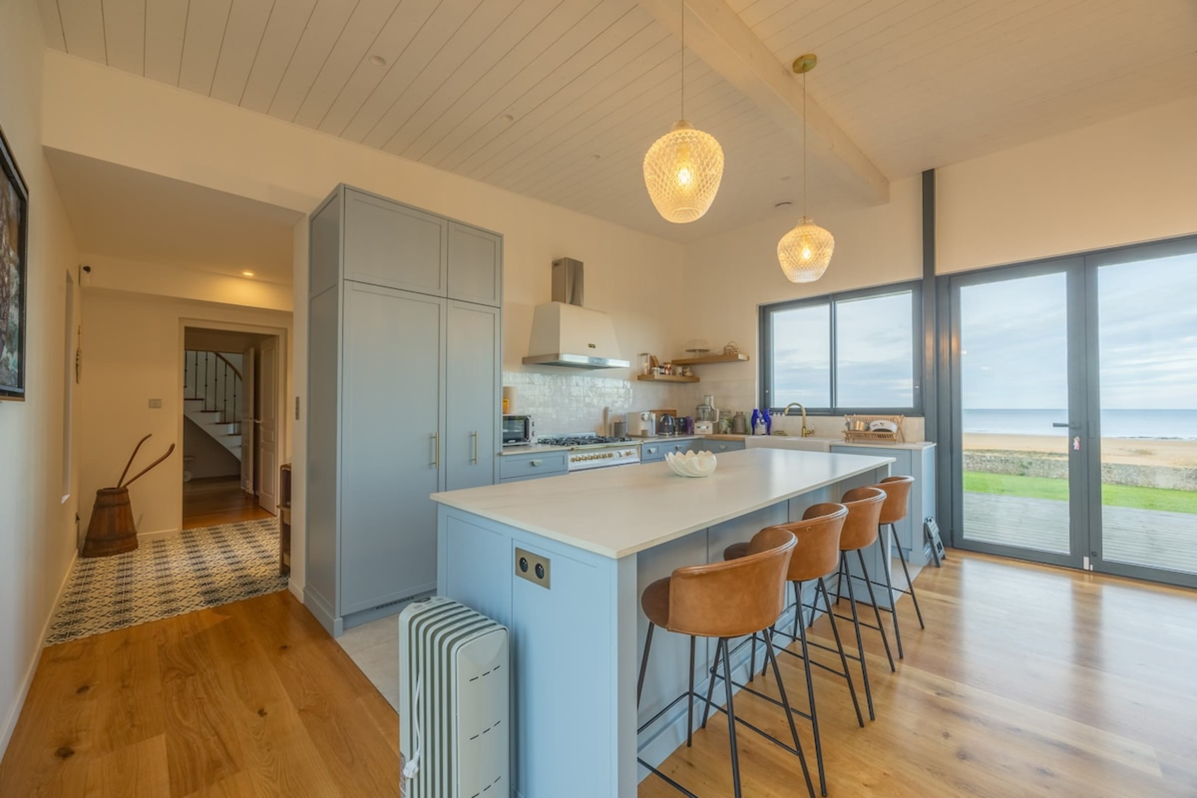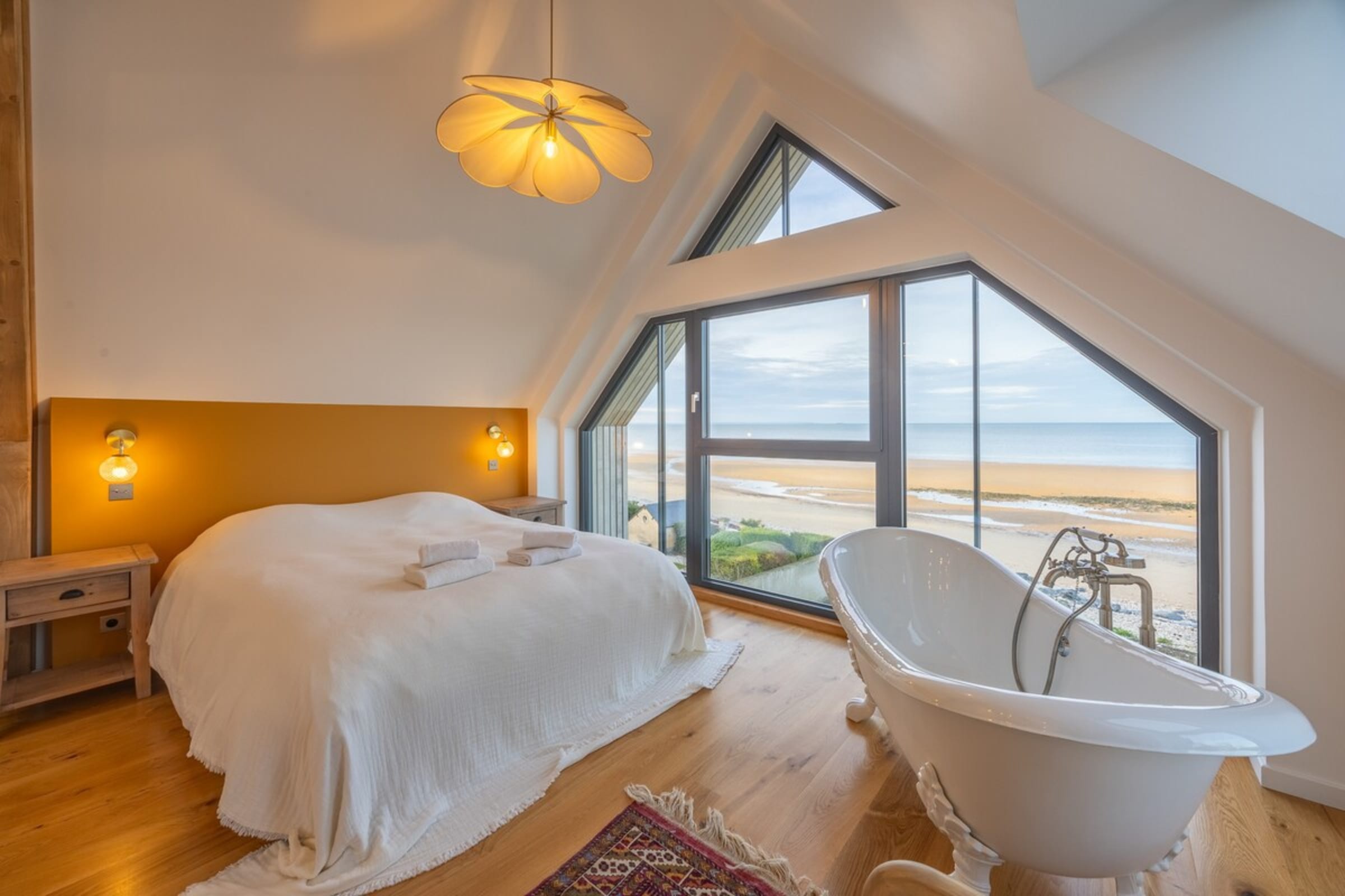 Superb architect’s house on the seafront. This beautiful set will delight you by its geographical location and the sea view it offers. Composed of an old part entirely redone for the night part, and a new extension grouping the kitchen open to the living room & dining room. This part has large windows opening sea side but also on the private garden.