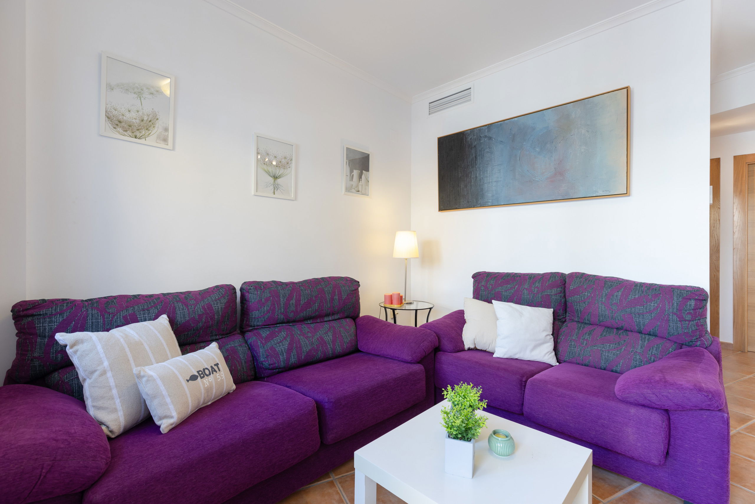 The living room is a bright and relaxing space, decorated with modern furniture and coastal touches. Here you can relax after a day of exploring on the comfortable sofas or enjoy a movie on the flat screen. Sliding glass doors give access to the terrace, where you can enjoy the views and fresh air.