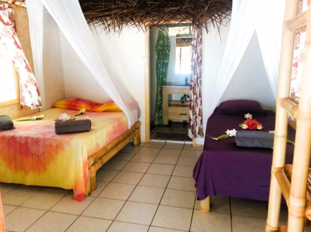 In front of the bungalow, you will have your small private terrace with a view of the beach and the lagoon, a few steps away, a Fare potee awaits you as well as sun loungers to relax in the sun and make the most of this exceptional place. At the back of the bungalow, you will find everything to spend good moments: kayak, paddle, bicycles, ping pong table, snorkelling equipment... in the garden adorning the bungalows, a children's playground is freely accessible.