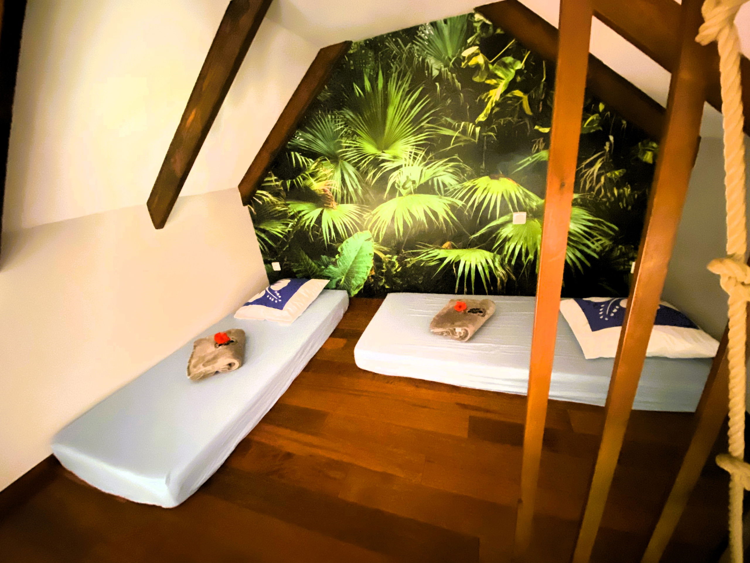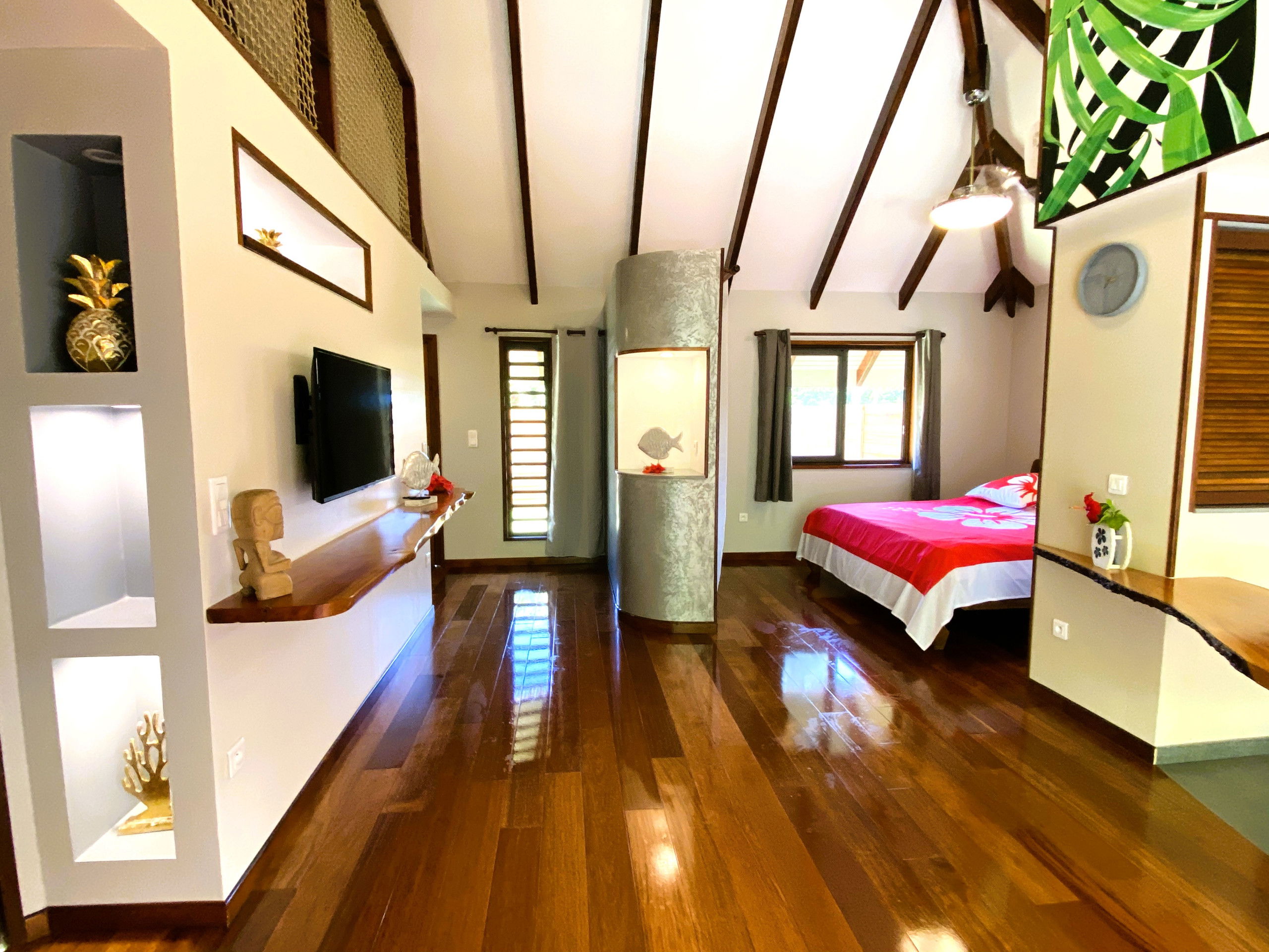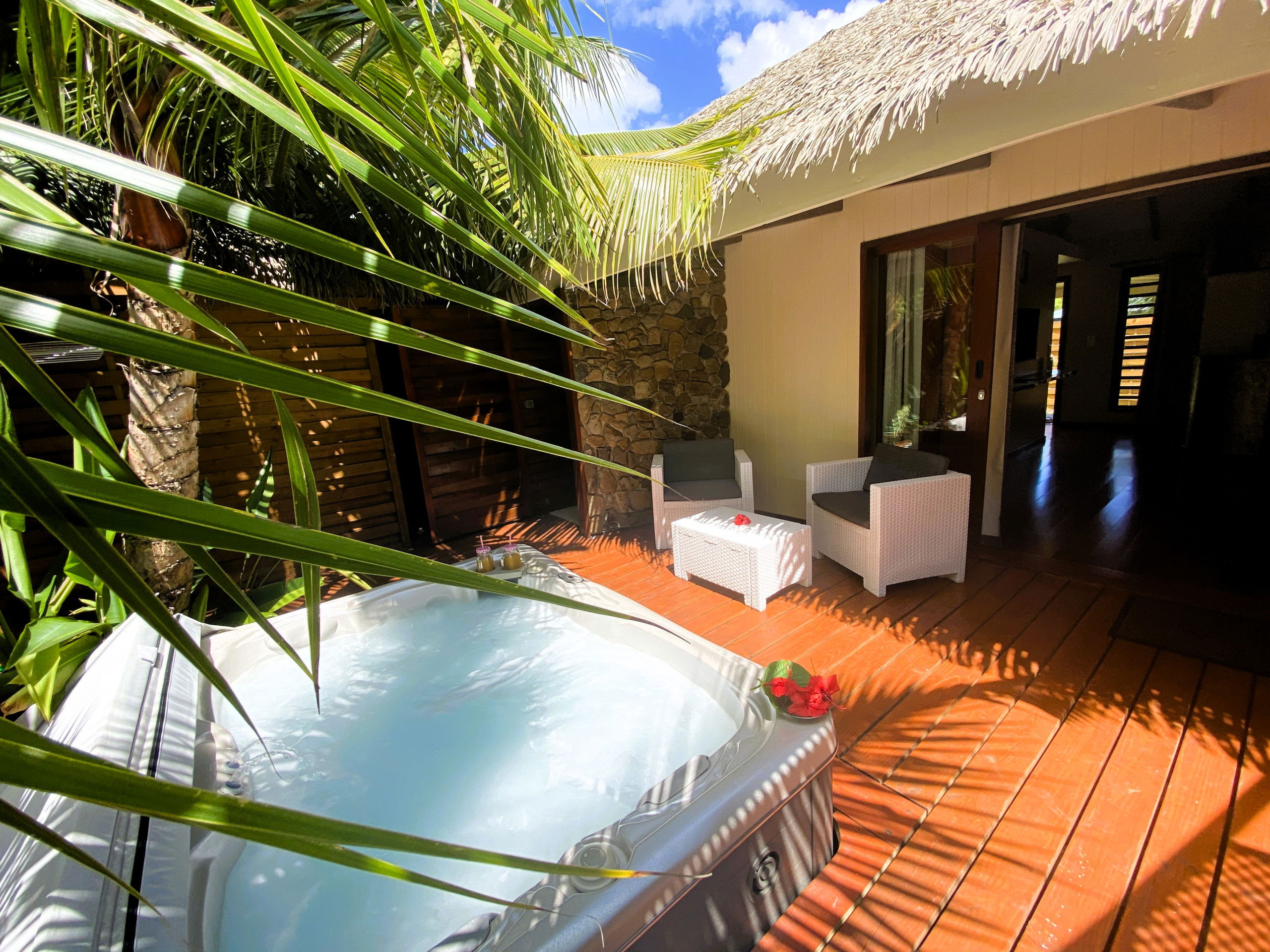 The main attraction, however, is the outdoor deck, where your private Jacuzzi is enthroned. This divine space, surrounded by exotic greenery, will quickly become your favourite retreat. Soak in the soothing waters of the Jacuzzi while enjoying the serene atmosphere, creating unforgettable memories in this Polynesian Garden of Eden.