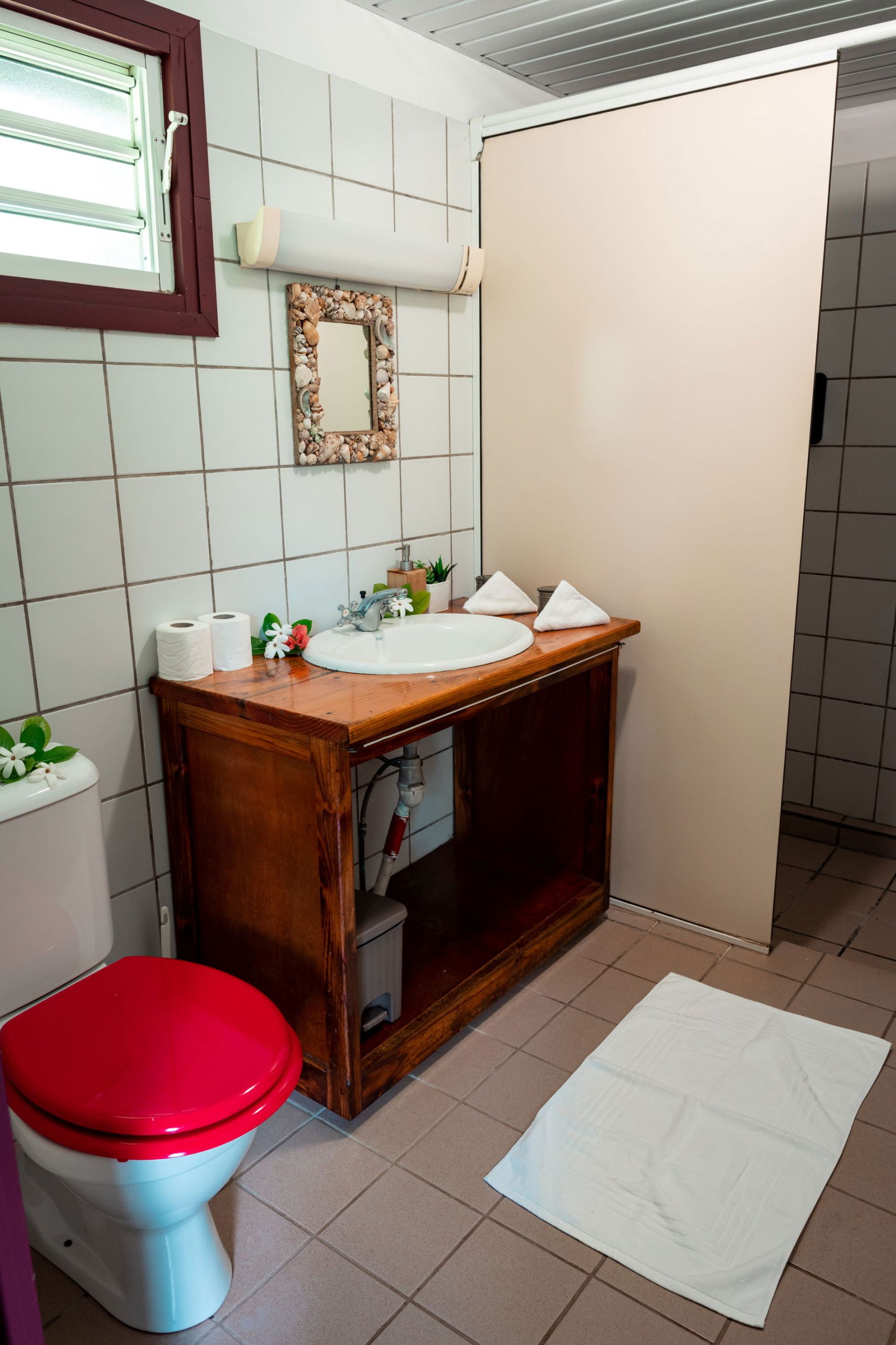 Discover the authentic charm of Polynesia in our comfortable bungalow sleeping up to 3 people. The Fare Tiare offers you a warm living space, with a queen-size bed and a single bed, perfect for a restful sleep under the gentle trade winds. The bathroom includes a walk-in shower with hot water, WC, washbasin and mirror, ensuring your comfort throughout your stay.