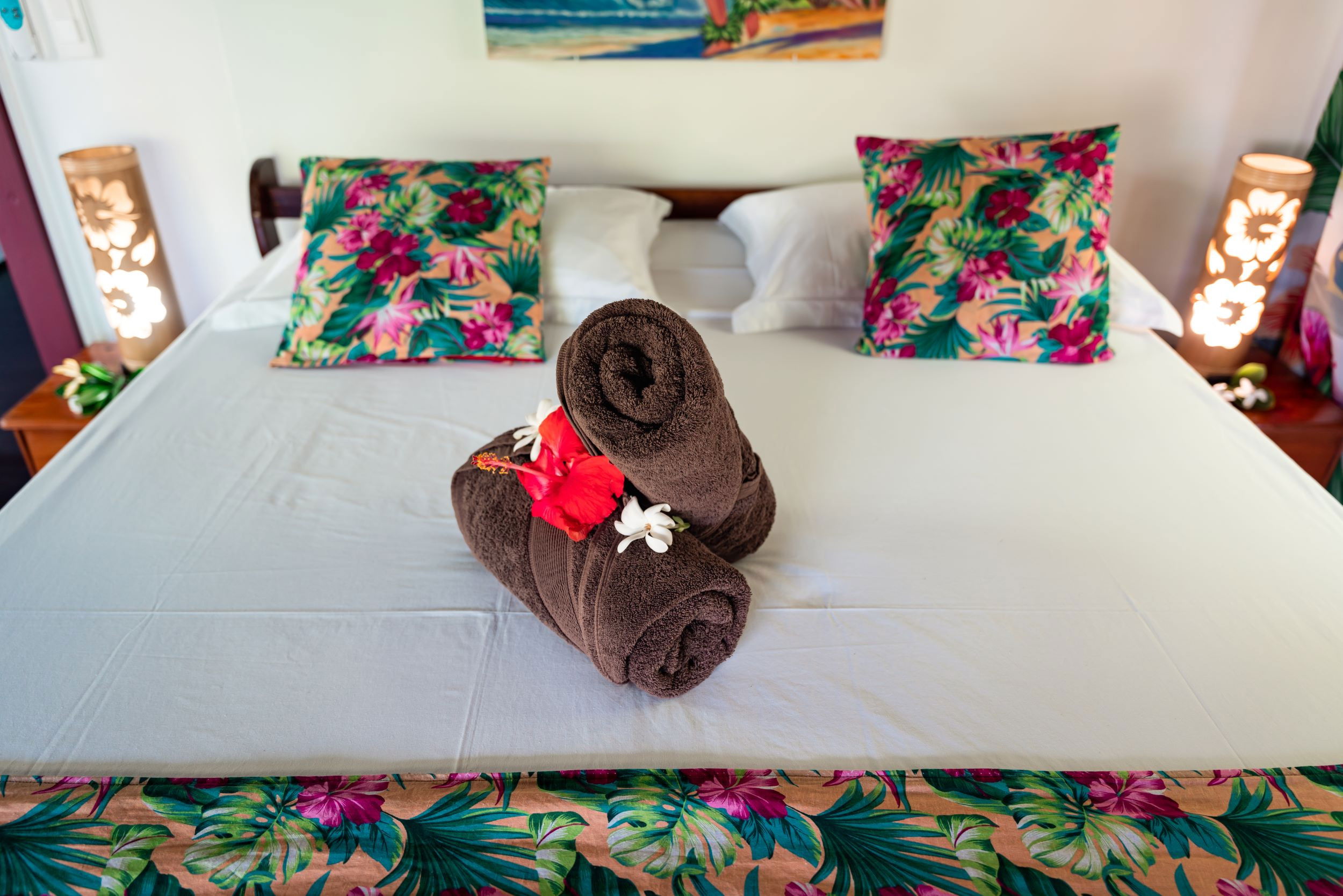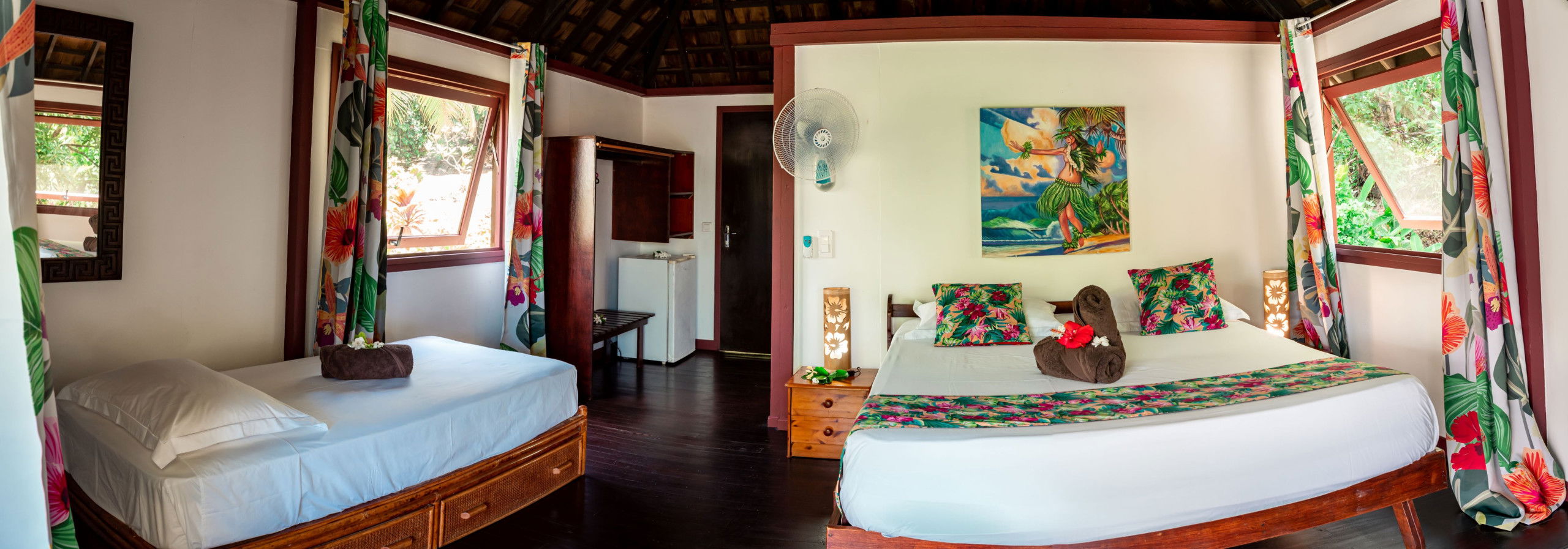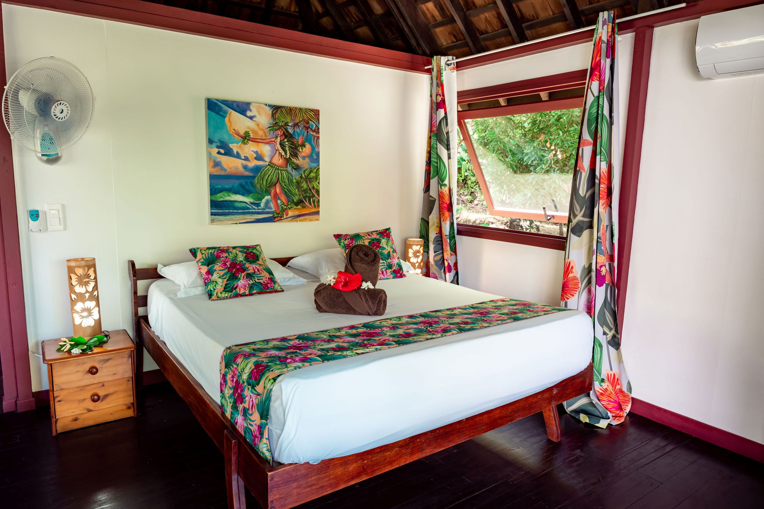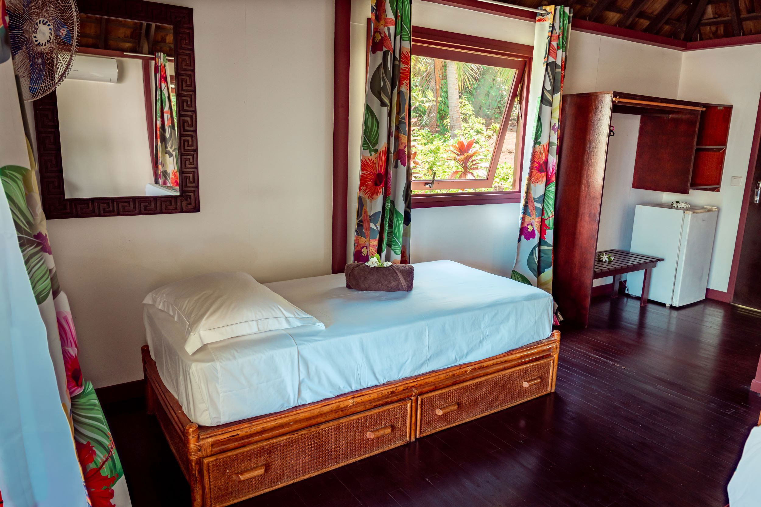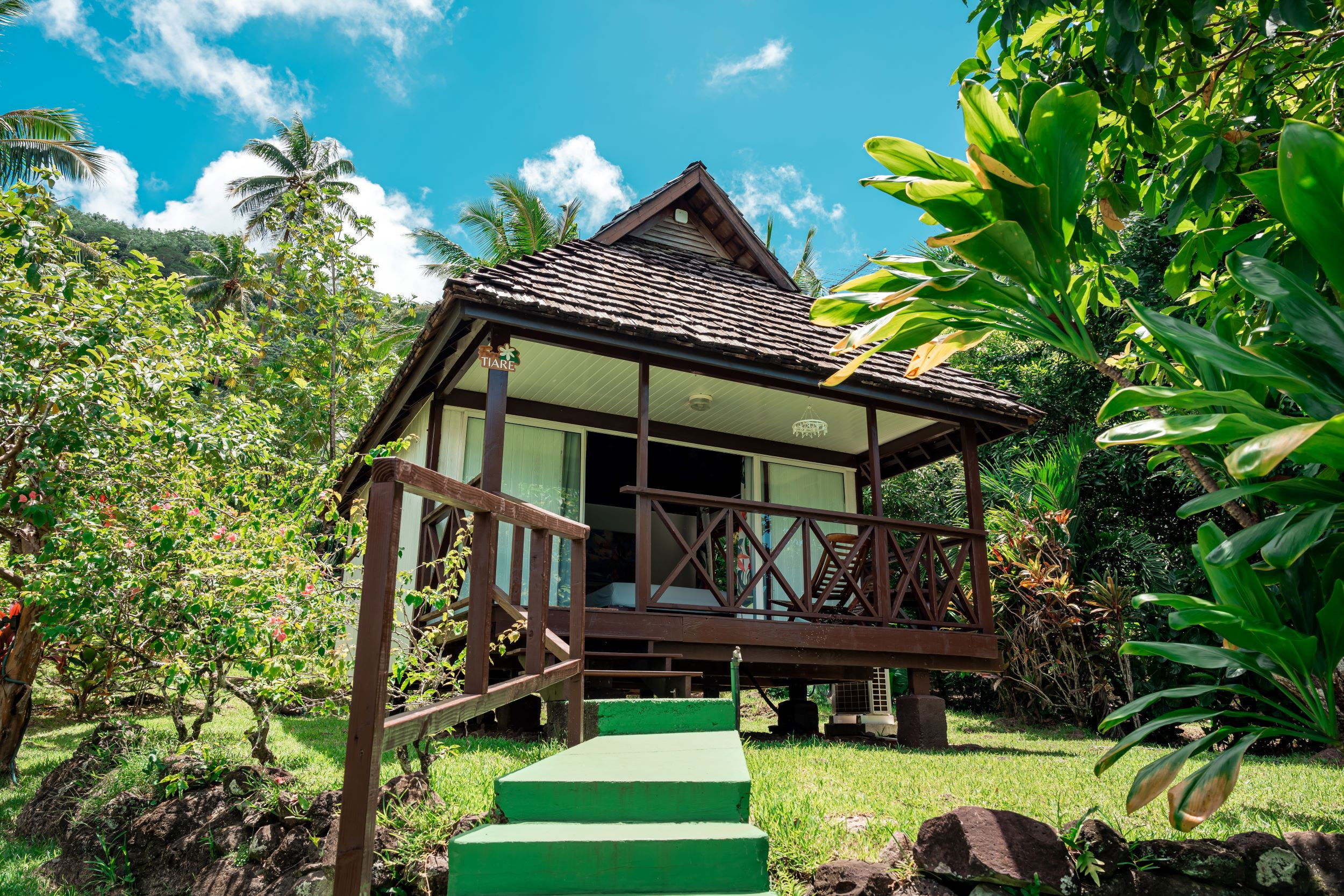 The interior of the Fare Tiare is decorated with care, reflecting the bright colours and traditional motifs of the islands, instantly immersing you in an exotic and soothing atmosphere. A fan is also available to ensure your comfort on the hottest days.