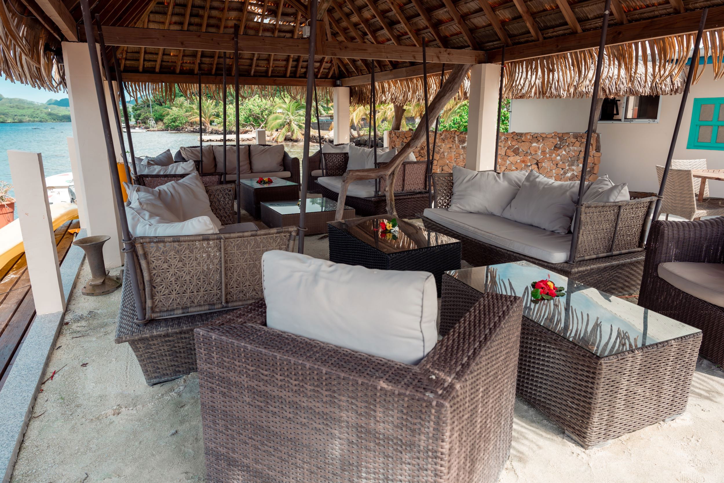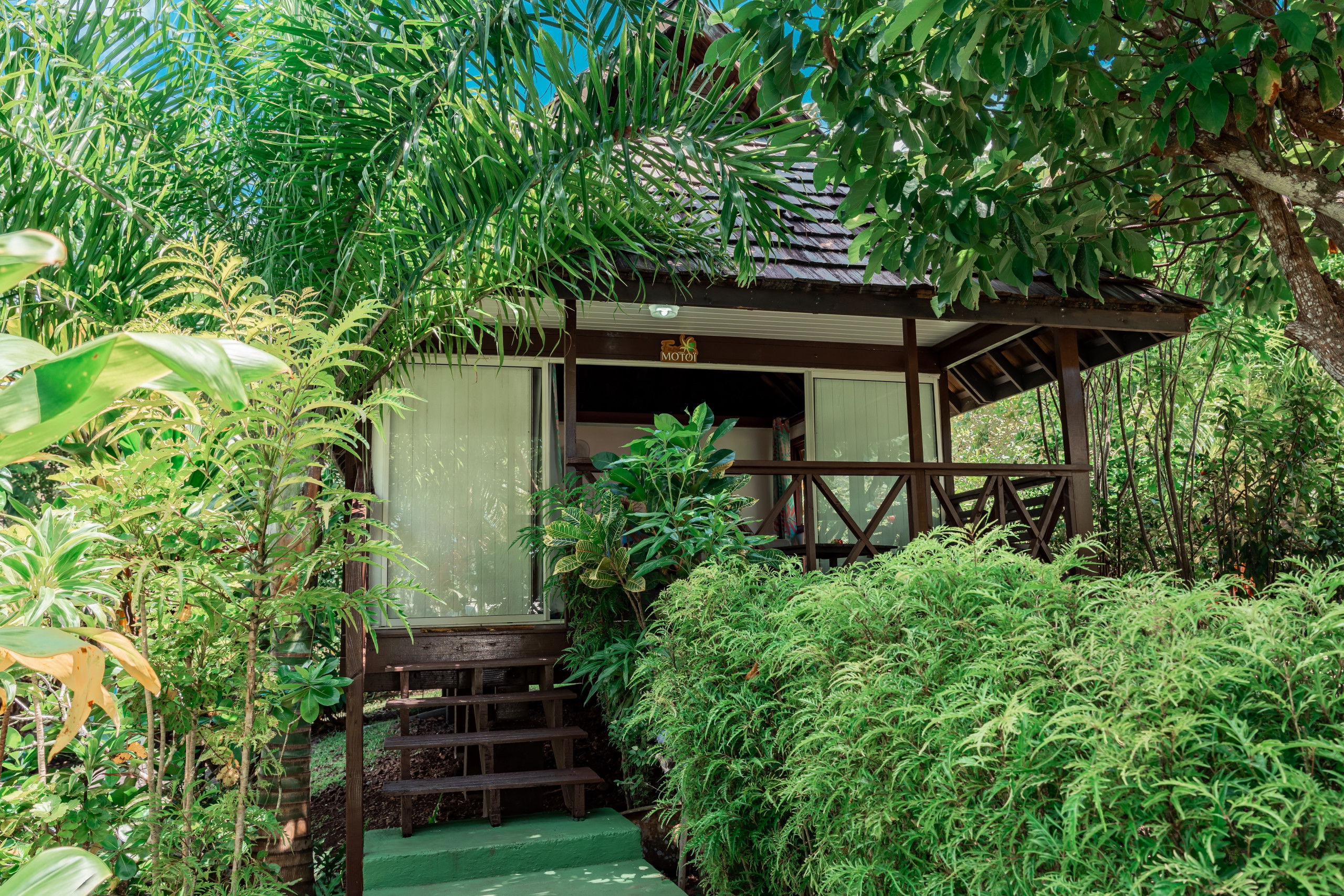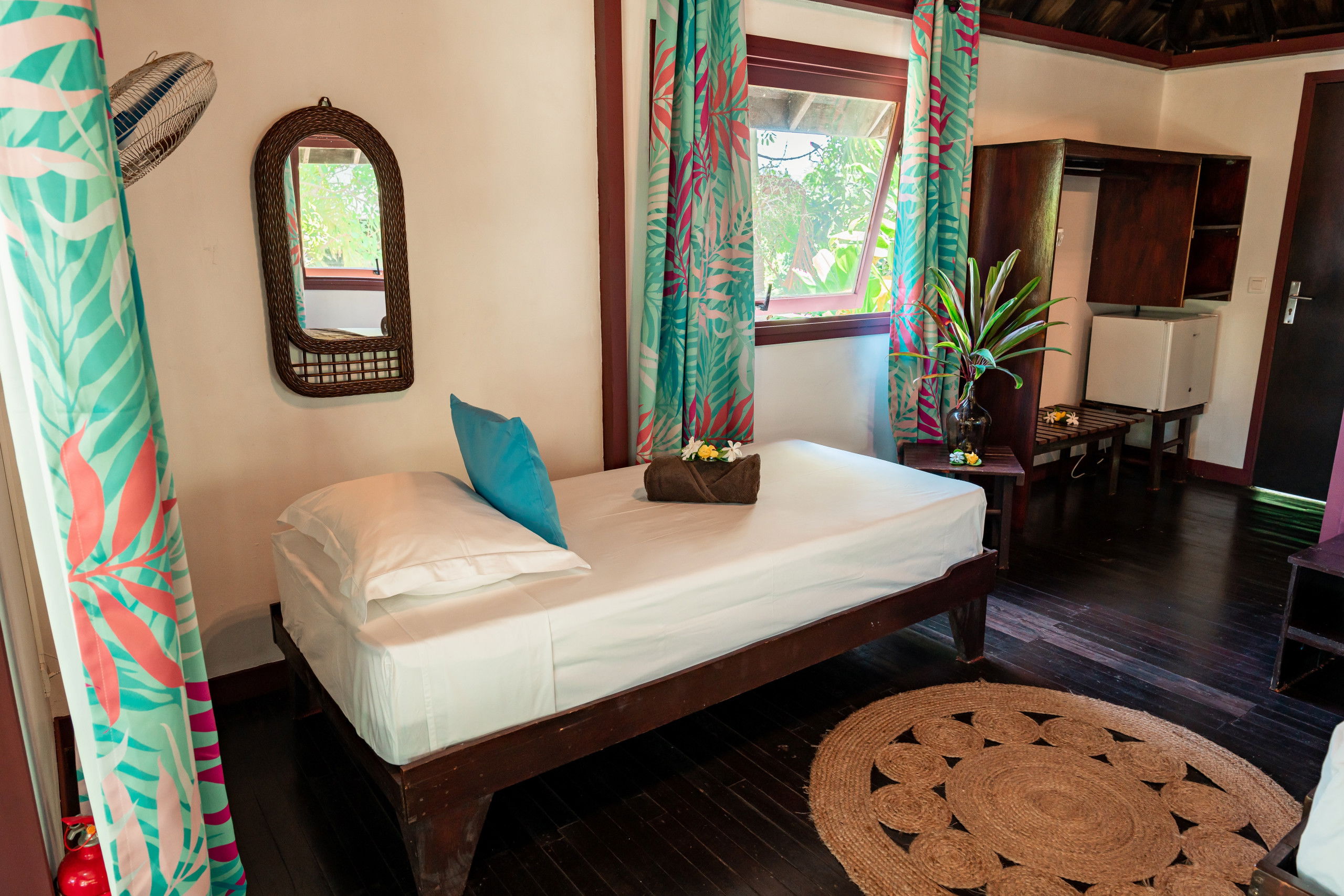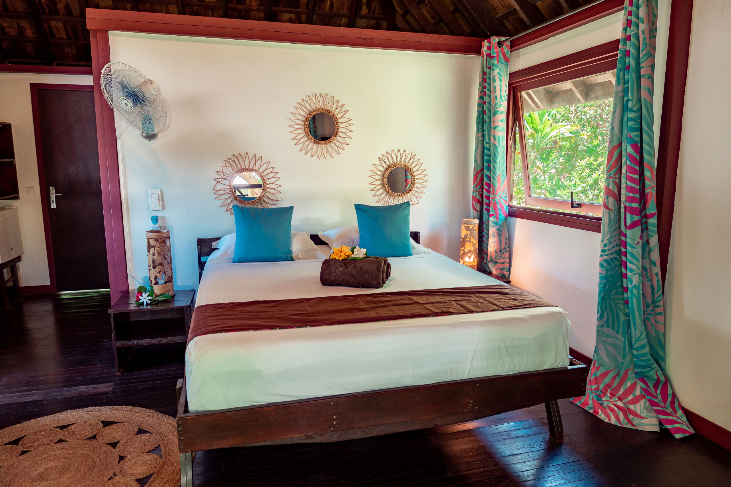The interior of the Fare Motoï is decorated with care, reflecting the bright colours and traditional motifs of the islands, instantly immersing you in an exotic and soothing atmosphere. A fan is also available to ensure your comfort on the hottest days.