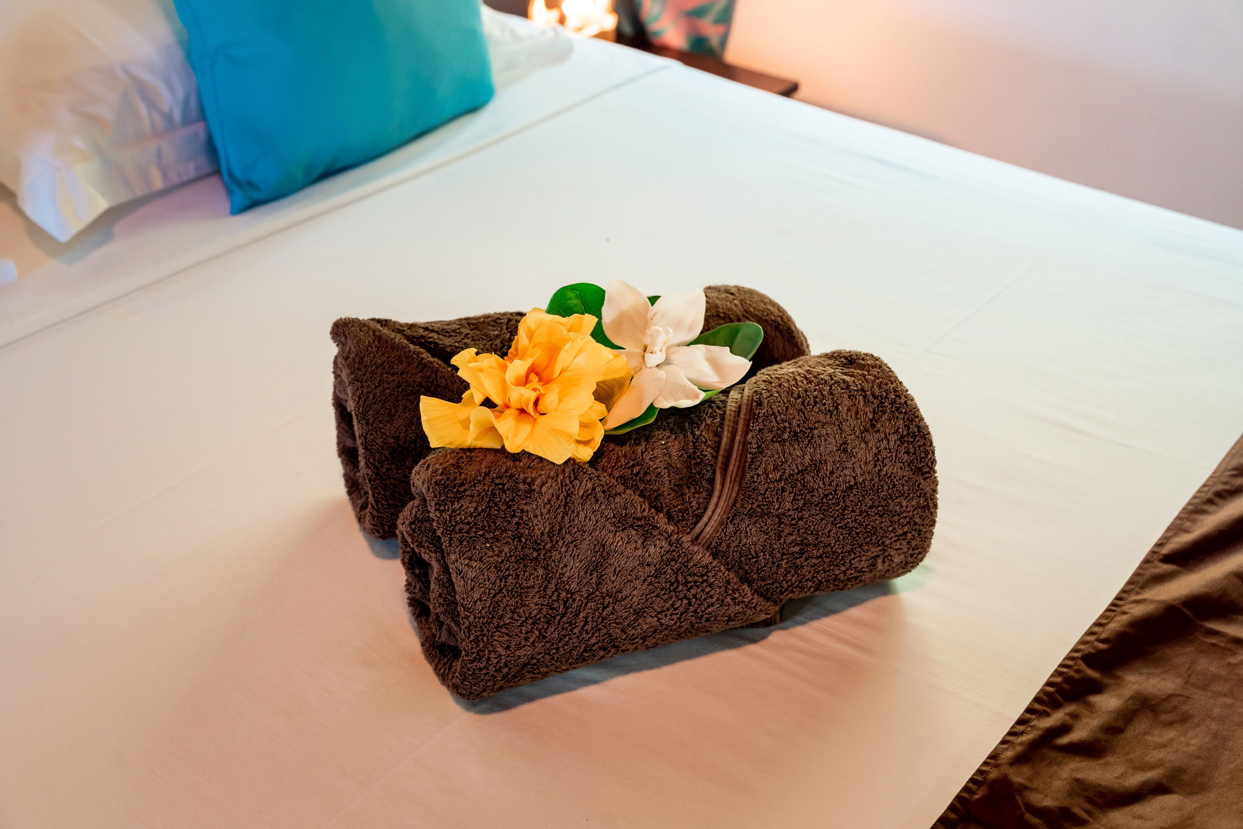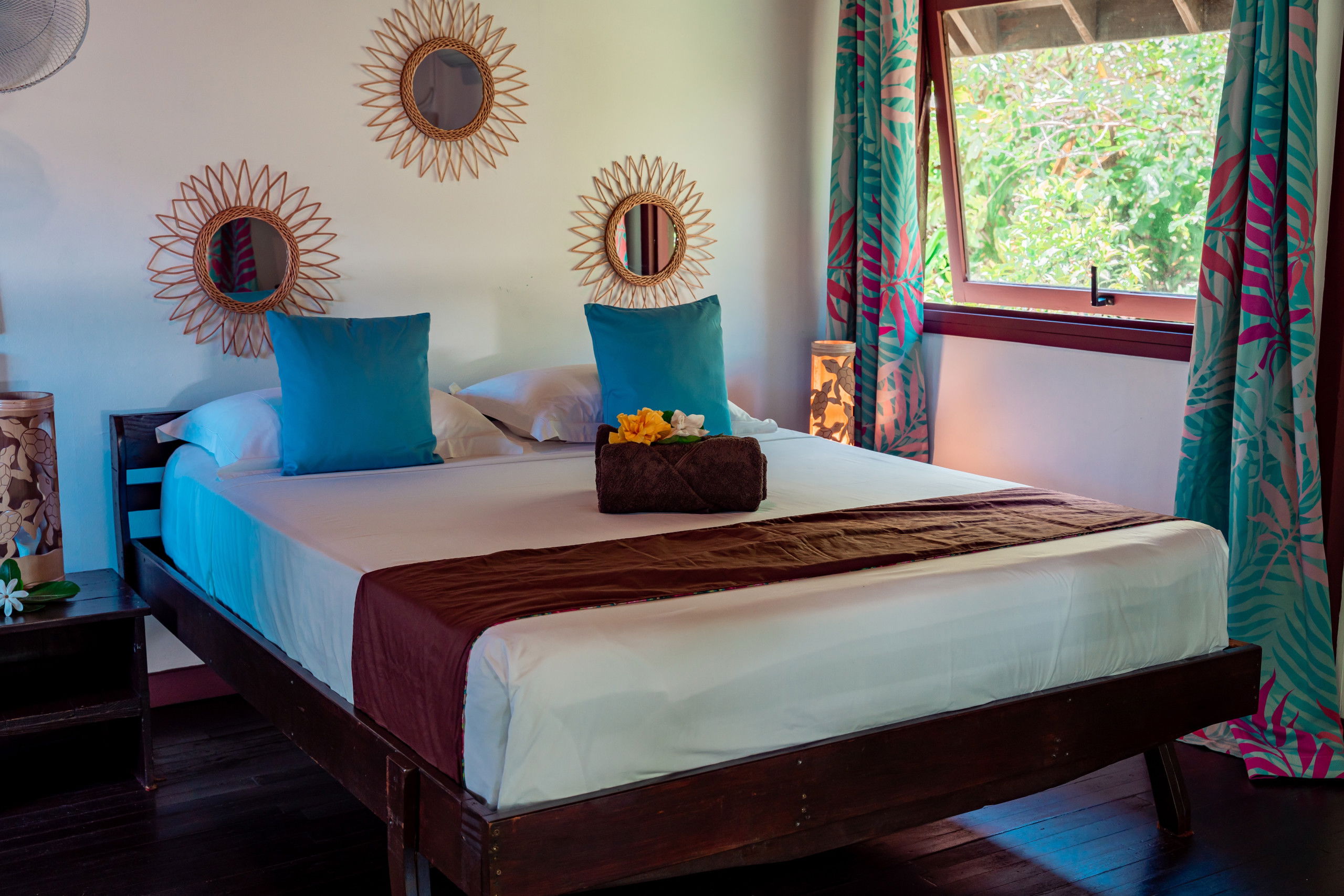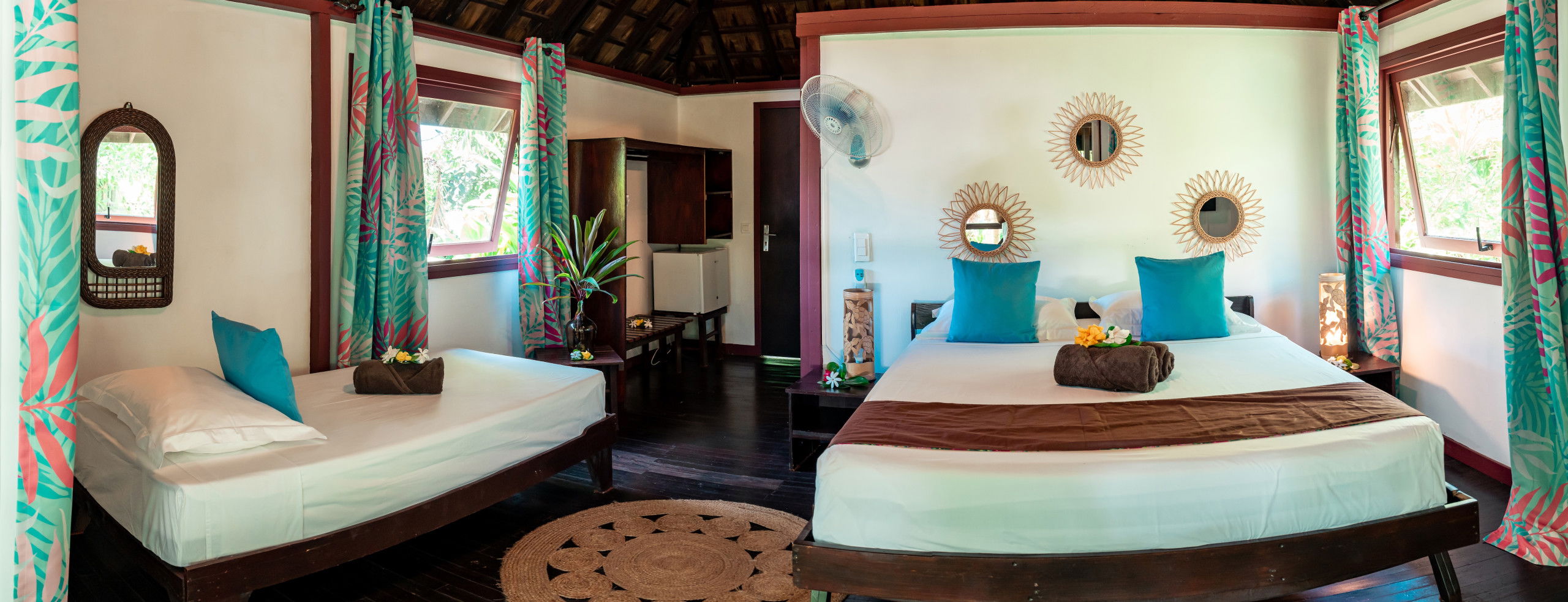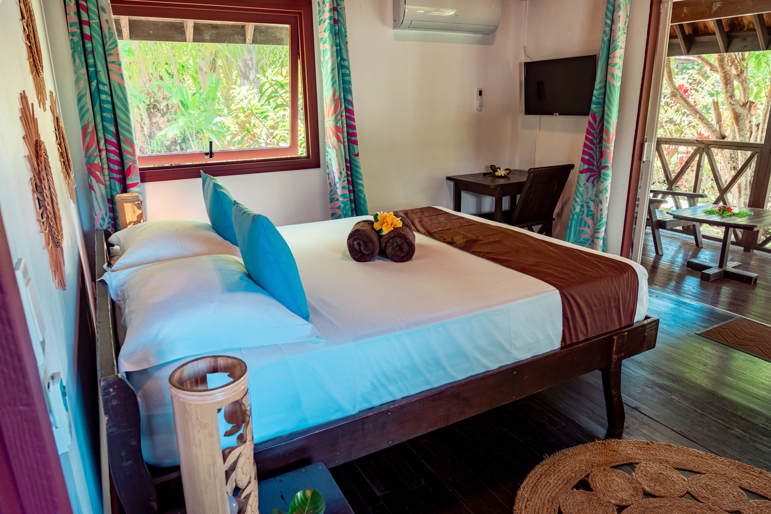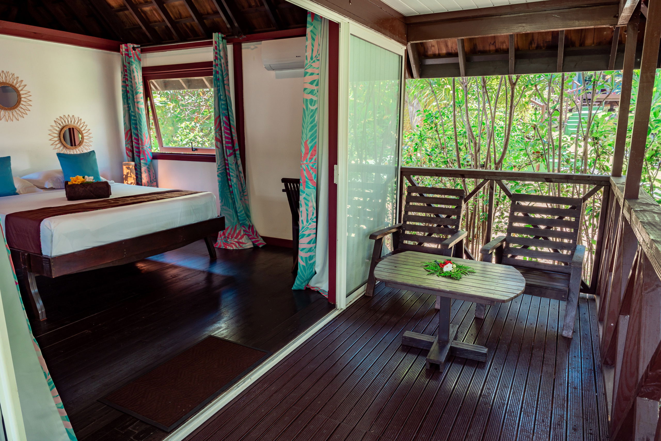 The interior of the Fare Motoï is decorated with care, reflecting the bright colours and traditional motifs of the islands, instantly immersing you in an exotic and soothing atmosphere. A fan is also available to ensure your comfort on the hottest days.
