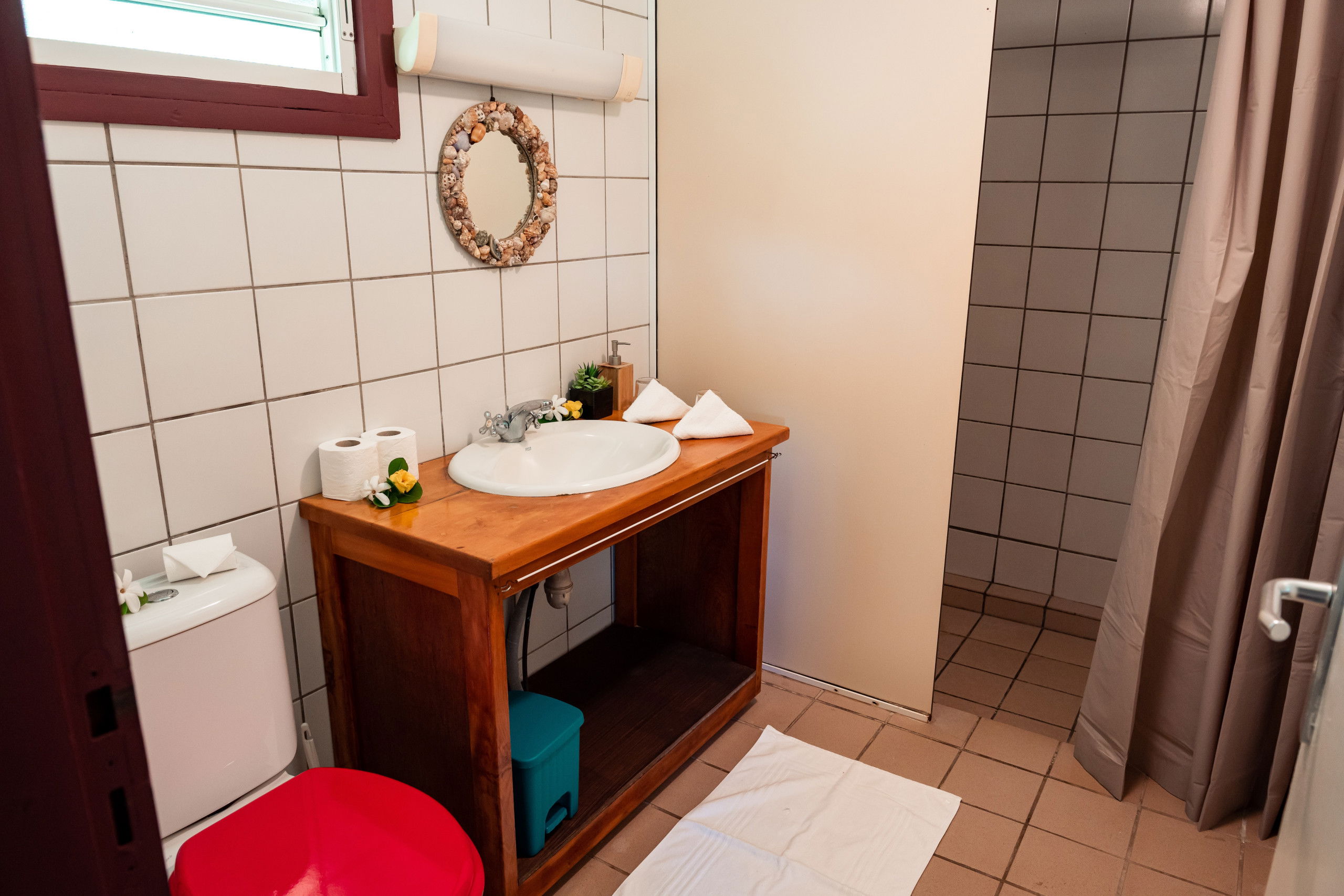 Discover the authentic charm of Polynesia in our comfortable bungalow sleeping up to 3 people. The Fare Motoï offers you a warm living space, with a queen-size bed and a single bed, perfect for a restful sleep under the gentle trade winds. The bathroom includes a walk-in shower with hot water, WC, washbasin and mirror, ensuring your comfort throughout your stay.