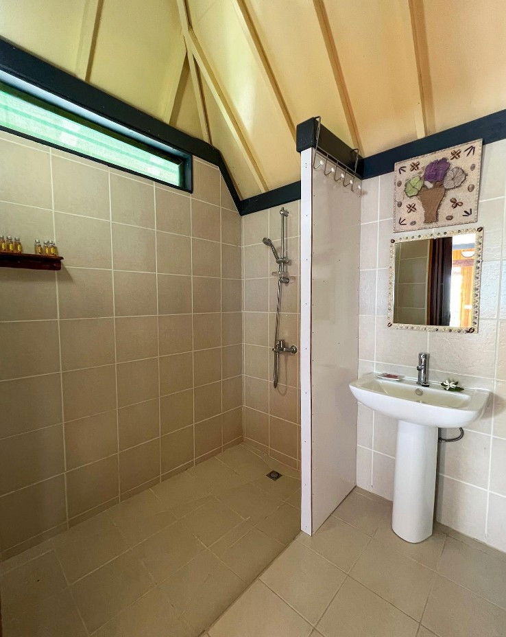 The ground floor of the bungalow consists of a bedroom, with two double beds and a single bed, able to accommodate 5 people, an air blower, and a storage space for your personal belongings. It also has a private bathroom, with a washbasin, shower with hot water, and a toilet.