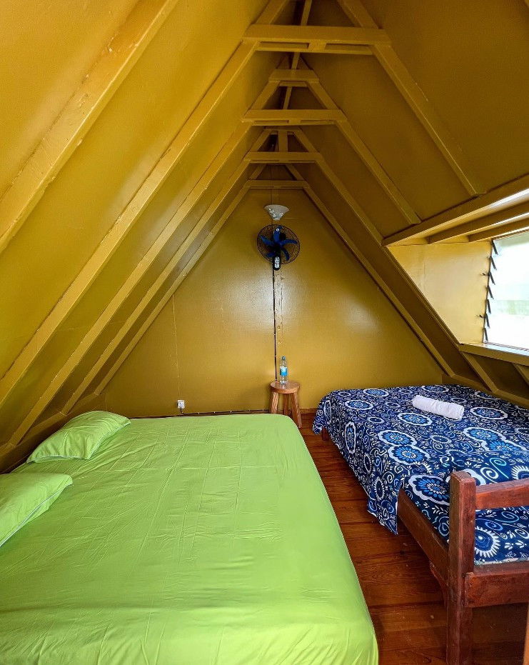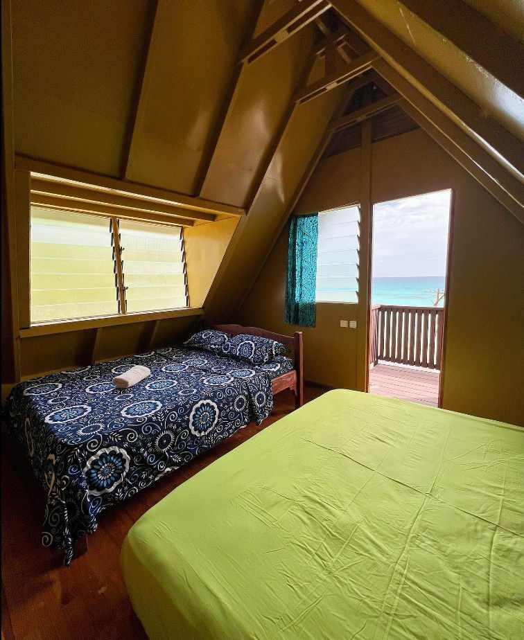 Upstairs, you will find a second bedroom, the staircase to access it is located in front of the terrace. It is composed of two double beds and a fan.