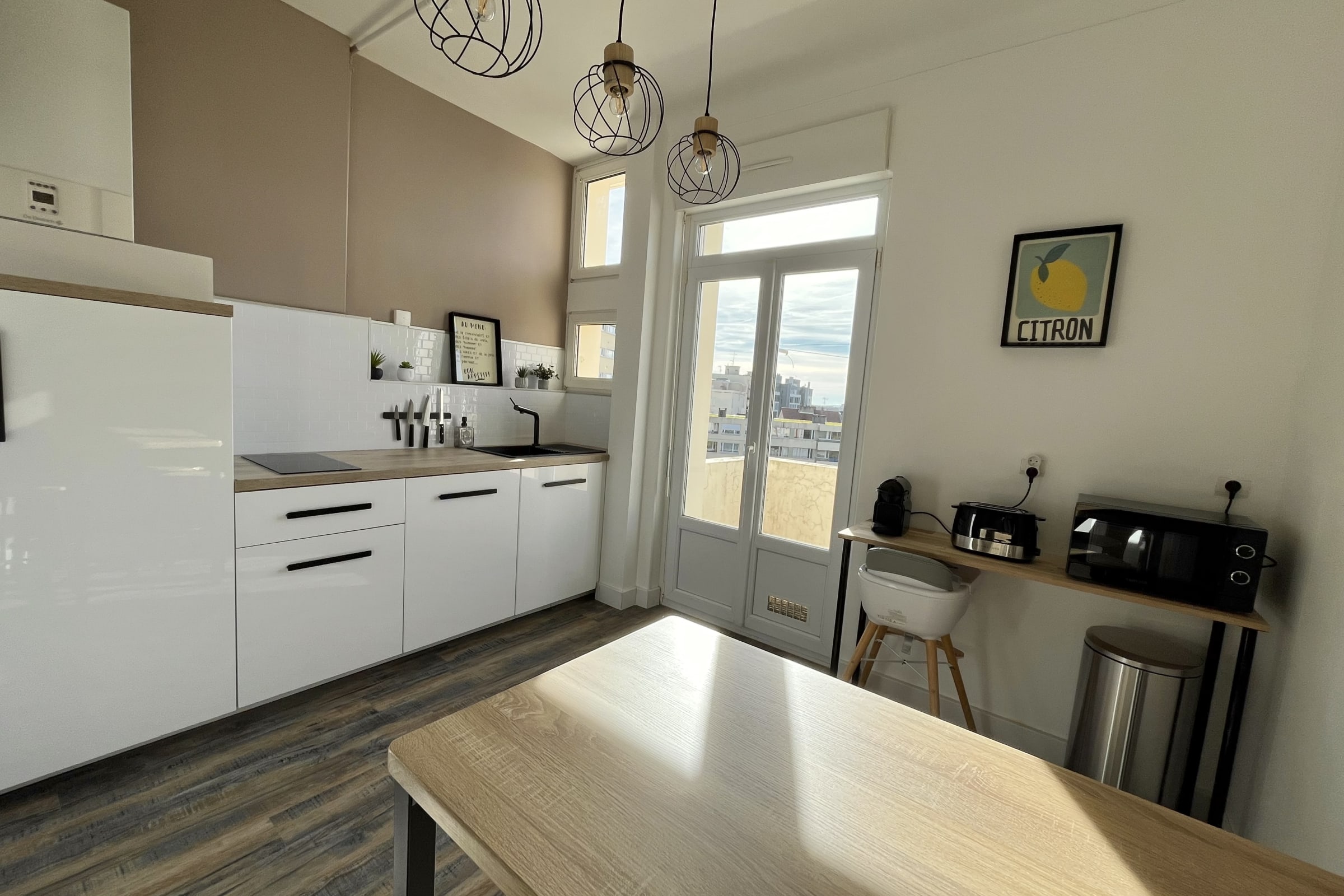 It is a through-apartment with two balconies accessible from the kitchen and the living room, ideal for enjoying fresh air and natural light.