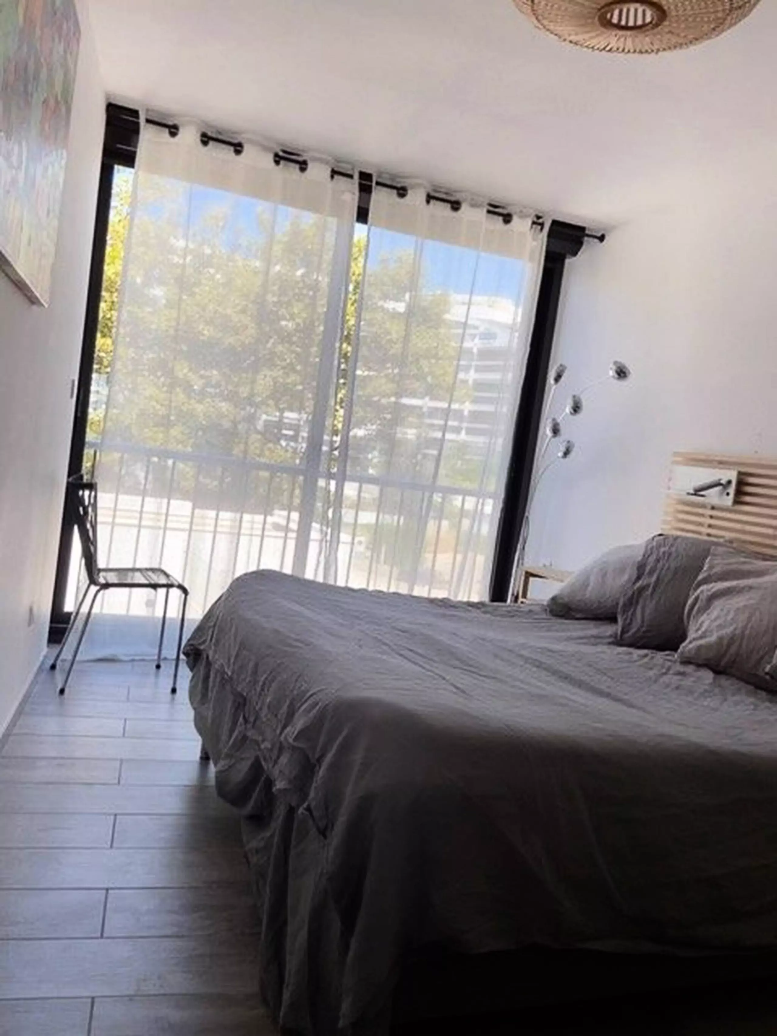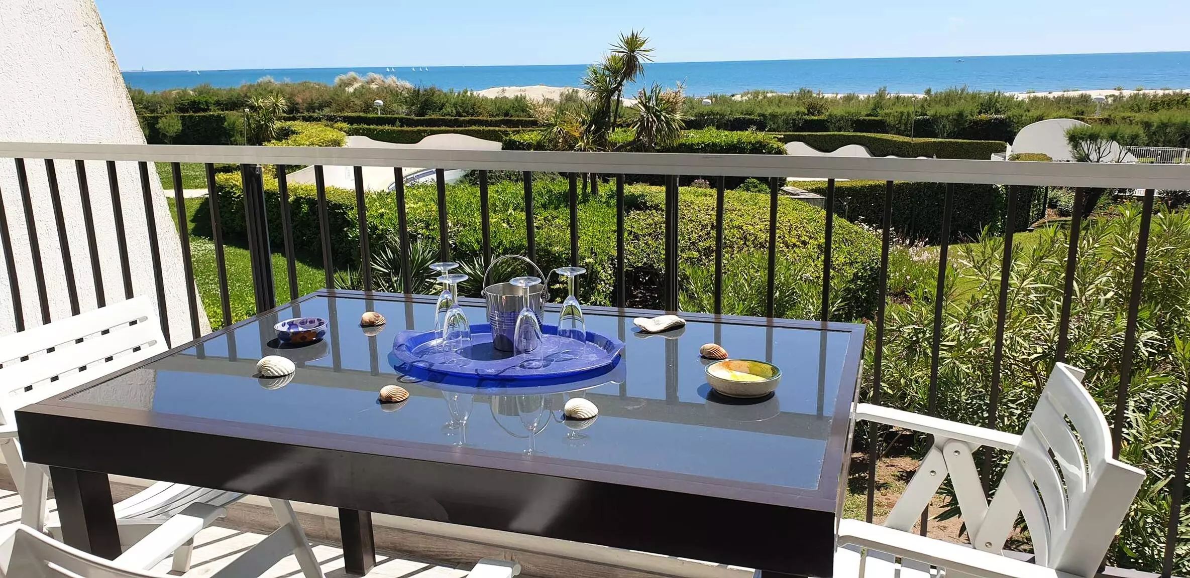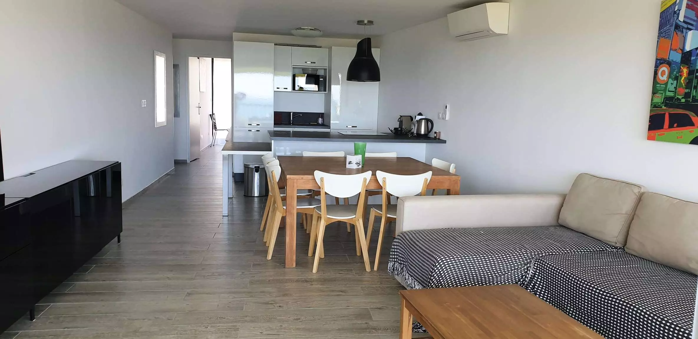 The apartment comprises an entrance hall, a beautiful fully equipped open-plan kitchen/living room, a dining area, a lounge area with a sofa and television, a bedroom with bunk beds (160 x 200 cm) sleeping 2-4 people, a second bedroom with a double bed (160 x 200 cm), a bathroom with a washbasin, a walk-in shower (accessible for people with reduced mobility), and a toilet, plus a separate toilet. Free Wi-Fi, heating, and reversible air conditioning are provided. A terrace with garden furniture (table and chairs) allows you to enjoy meals overlooking the sea. The beach is accessible from the residence, offering beautiful views of the sea and the shared green space. Perfect for a family with children or a couple of friends. A superb location for a wonderful holiday. Quiet and green neighborhood. Private enclosed garage.