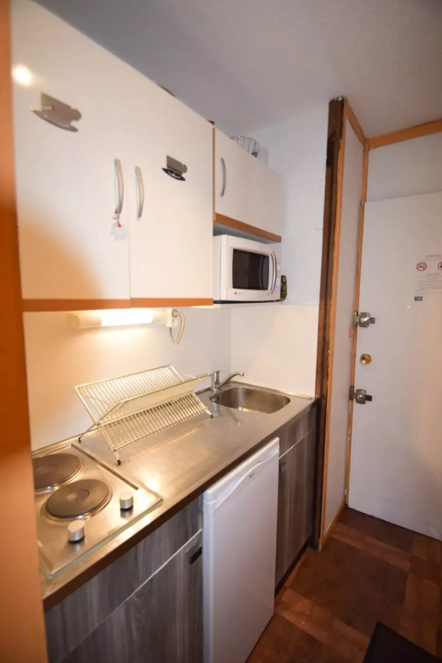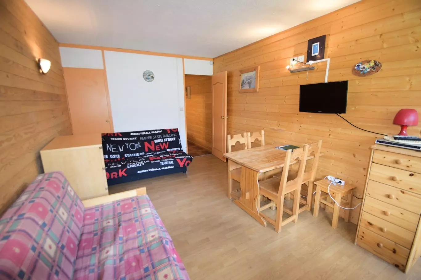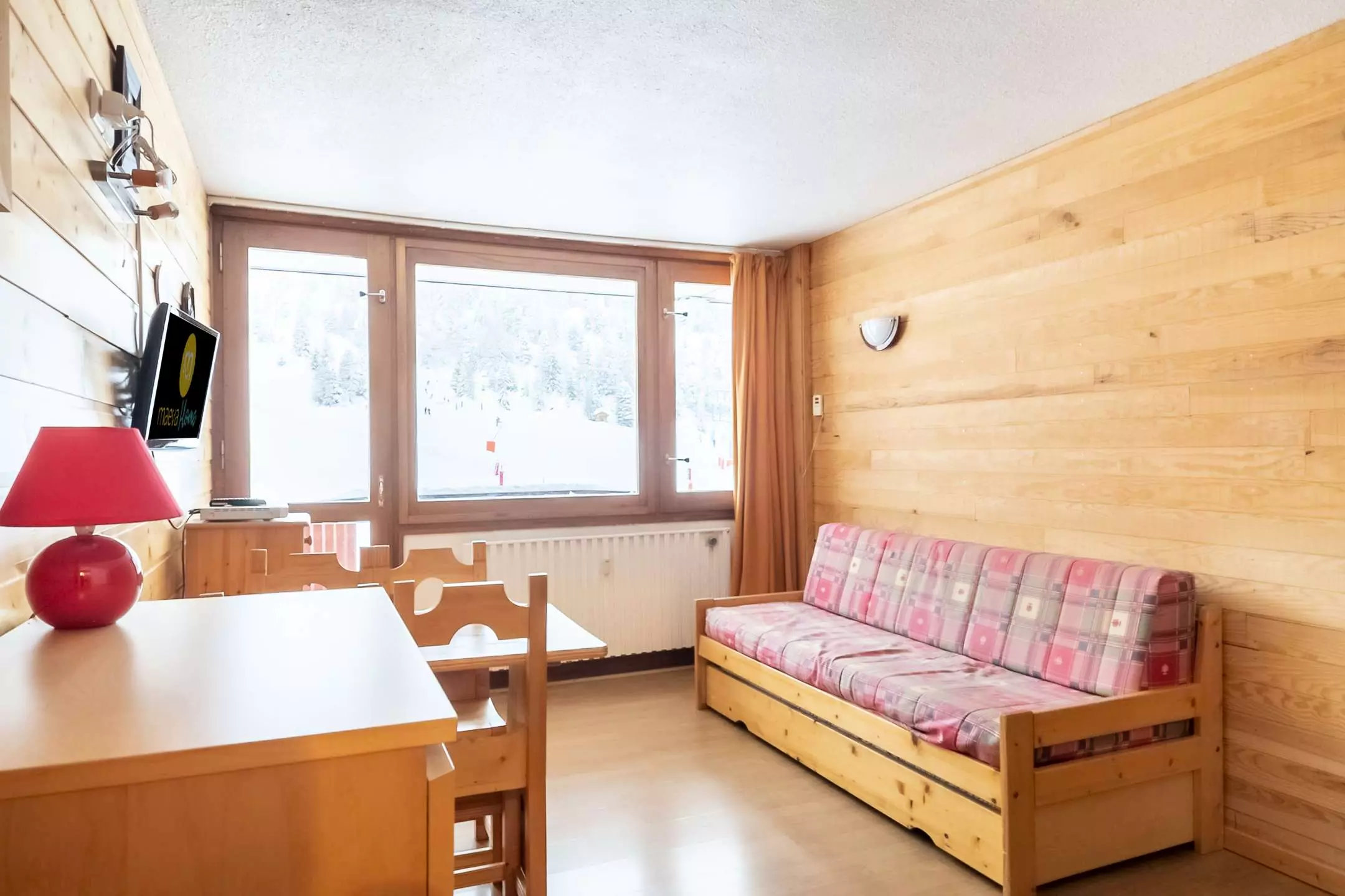 Studio apartment, 22m², sleeps 3, south-facing with balcony and slope views, on the 5th floor with elevator. Kitchen: in the entrance: 2 electric hobs, mini-oven, refrigerator, electric coffee maker. Living room: 1 double sofa bed, 1 single bed, TV. Bathroom: bathtub, WC included. Bedding: 1 double duvet and 2 single duvets. The studio offers a beautiful view of the slopes. Ski locker #527 on the Villages side, level -1. The residence is located at the foot of the slopes and is connected to shops by a covered walkway. No pets allowed and no smoking. End-of-stay cleaning, bed linen, towels, and ski passes are optional.