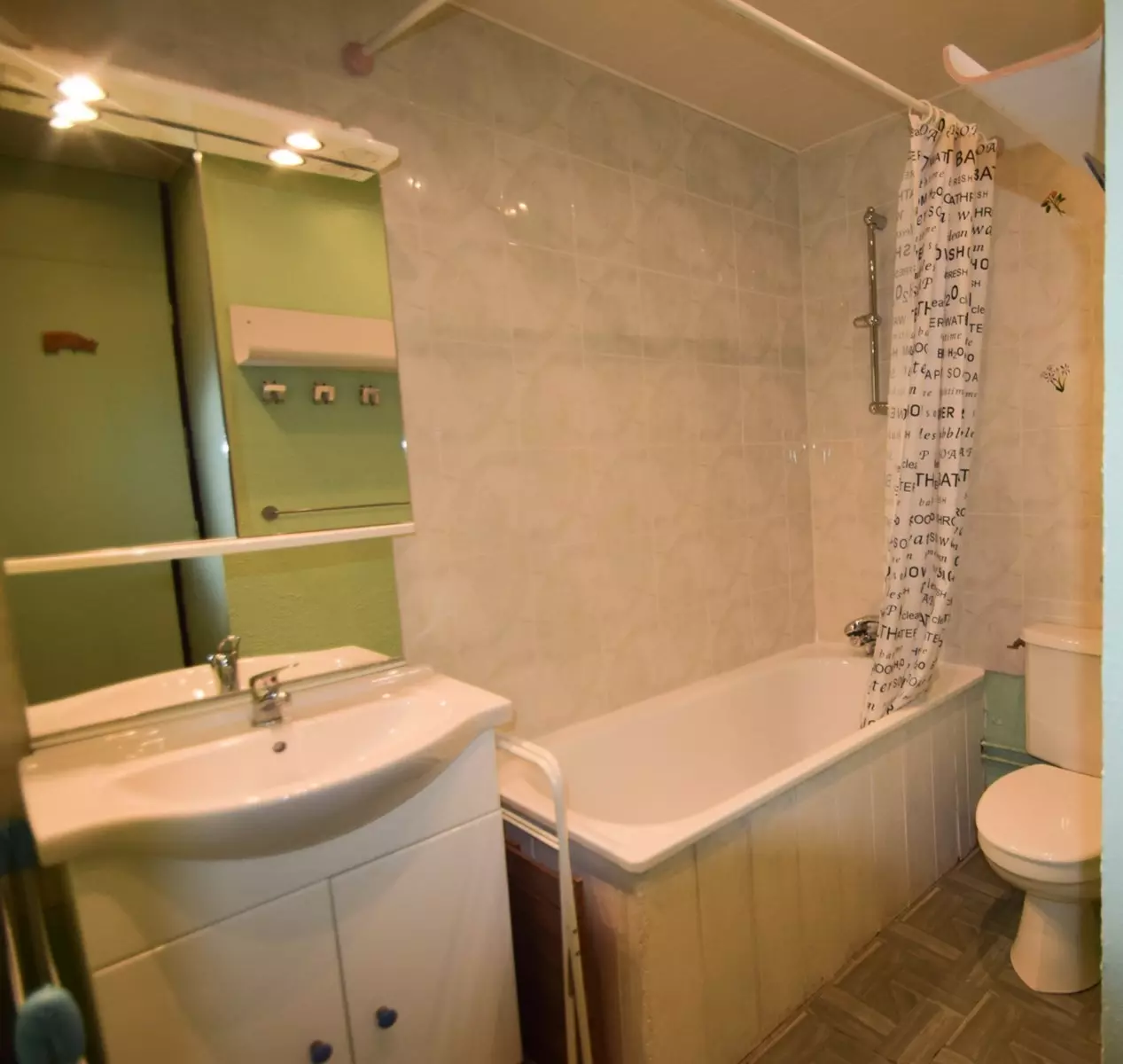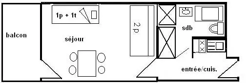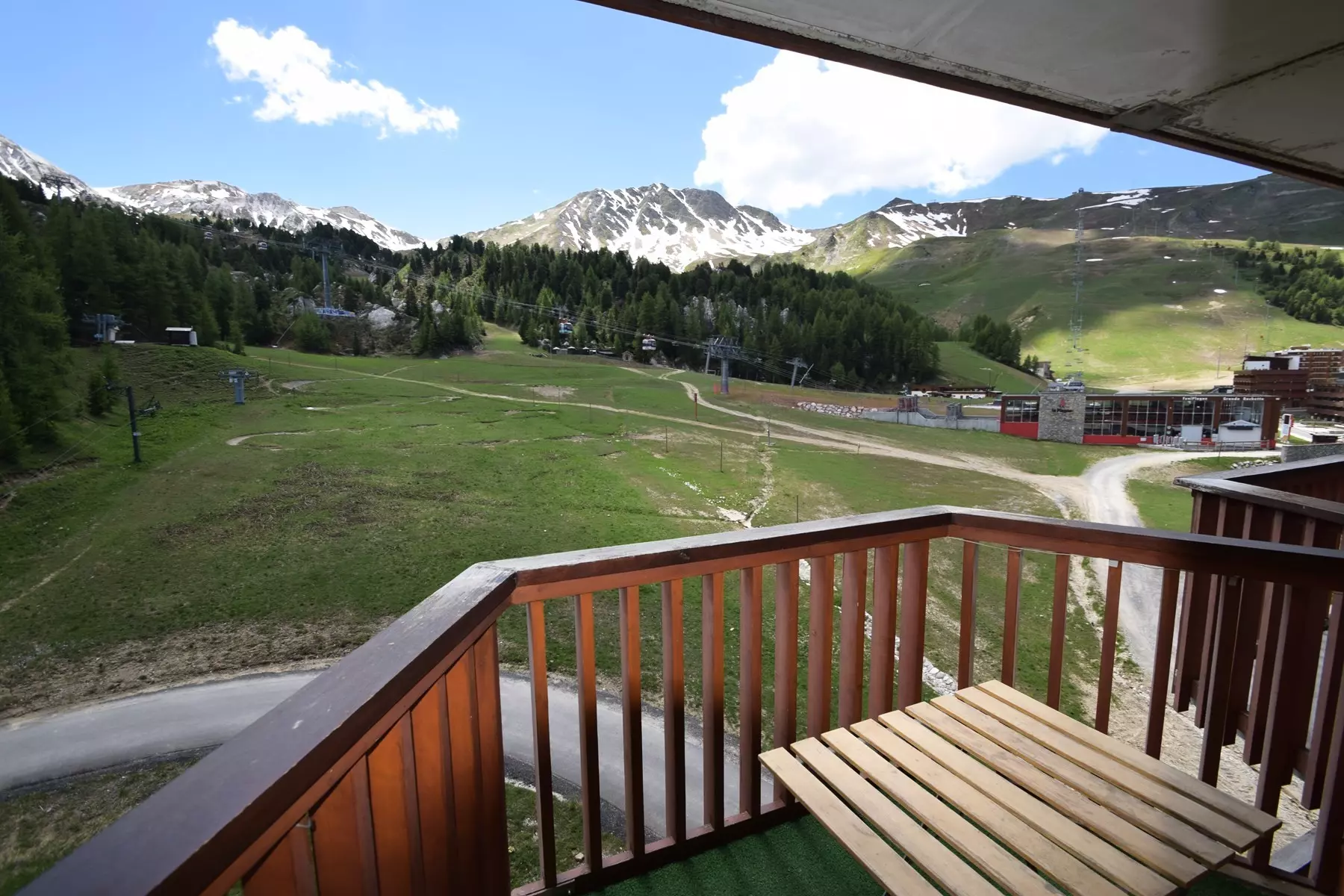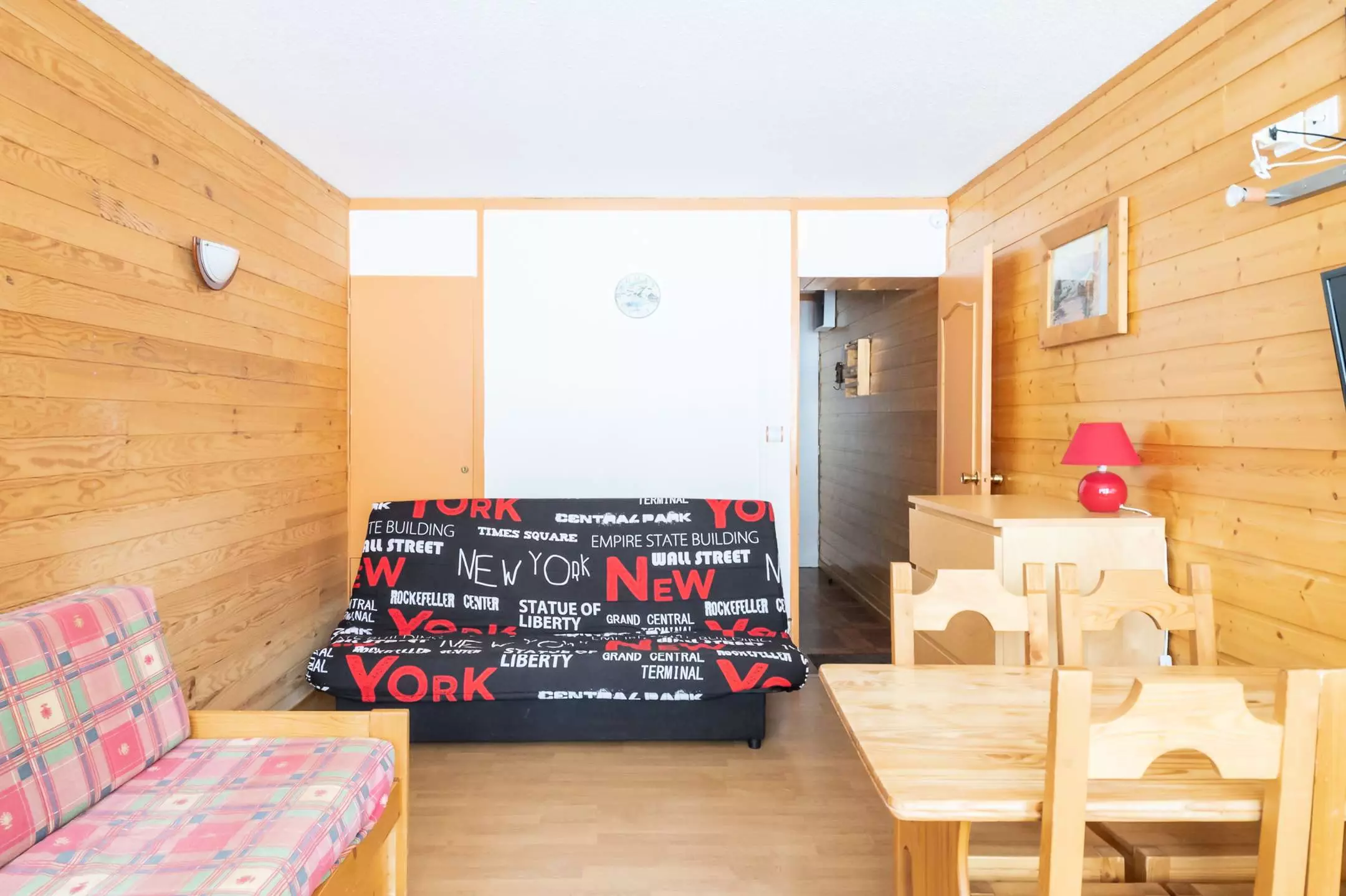 Studio apartment, 22m², sleeps 3, south-facing with balcony and slope views, on the 5th floor with elevator. Kitchen: in the entrance: 2 electric hobs, mini-oven, refrigerator, electric coffee maker. Living room: 1 double sofa bed, 1 single bed, TV. Bathroom: bathtub, WC included. Bedding: 1 double duvet and 2 single duvets. The studio offers a beautiful view of the slopes. Ski locker #527 on the Villages side, level -1. The residence is located at the foot of the slopes and is connected to shops by a covered walkway. No pets allowed and no smoking. End-of-stay cleaning, bed linen, towels, and ski passes are optional.
