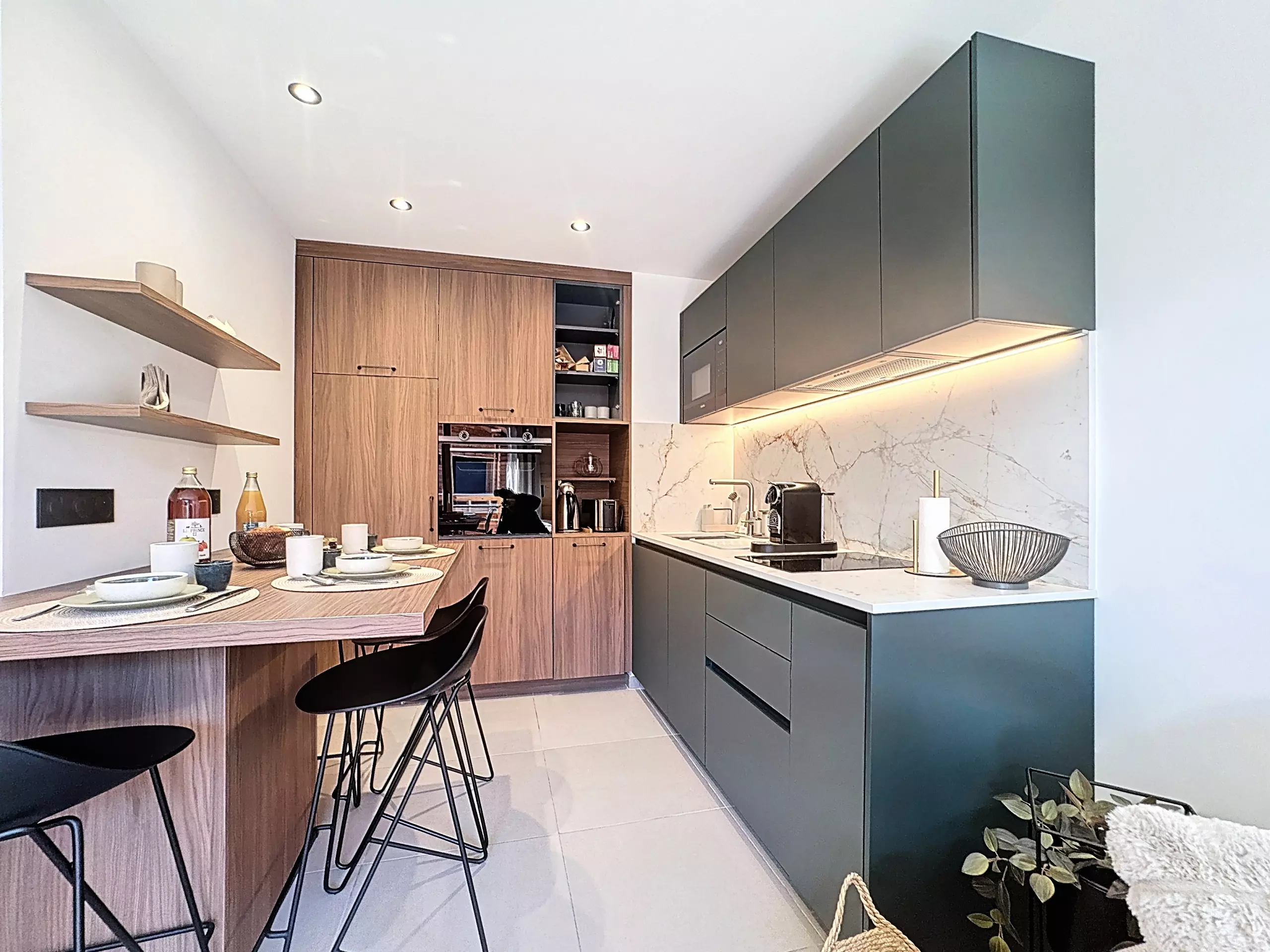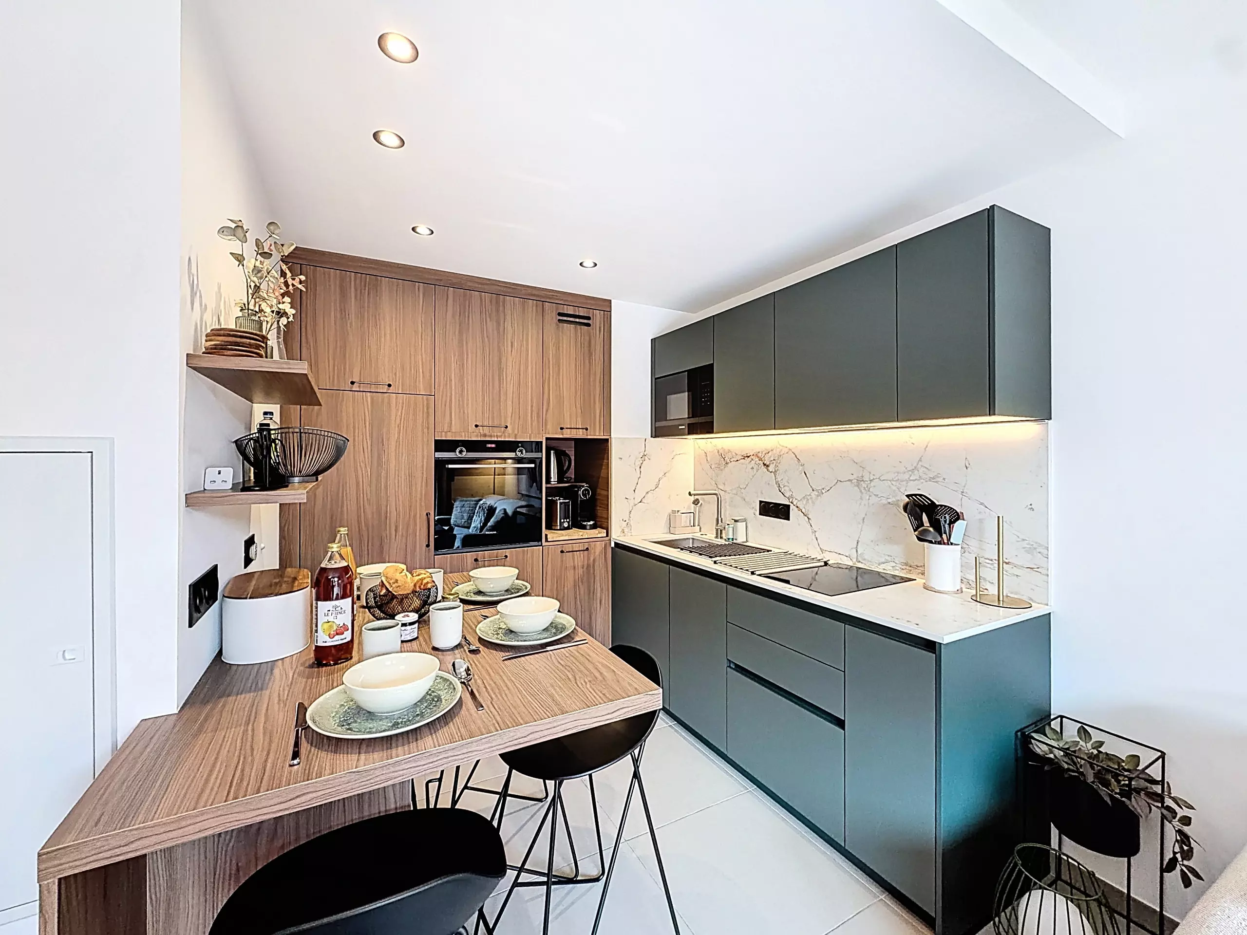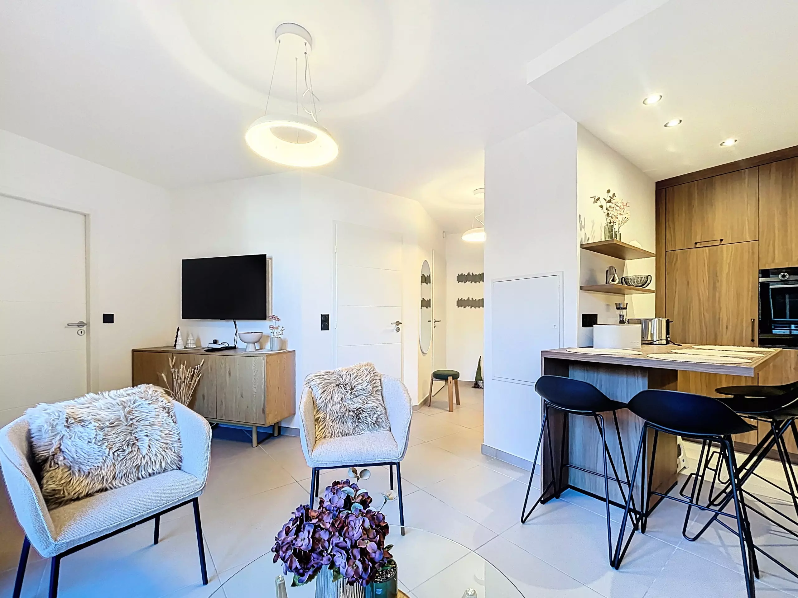The interior has been carefully designed for your comfort, with a fully equipped kitchen including a refrigerator, oven, dishwasher, Nespresso coffee machine, and all the necessary cooking utensils. You will also find a washer and dryer in the kitchen. The living area is bright and inviting, perfect for relaxing after a day of activities.