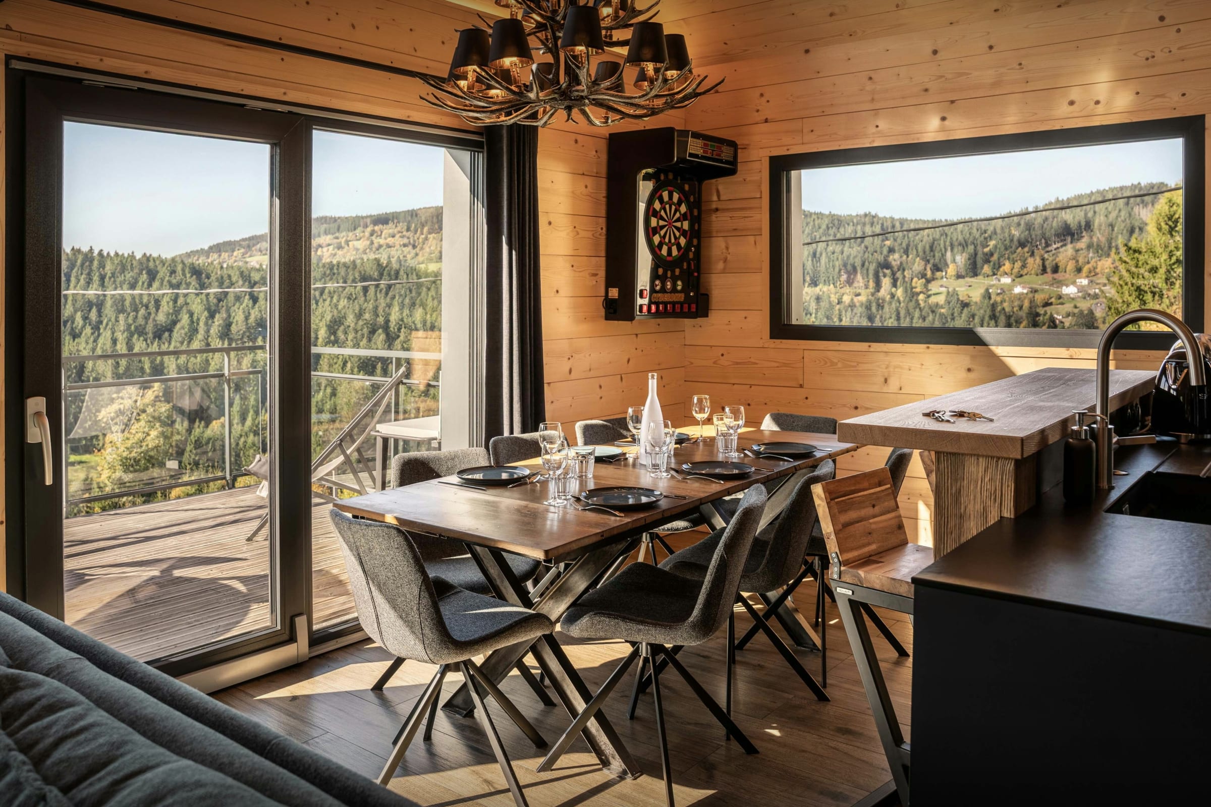 Sofas are arranged around the TV, and the modern kitchen opens onto a dining table where you can enjoy meals together. In good weather, you might choose to eat on the terrace, where a second table allows you to enjoy the Vosges landscape.