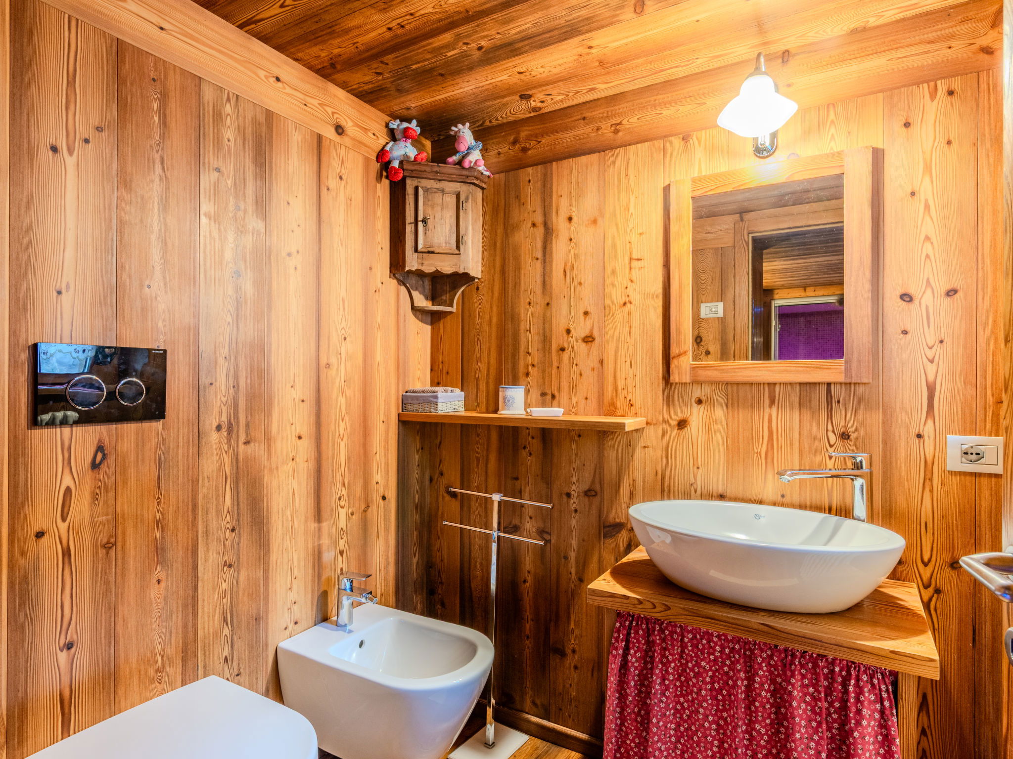 Bresimo: Cosy, rustic rustic chalet "Maset Pozzati", 3 storeys, surrounded by trees and meadows. In the district of Bagni, in a secluded, quiet position, 20 m from the edge of the forest, 15 km from the skiing area, 50 m from the stream, in the countryside, in the woods. For shared use: natural state property with lawn 400 m2, lawn for sunbathing 400 m2. In the house: storage room for bicycles, storage room for skis. Linen change weekly (suppl. charge extra). Towel change weekly (suppl. charge extra). Room cleaning weekly on request (extra). Parking (for 4 cars) at the house. Bus stop 500 m. Walking paths from the house 50 m, cycle lane 1 km, chair lift 15 km, gondola lift 15 km, skisport facilities 15 km, slopes 15 km. Nearby attractions: Impianto di Risalita Daolasa 15 km, Madonna di Campiglio 43 km, Val di Sole 10 km, Passo del Tonale 43 km. Well-known ski regions can easily be reached: Folgarida Marilleva Campiglio 15 km, Predaia scii Coredo 25 km. Well-known lakes can easily be reached: Lago di Santa Giustina 13 km, Lago di Tovel 23 km. Hiking paths: Canyon Rio Sass 19 km, Cascata di tret 25 km, Passo della Mendola 28 km. The owner does not accept any youth groups. Please note: railway line closeby 15 km from the property.