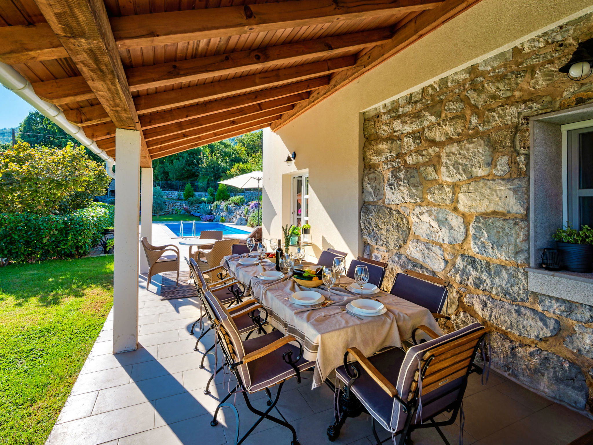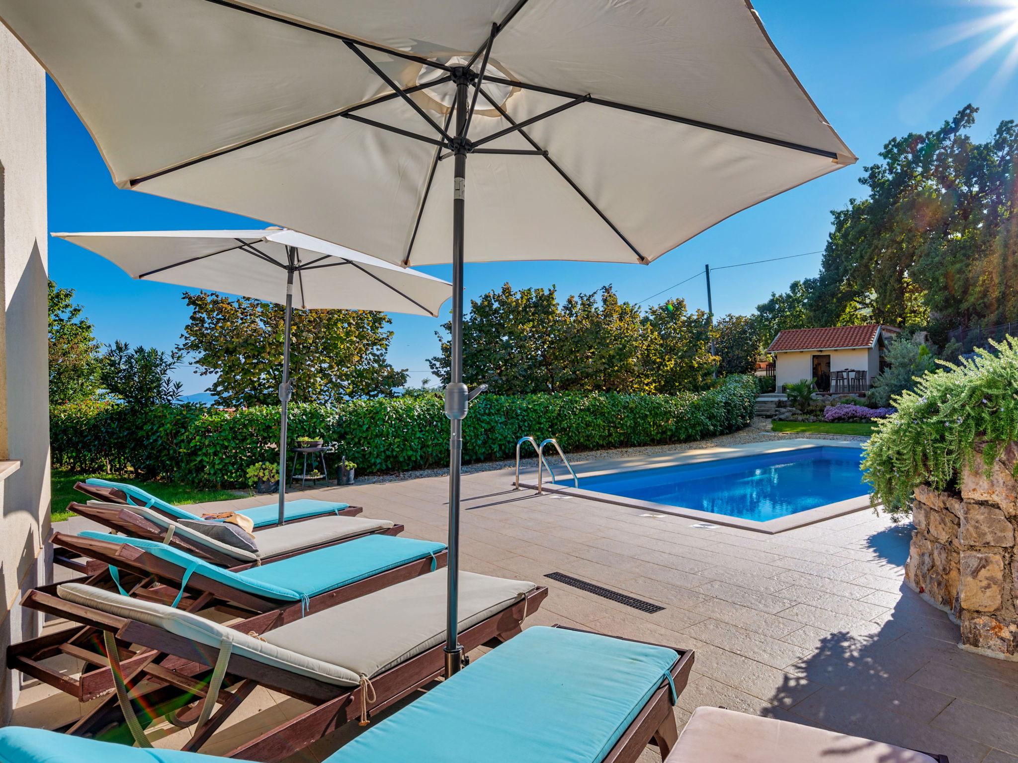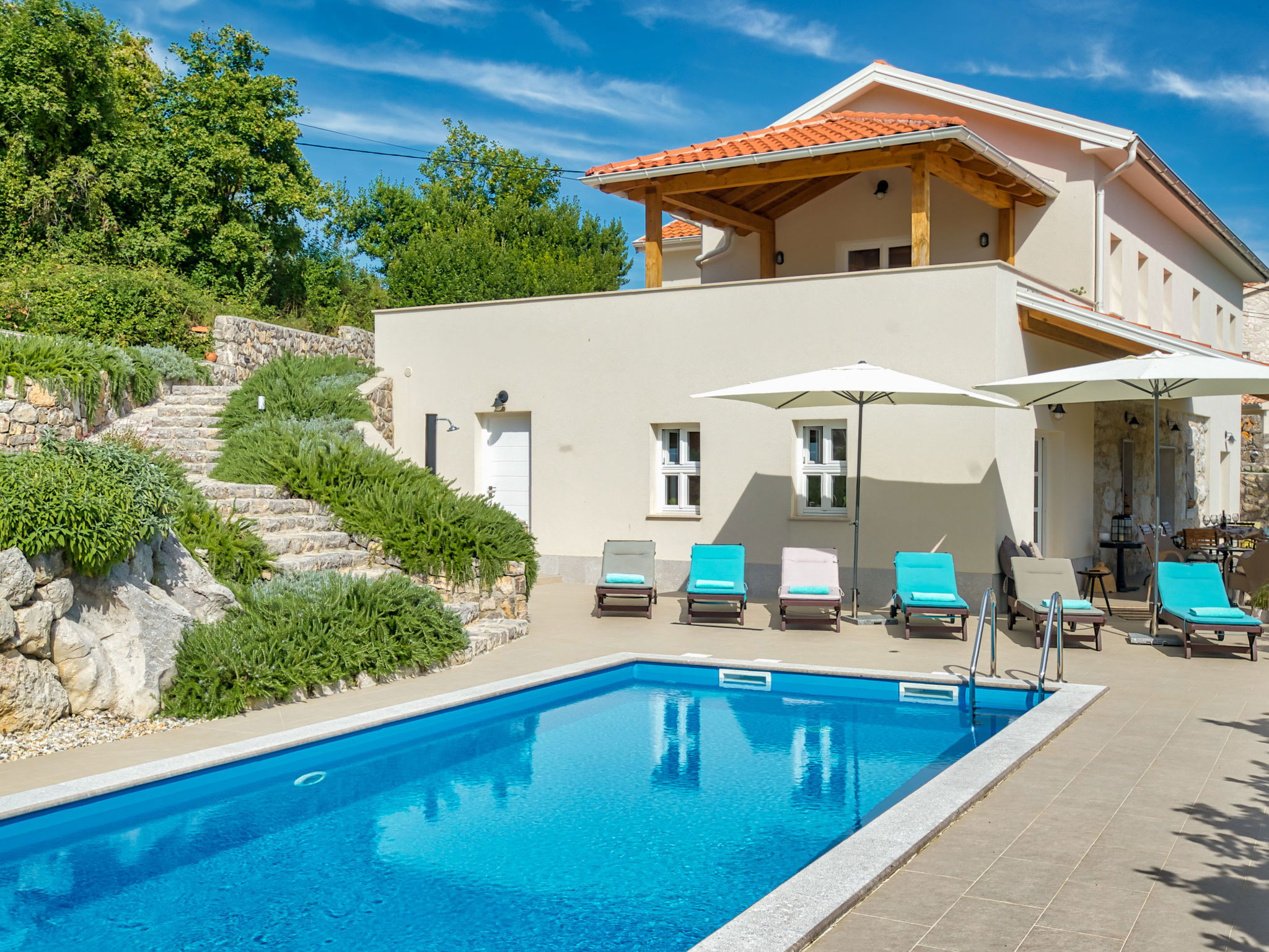 Poljane (Ičići) 9 km from Opatija: Beautiful villa "Pia", 2 storeys. Above Ičići, in the hamlet Jakusi 3.5 km from the centre of Ičići, in a quiet, sunny, elevated position, 3.5 km from the sea, 3.5 km from the beach. Private: property 960 m2 (fenced) with lawn and wildlife garden, swimming pool angular (30 m2, depth 150 cm, seasonal availability: 01.May. - 15.Oct.) with internal staircase. Outdoor shower, terrace (50 m2), garden furniture, barbecue. In the house: internet access, table football, washing machine. Parking at the house on the premises. Shop 800 m, supermarket 5 km, restaurant 3 km, bus stop 300 m, shingle beach 3.5 km, public bathing area 3.5 km, concrete beach 3.5 km. The owner does not accept any youth groups. Organizing a party is not allowed.