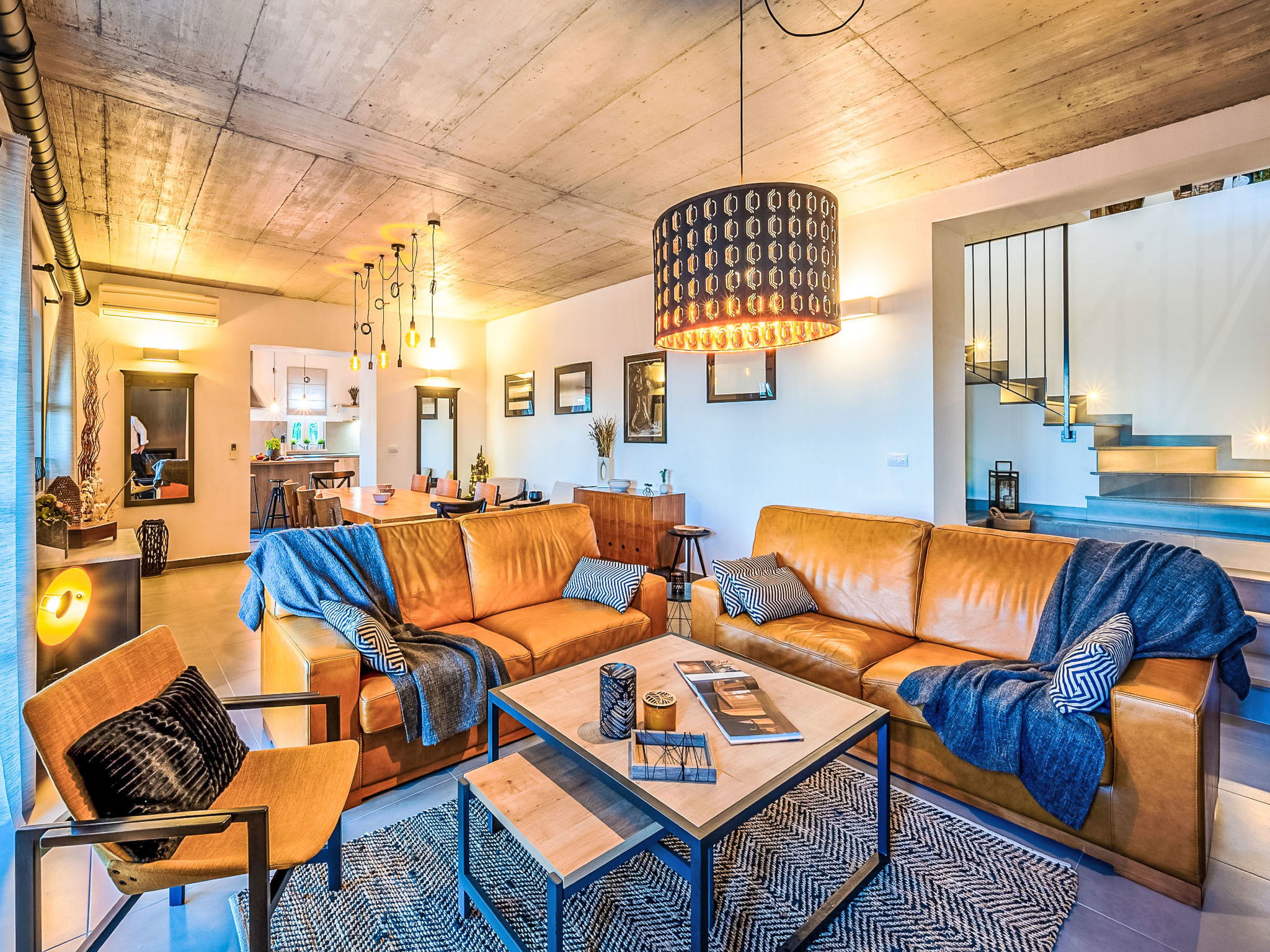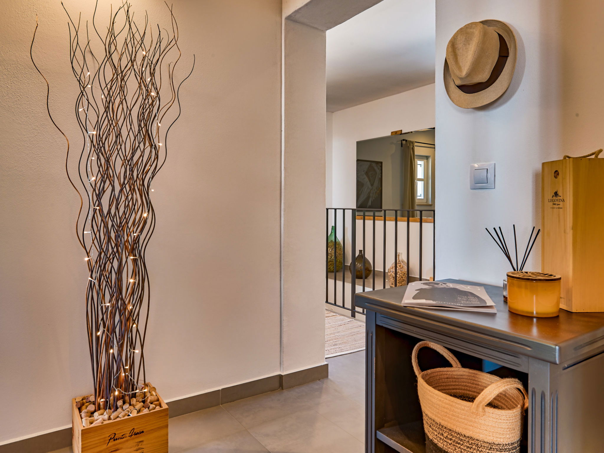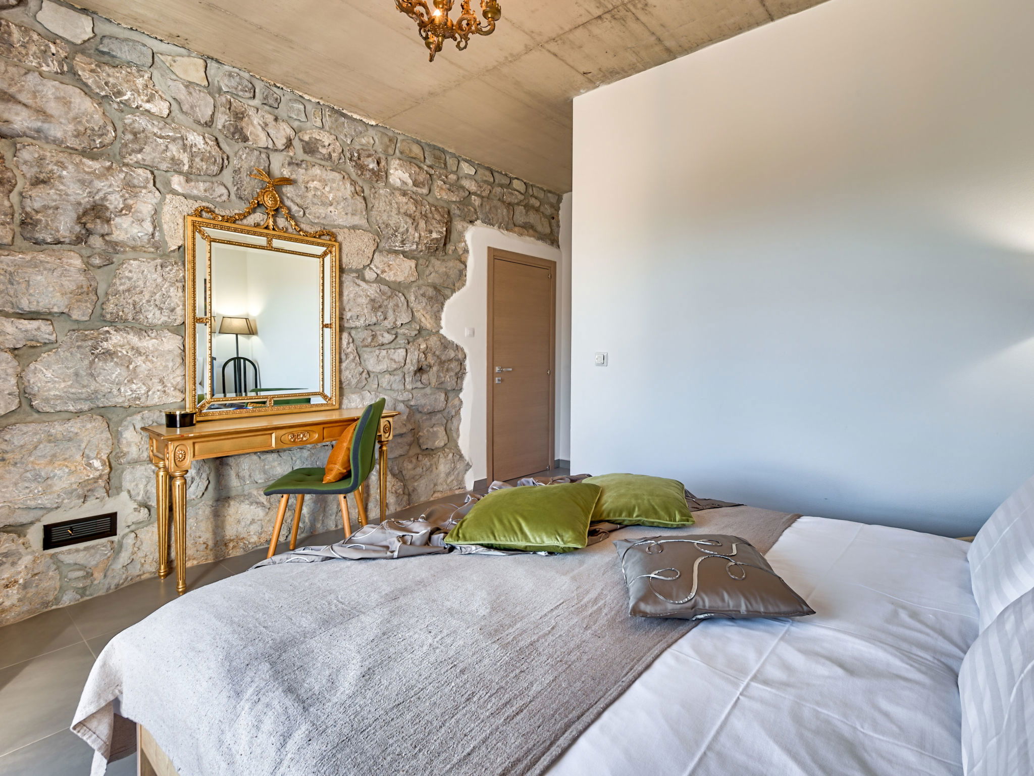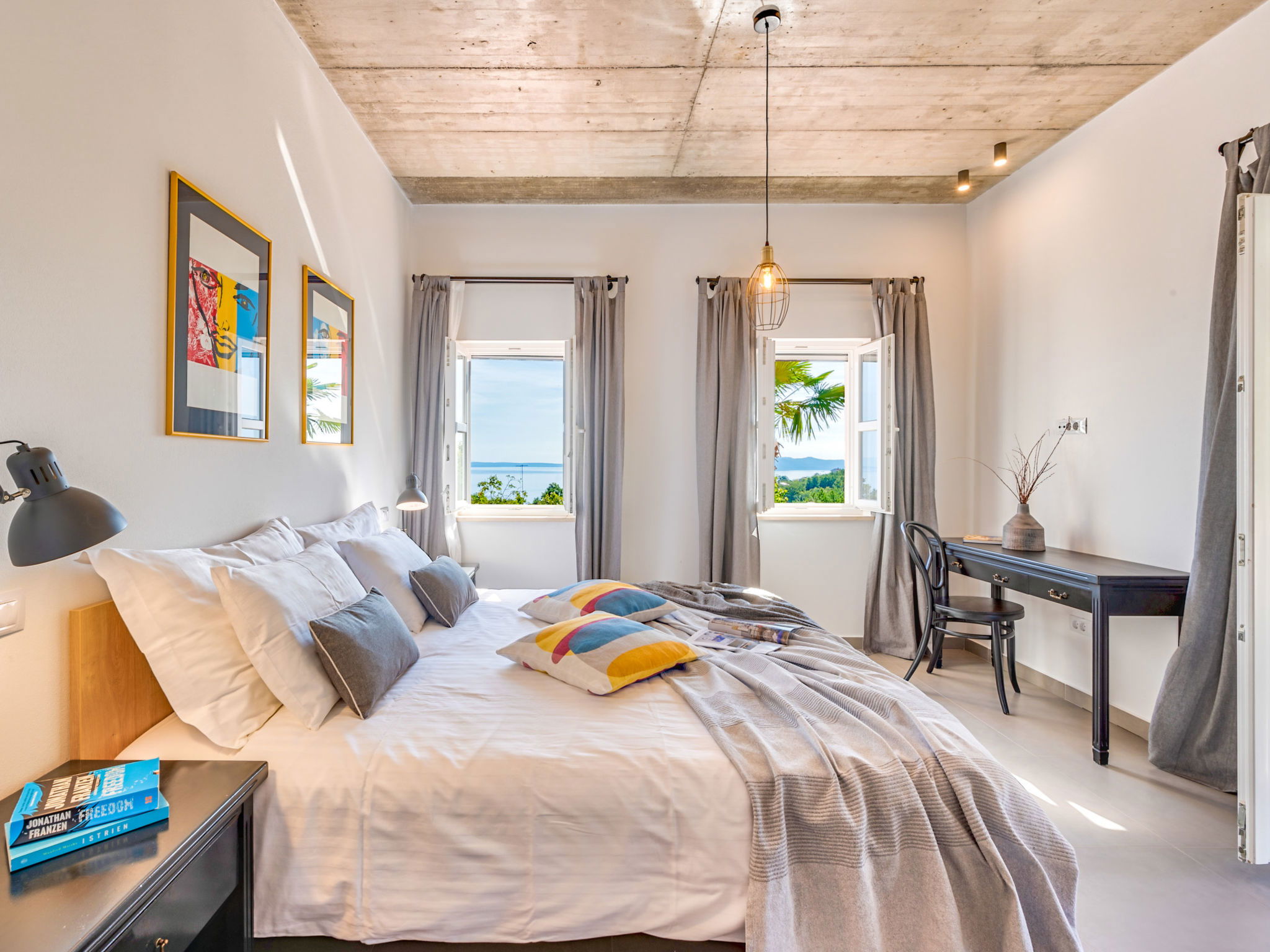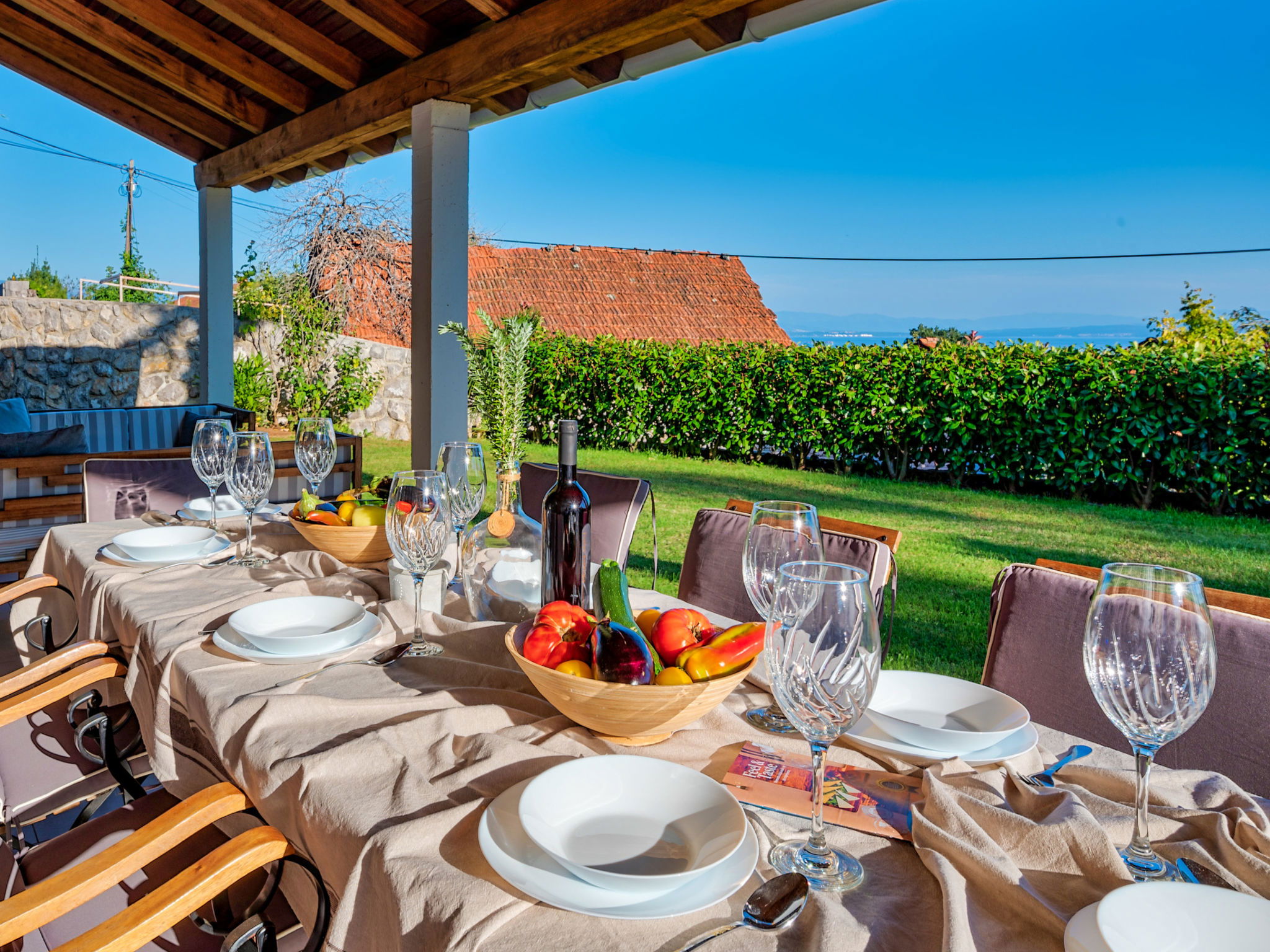 5-room villa 260 m2 on 2 levels. Living/dining room with open-hearth fireplace and cable TV (flat screen), air conditioning. Exit to the terrace, to the swimming pool. 1 room with 1 french bed (160 cm, length 200 cm), shower/WC. Exit to the terrace. Open kitchen (oven, dishwasher, 4 ceramic glass hob hotplates, toaster, kettle, freezer, electric coffee machine). Exit to the terrace. Upper floor: 2 rooms, each room with 1 french bed (160 cm, length 200 cm), shower/WC and air conditioning. 1 room with 1 french bed (180 cm, length 200 cm), bath/bidet/WC and air conditioning. Exit to the terrace. Floor heating, forced-air heating. Terrace 50 m2, roofed, 25 m2, roofed. Terrace furniture, balcony furniture, deck chairs (8). Beautiful view of the sea. Facilities: safe, iron, baby cot, hair dryer. Internet (WiFi, free). Parking (5 cars). Please note: non-smoking house. Maximum 1 small pet/ dog allowed.