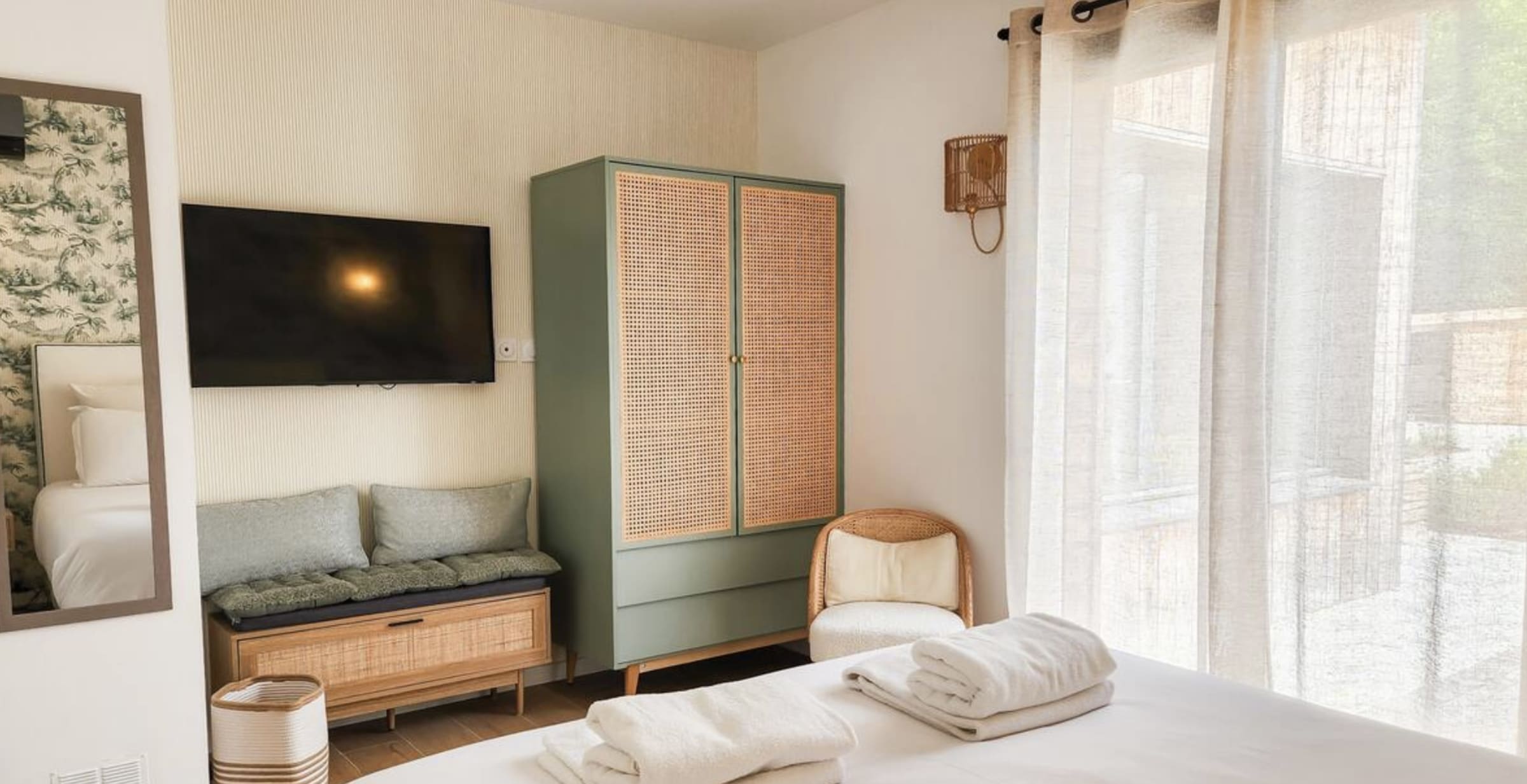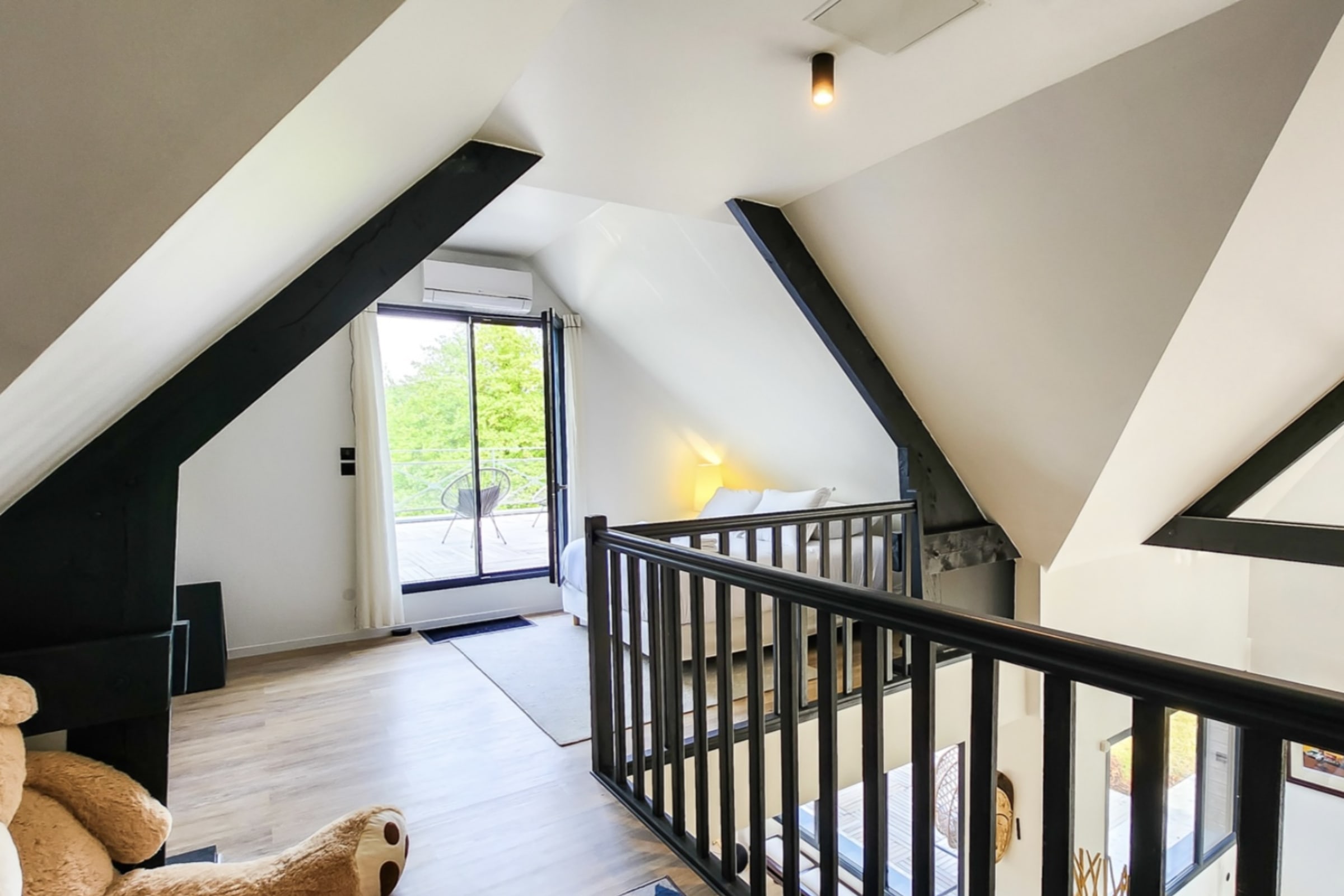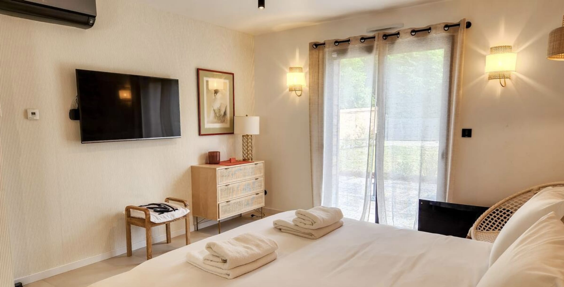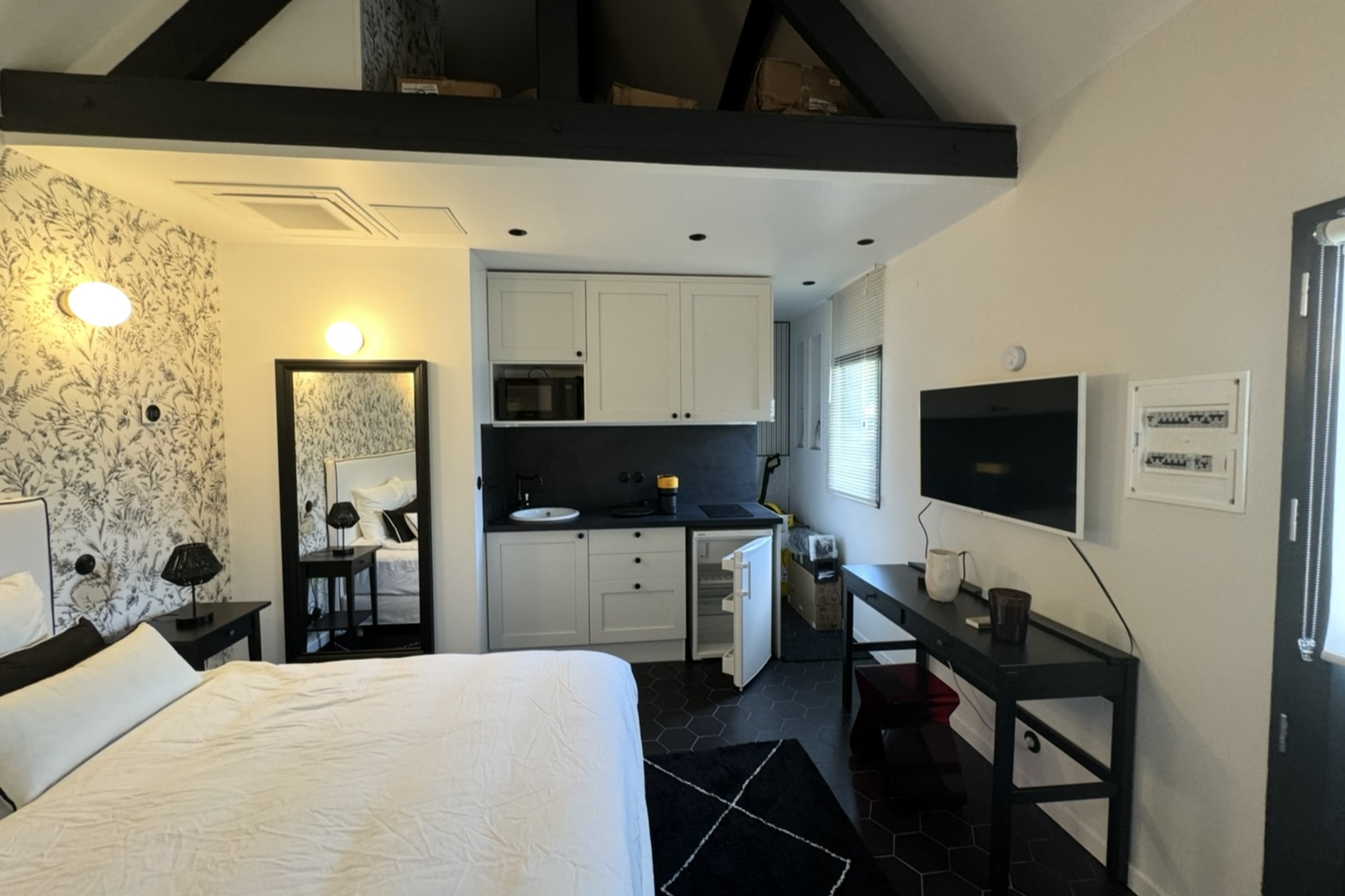 - in the outbuilding, a charming 26 m² studio offering privacy and comfort, equipped with a 160x200 double bed, kitchenette (microwave, coffeemaker, etc.), TV, and shower room with WC,