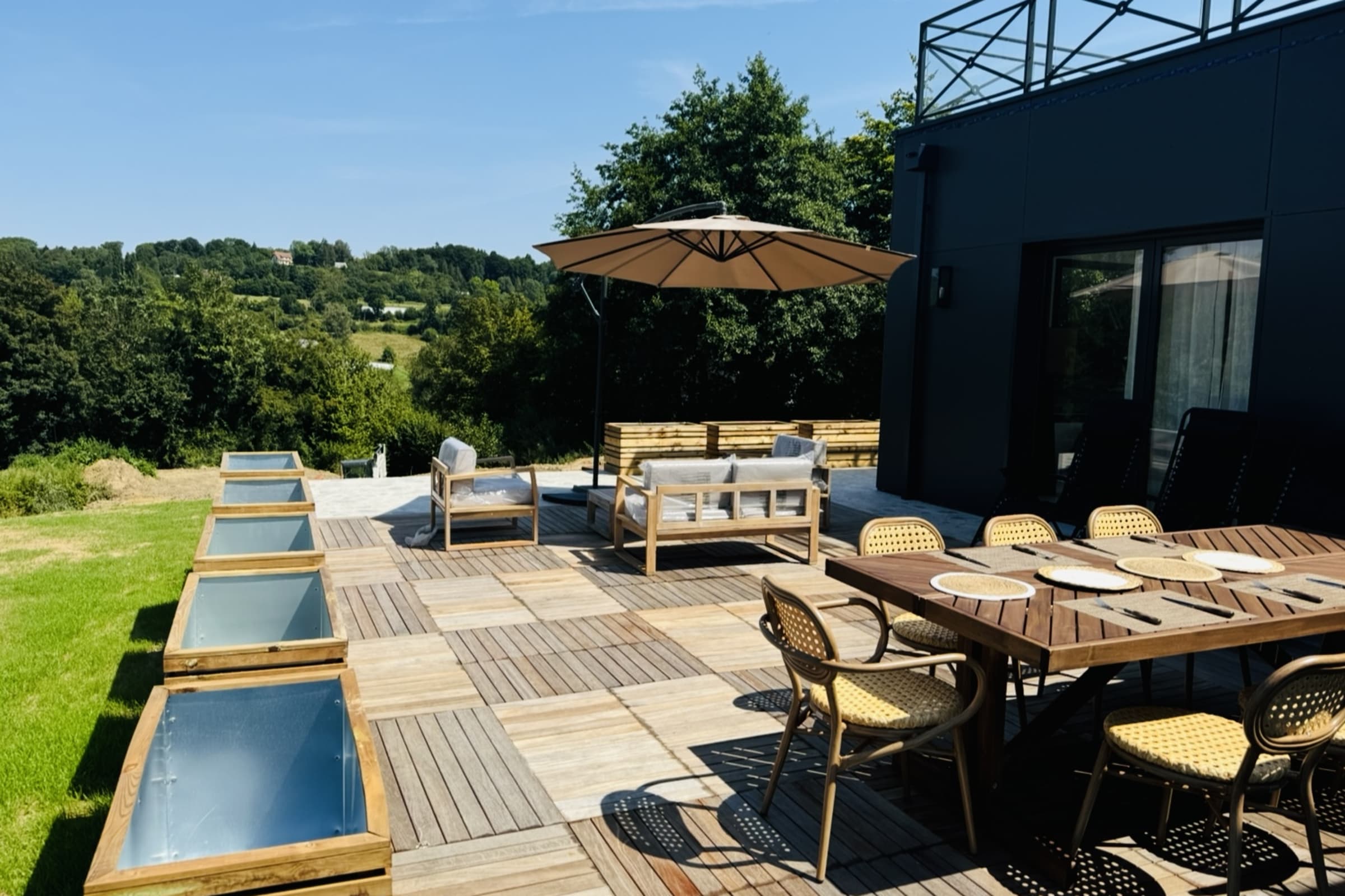 - large terraces with dining table, garden furniture, deckchairs and parasols for relaxing in the sun,