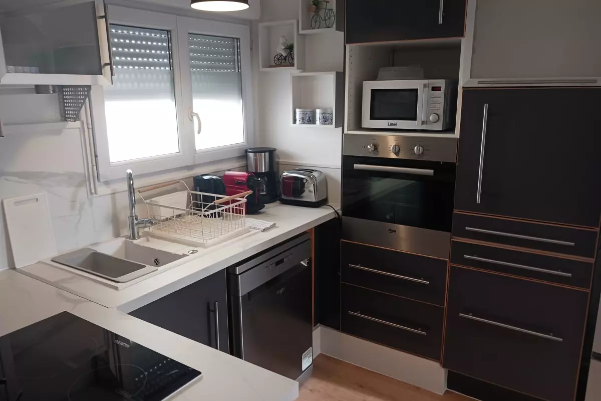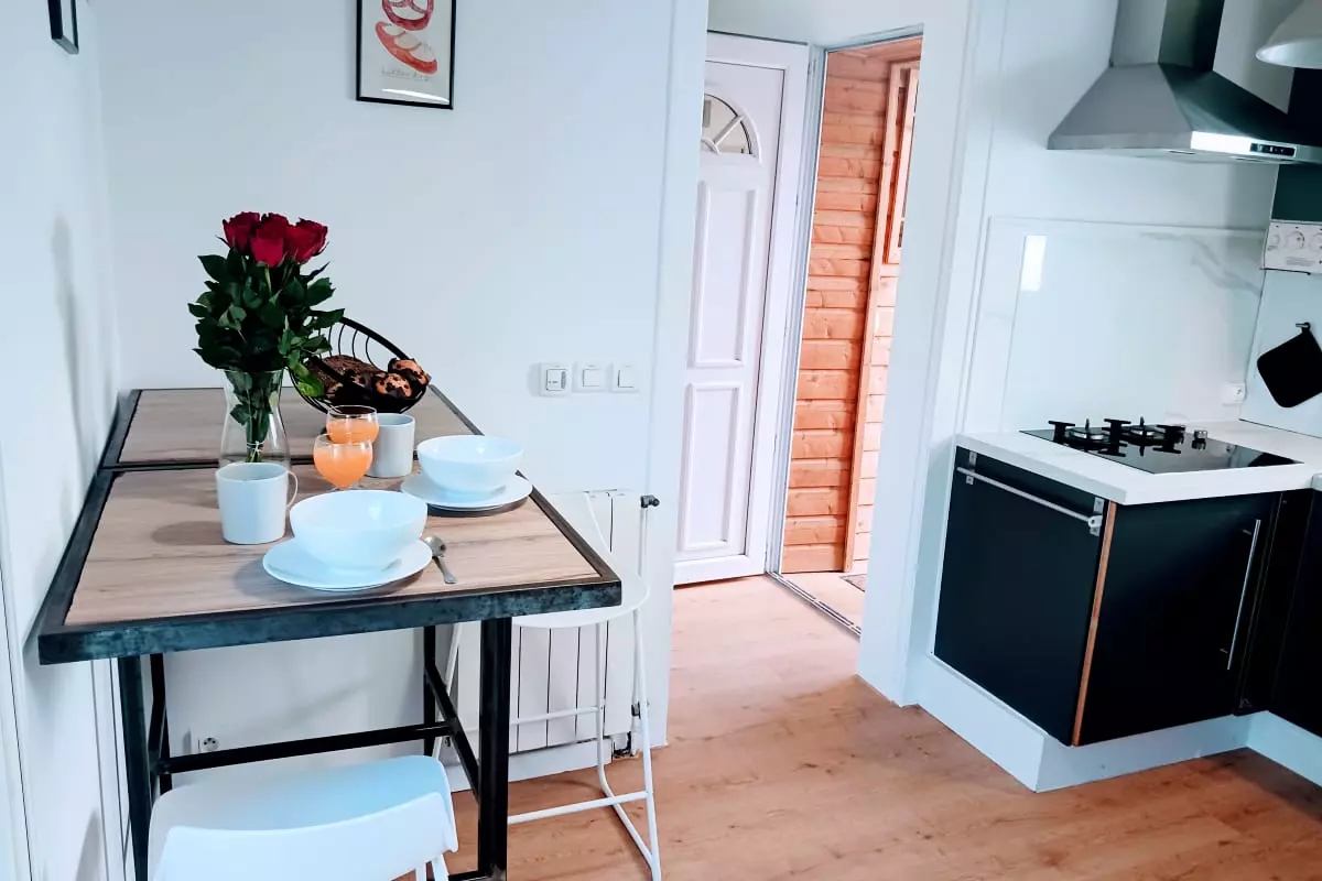 This house includes a welcoming bedroom with a 160 x 200 cm double bed, a fully equipped kitchen for preparing your meals, a functional shower room, a convivial dining area with a table and chairs, and a comfortable living room with a 140 x 200 cm sofa bed.