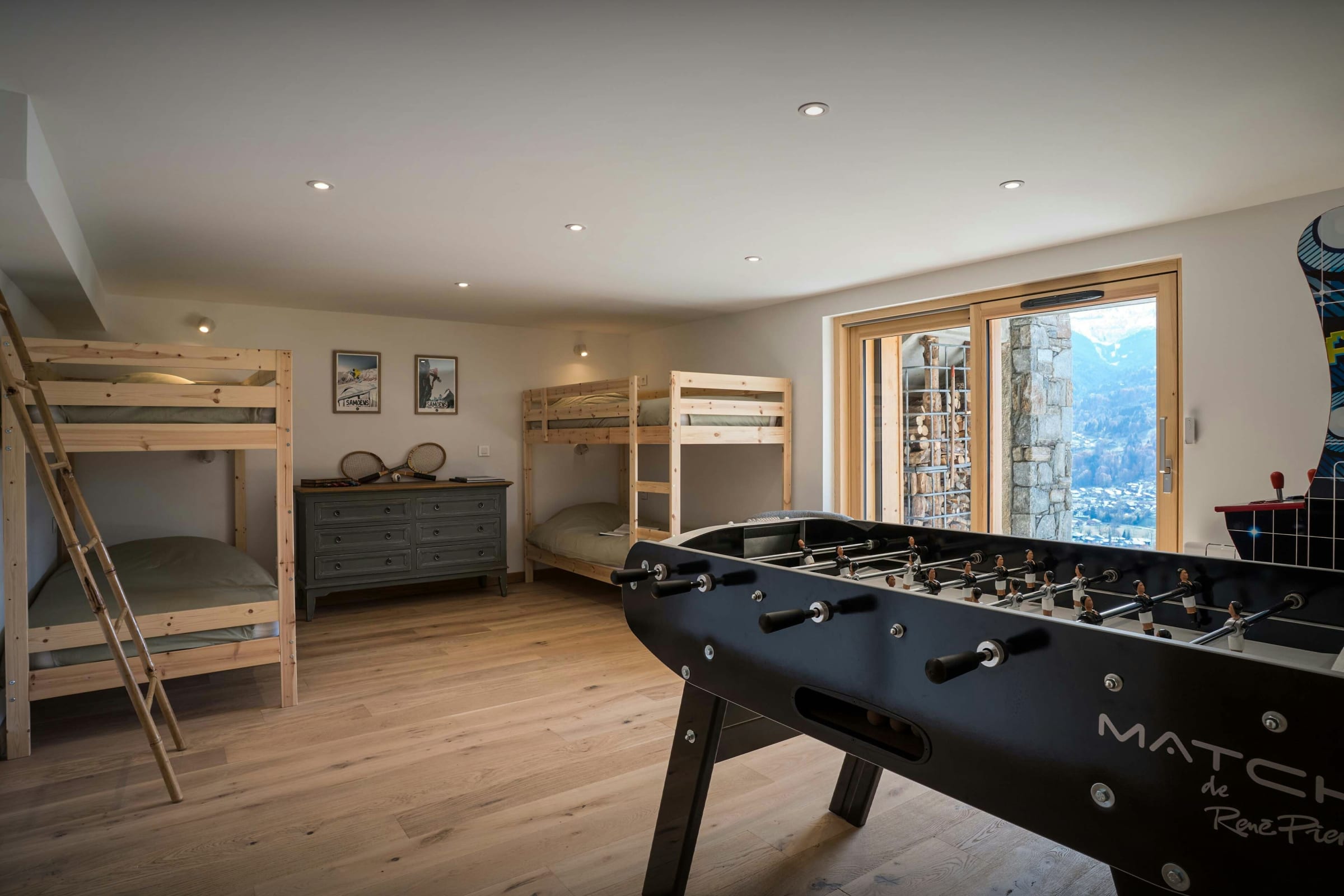 On the garden level, a bedroom with table football, an arcade machine and bunk beds for four will be a haven for younger guests, while one of the upstairs bedrooms has a mezzanine floor with two single beds for younger children, as well as a television and a large sn of games and toys.