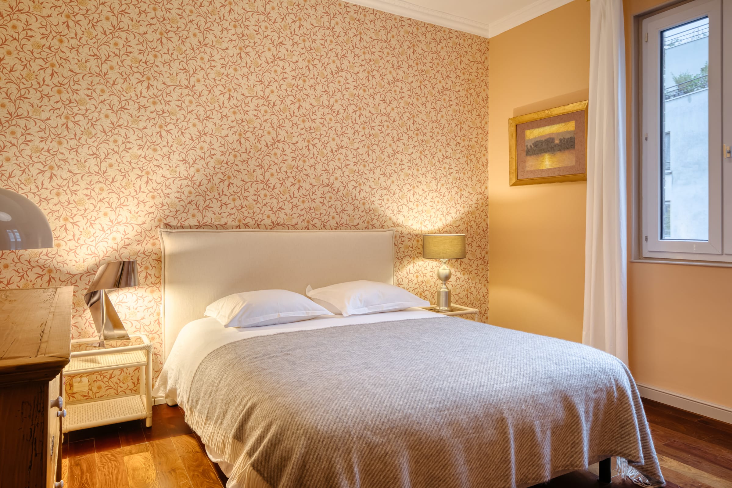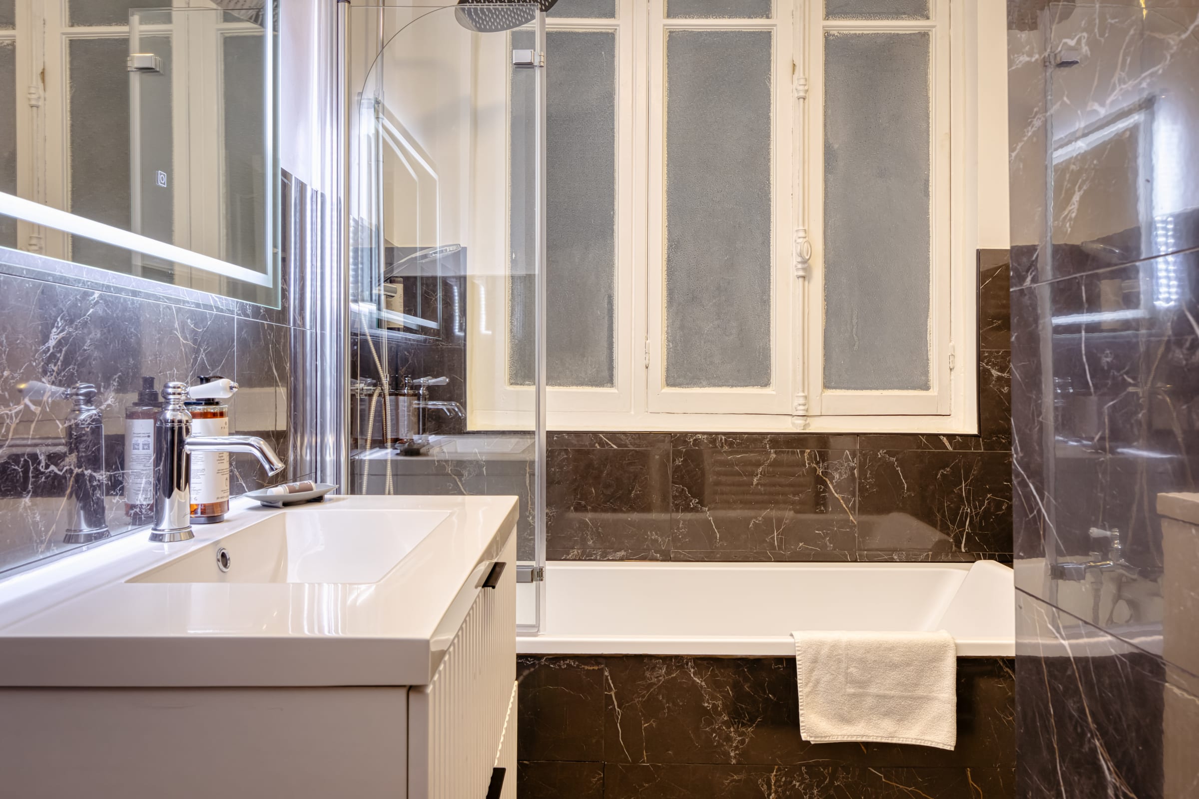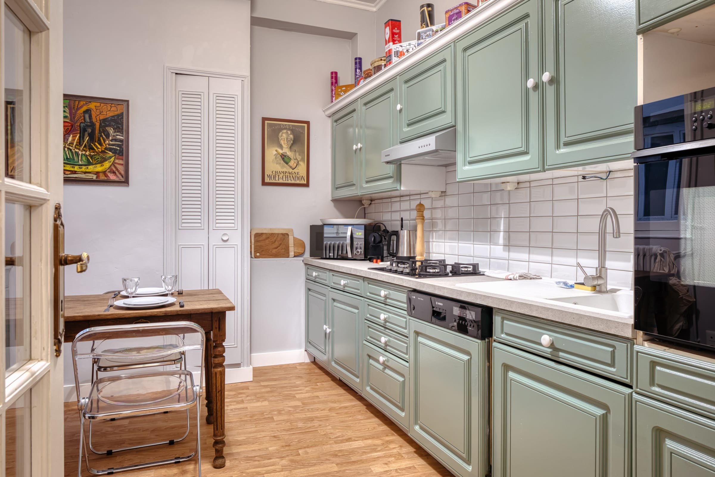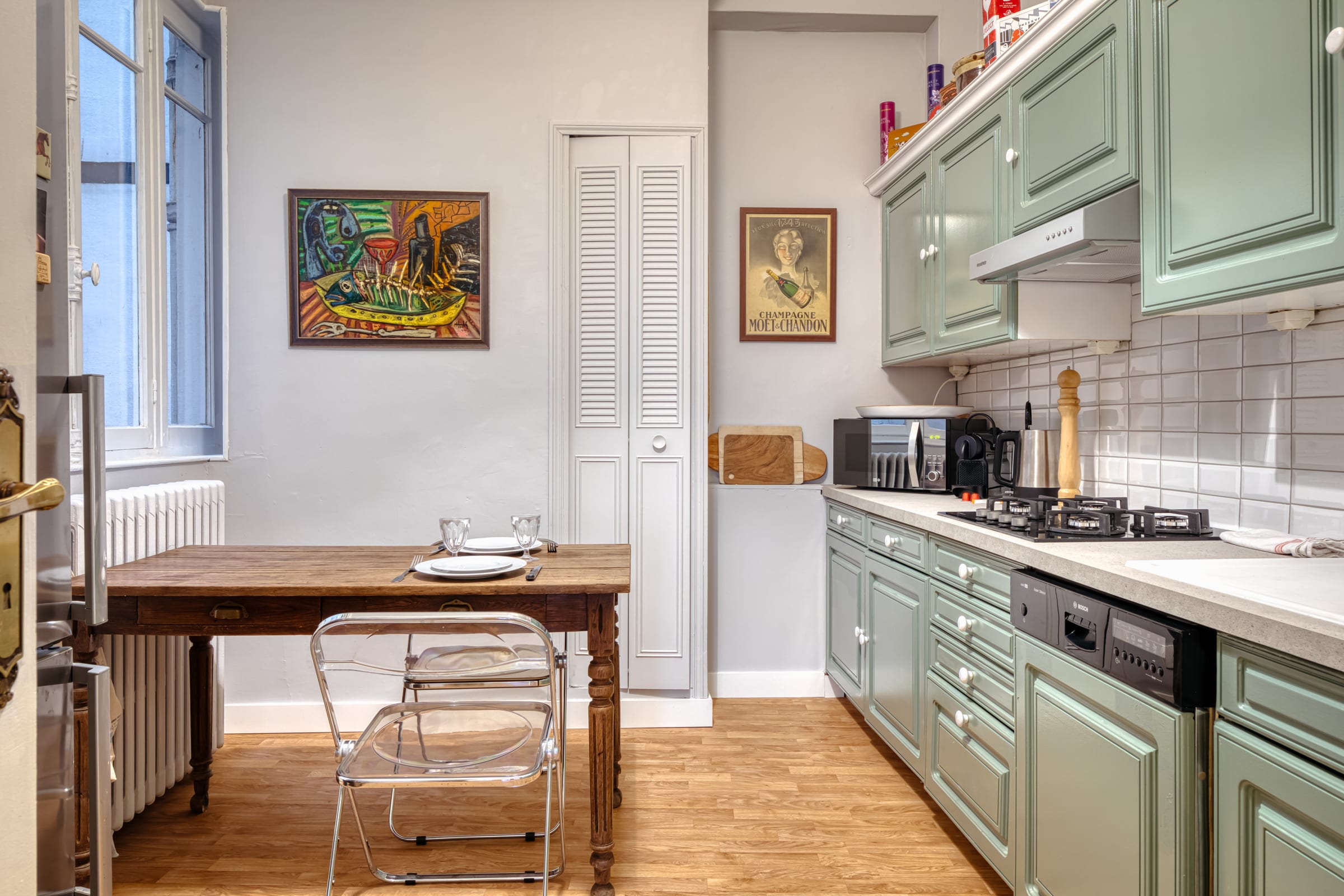 The flat has a pleasant living room with a sofa, coffee table and television, and you will also find an office area ideal for working. The kitchen is separate and fully equipped. You will find everything you need to cook and enjoy your stay: oven, microwave, hob, fridge-freezer, dishwasher, Nespresso coffee machine, kettle, toaster and kitchen utensils.