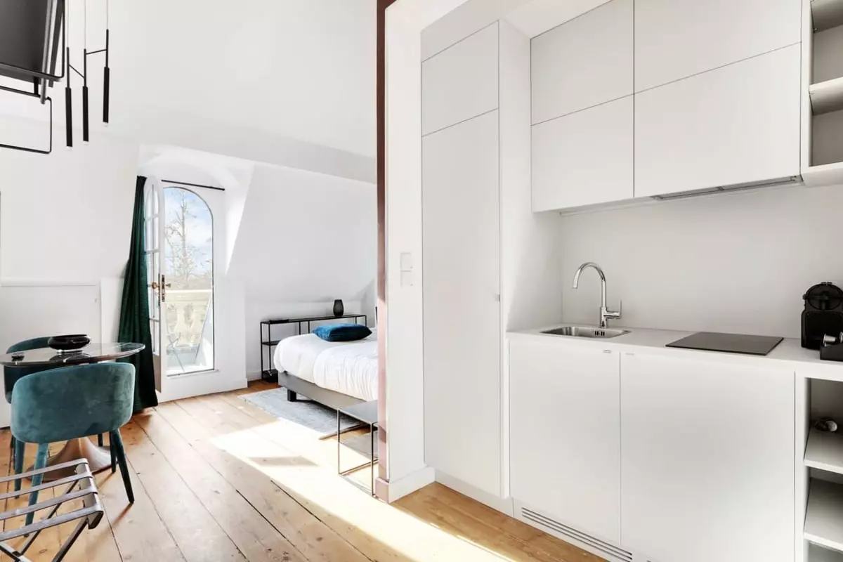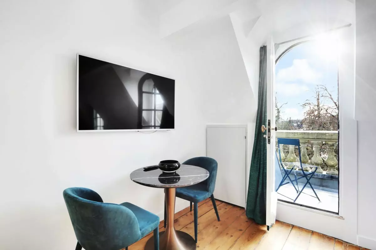Some apartments have a garden or a balcony or a view of the city rooftops and the Public Garden from the roof terrace.