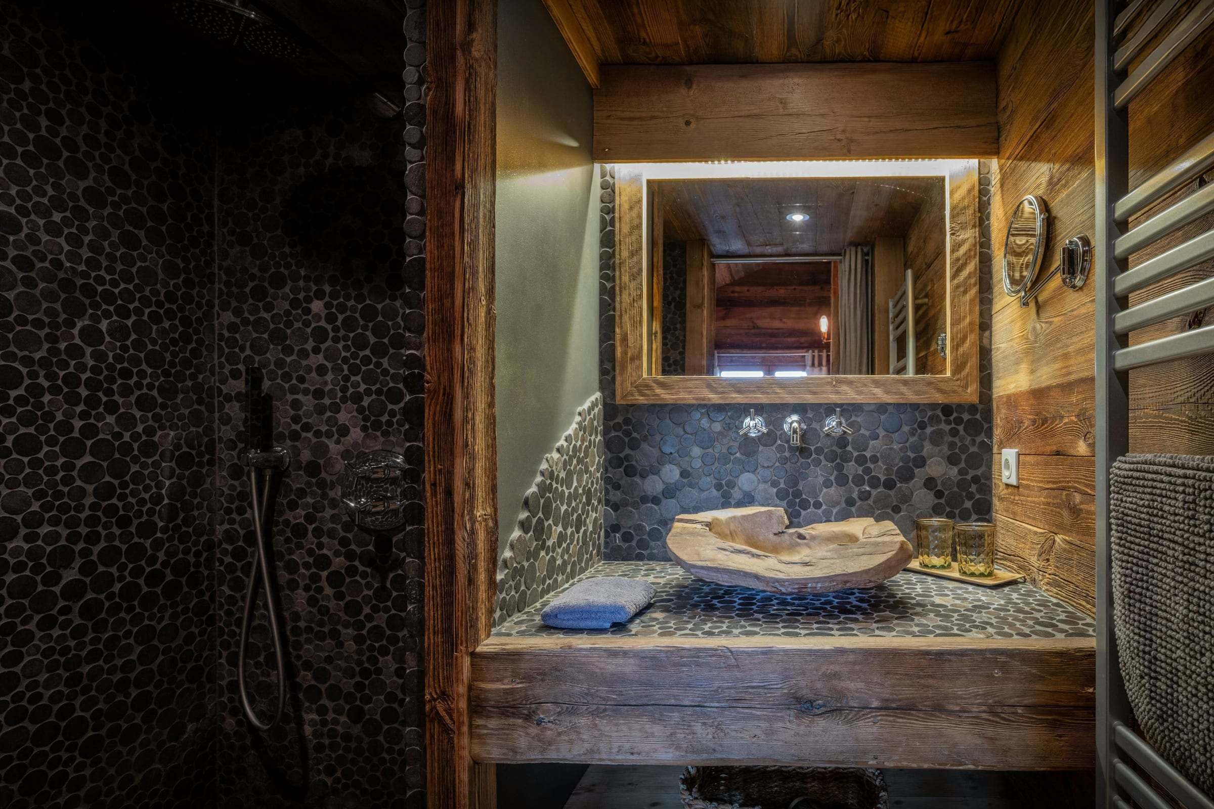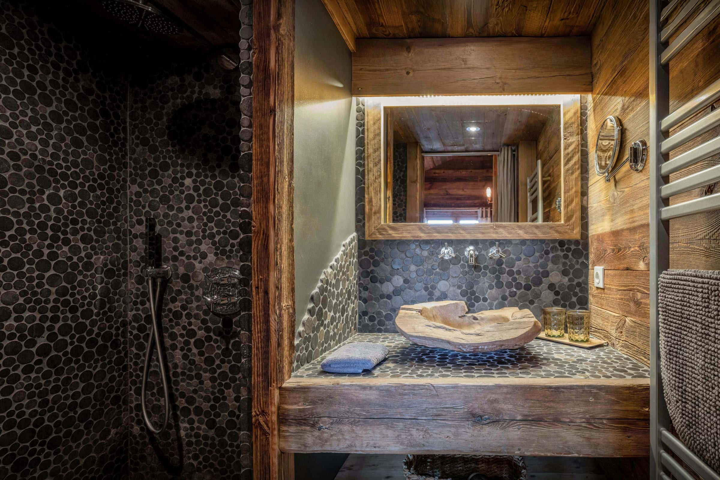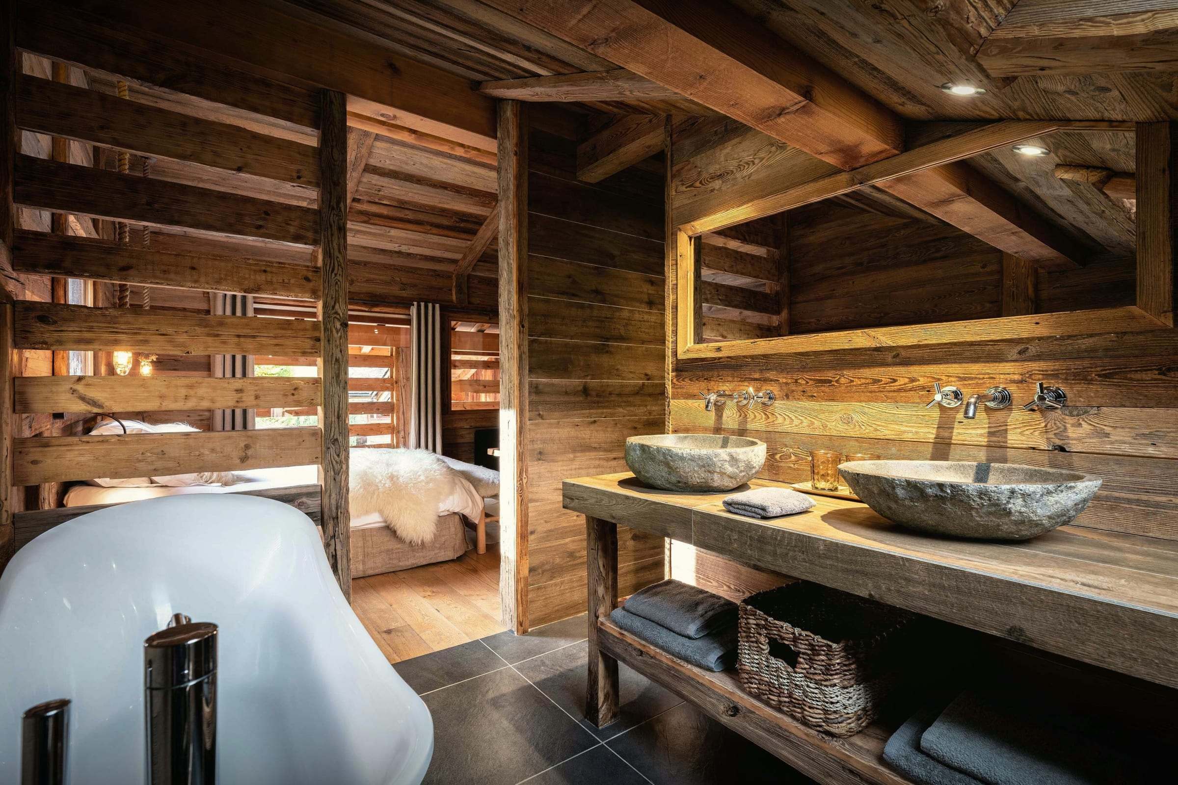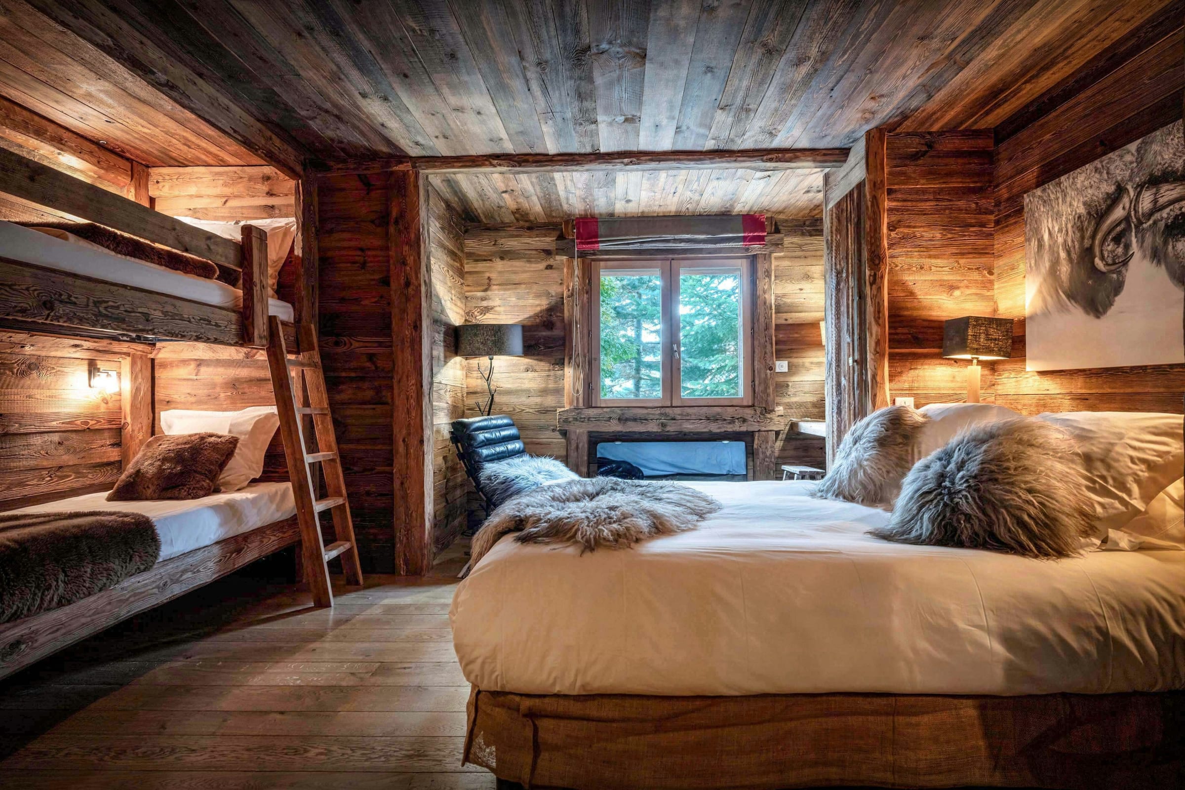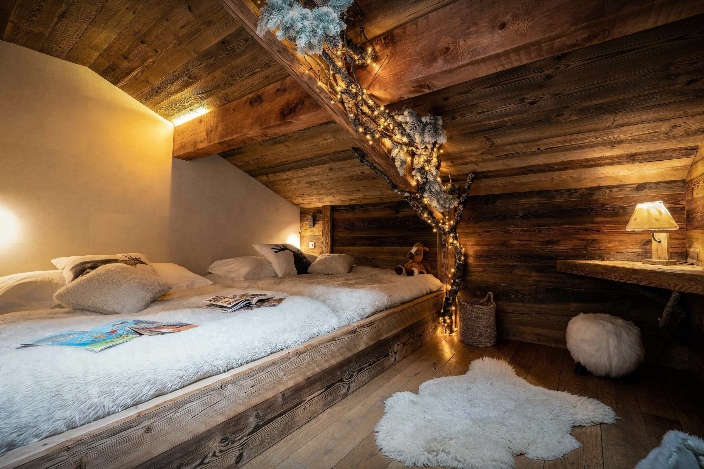 The central floor is the heart of the chalet. The spacious living area is divided into two seating areas around a fireplace while a second, more intimate sitting room provides the perfect spot for reading or sharing an aperitif. The fully equipped kitchen and large dining table make this space ideal for wonderful meals together.