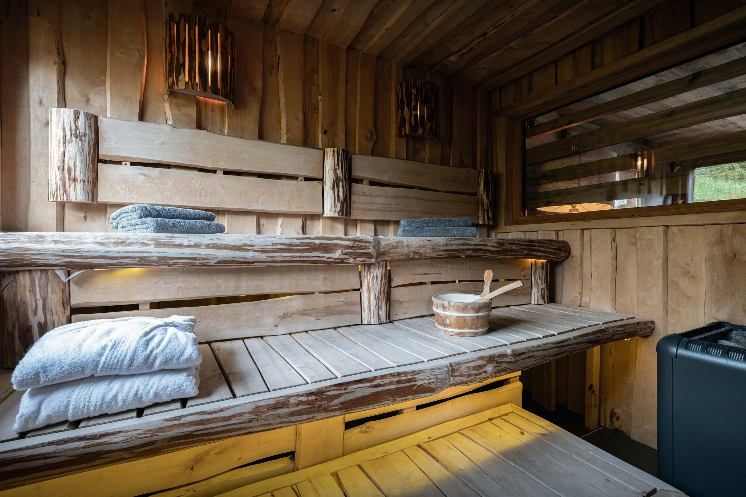 A large furnished terrace extends the living area outdoors. With a generous dining table, outdoor sofa, and hot tub facing the peaks, everything invites you to relax and unwind. There’s also a sauna on this floor.