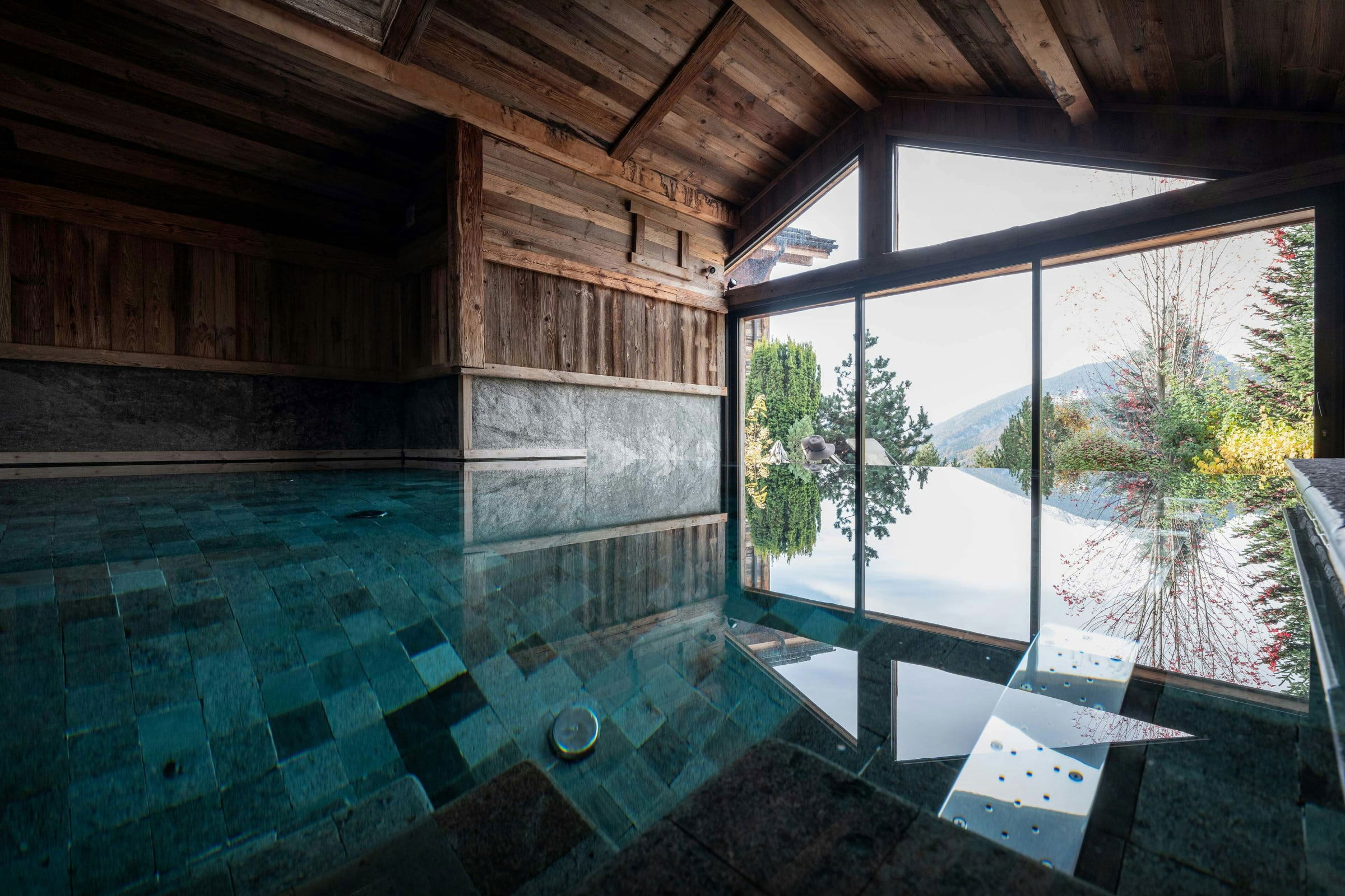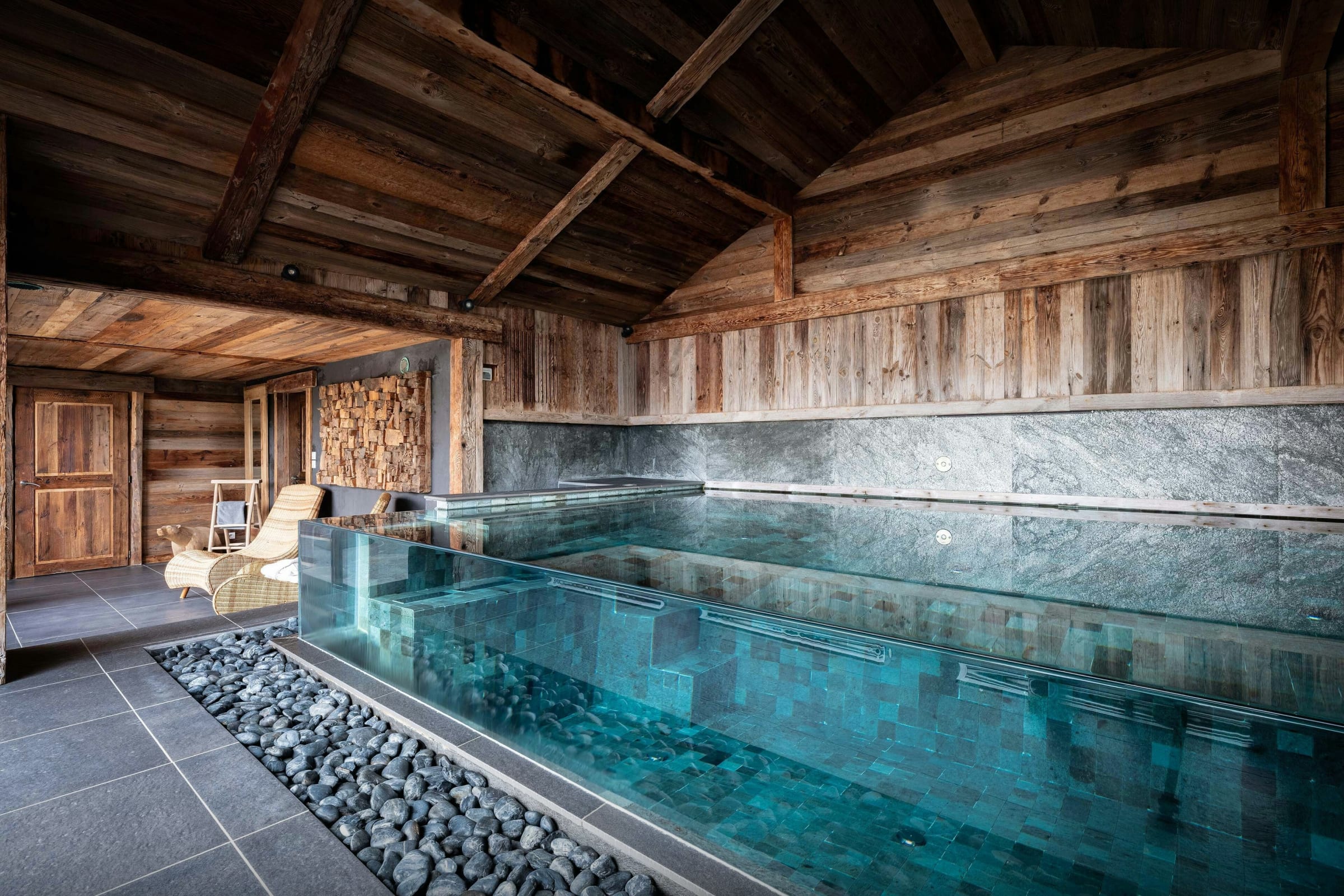 When you return from a day in the mountains, you can leave your outdoor gear in the ski room, which has heated boot dryers, ready for your next day out. The unusual glass-sided indoor pool opens onto a terrace with breathtaking views of the surrounding mountains. Also on this floor is a family suite with a double bed, bunk beds for two children and its own bathroom, as well as a fully equipped laundry room.