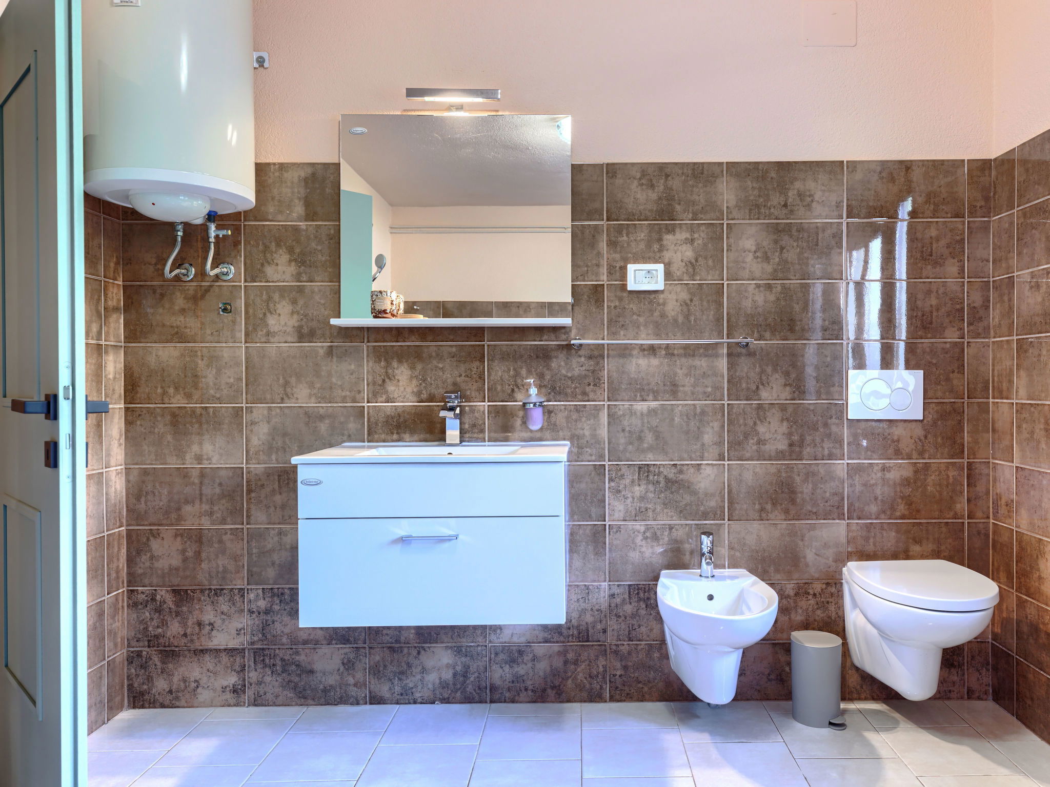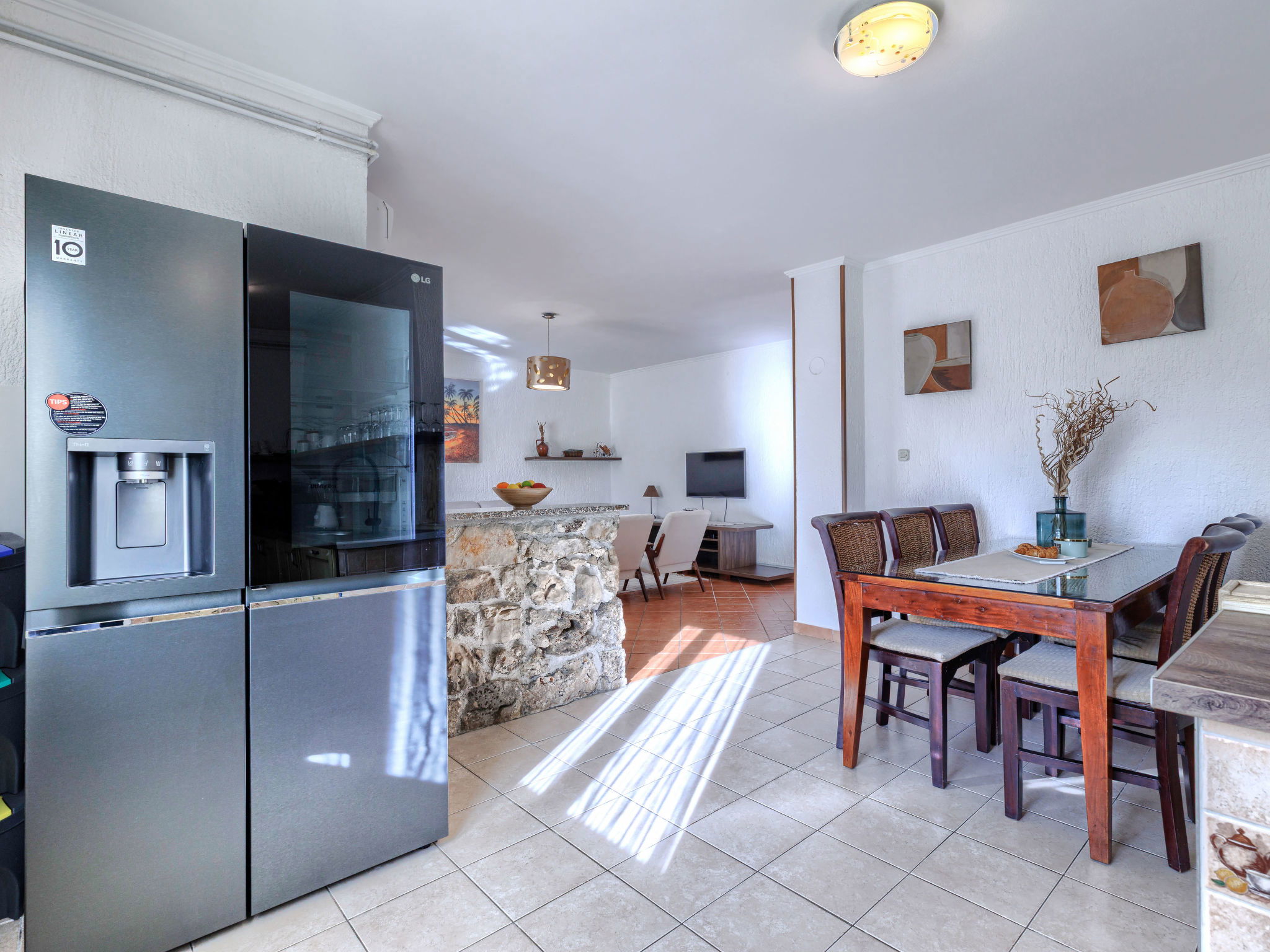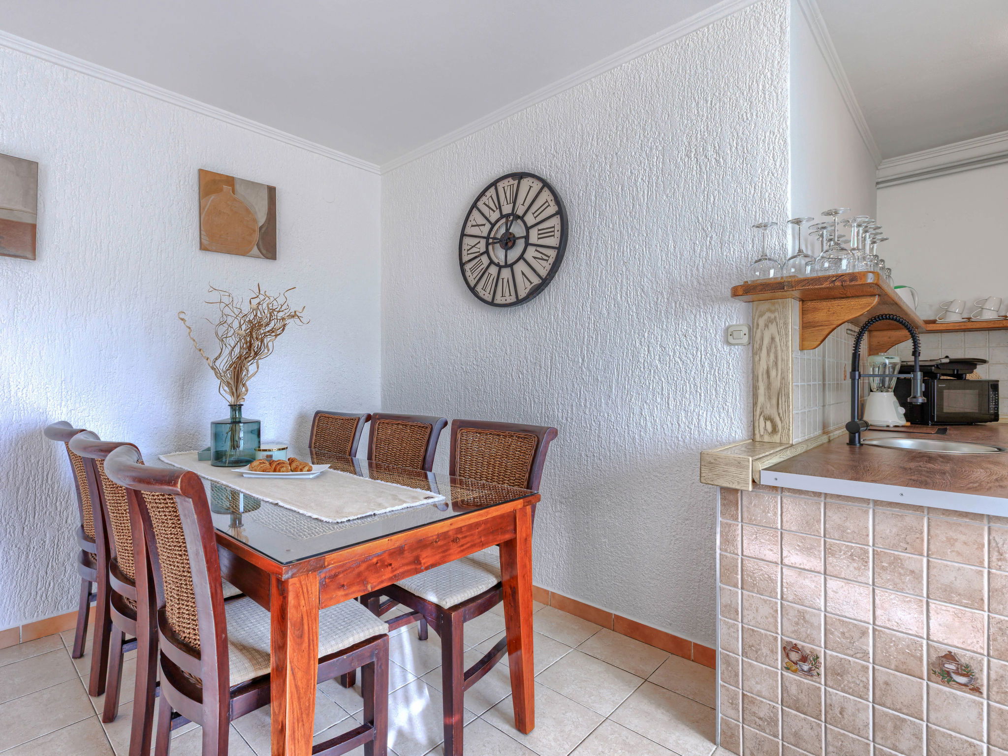 7-room villa 110 m2. Living/dining room with satellite TV (flat screen), air conditioning. Entrance hall with air conditioning. 1 room with 1 french bed (160 cm, length 200 cm), bath/WC with 1 french bed (160 cm, length 200 cm). Open kitchen (oven, dishwasher, 4 ceramic glass hob hotplates, kettle, microwave, freezer, electric coffee machine). Shower/WC. Upper floor: (exterior staircase) living/dining room with satellite TV (flat screen), air conditioning. Entrance hall with air conditioning. 1 room with 1 french bed (160 cm, length 200 cm). Exit to the terrace. 1 room with 1 french bed (160 cm, length 200 cm). 1 room, 1 bunk beds (90 cm, length 200 cm). Open kitchen (oven, dishwasher, 4 ceramic glass hob hotplates, kettle, microwave, freezer, electric coffee machine). Shower/WC. No heating option. Deck chairs. View of the swimming pool. Facilities: children's high chair, baby cot. Internet (WiFi, free). Suitable for families. 1 pet/ dog allowed.
