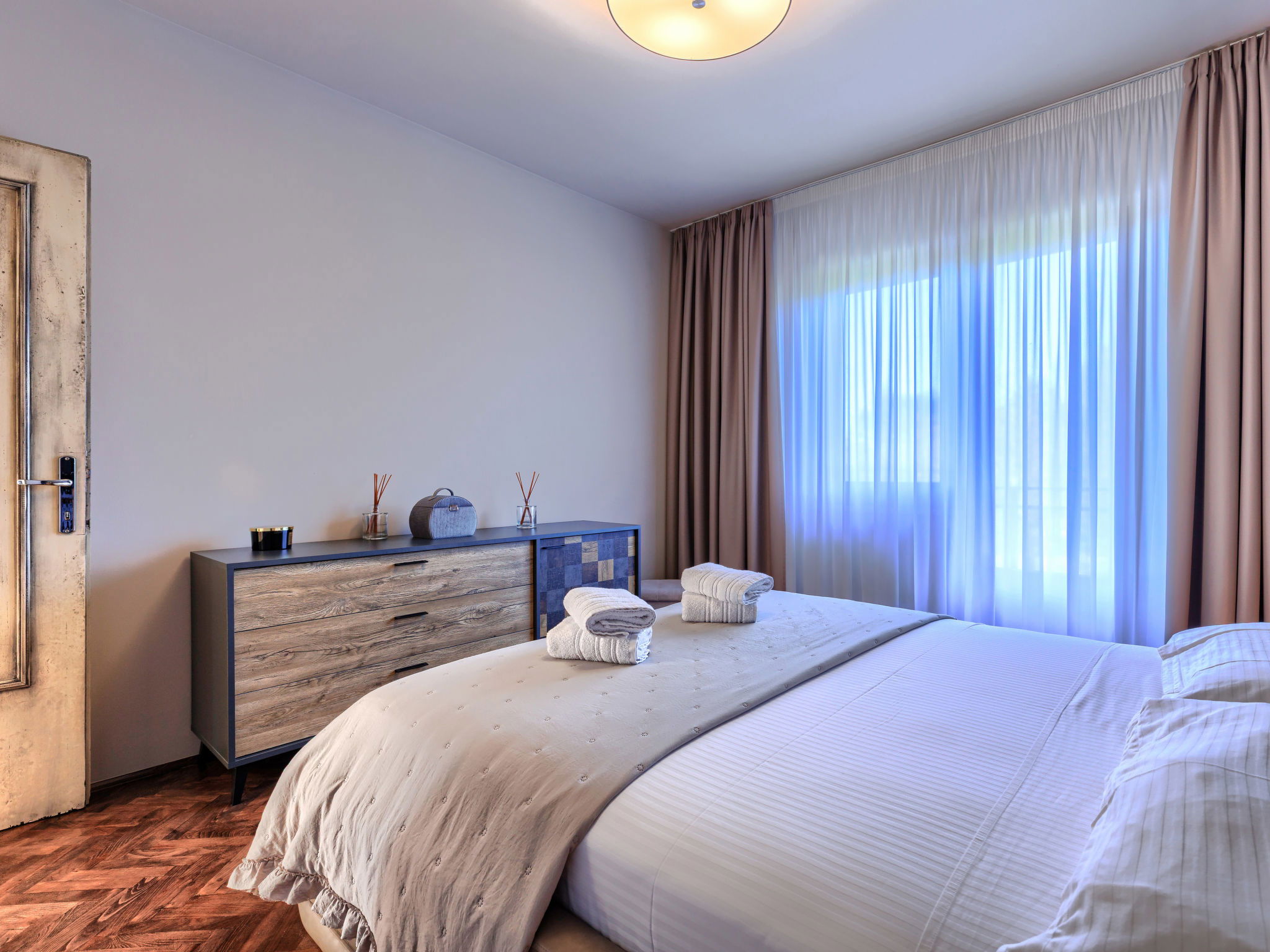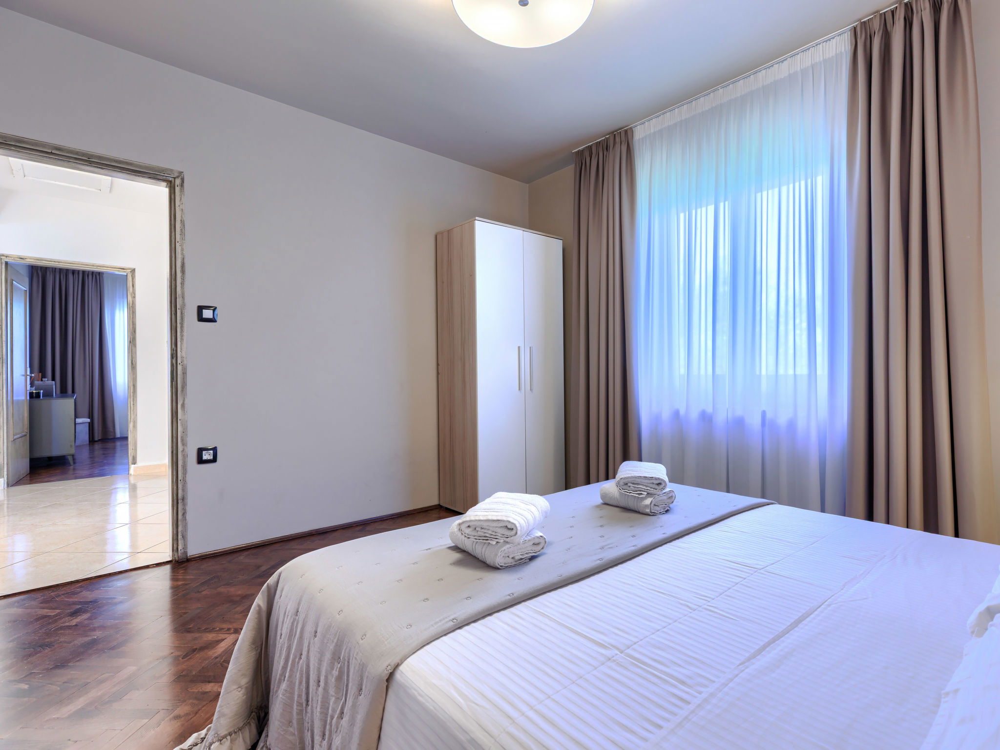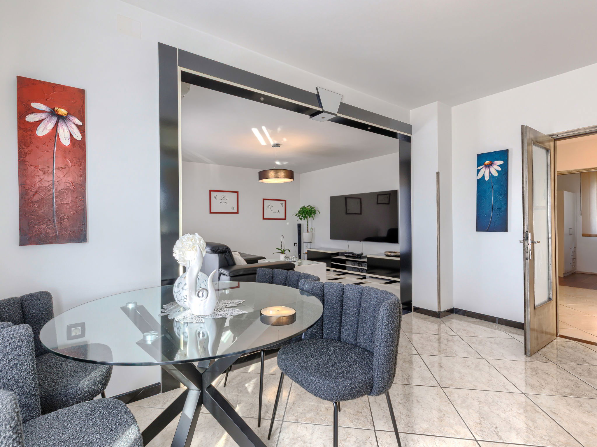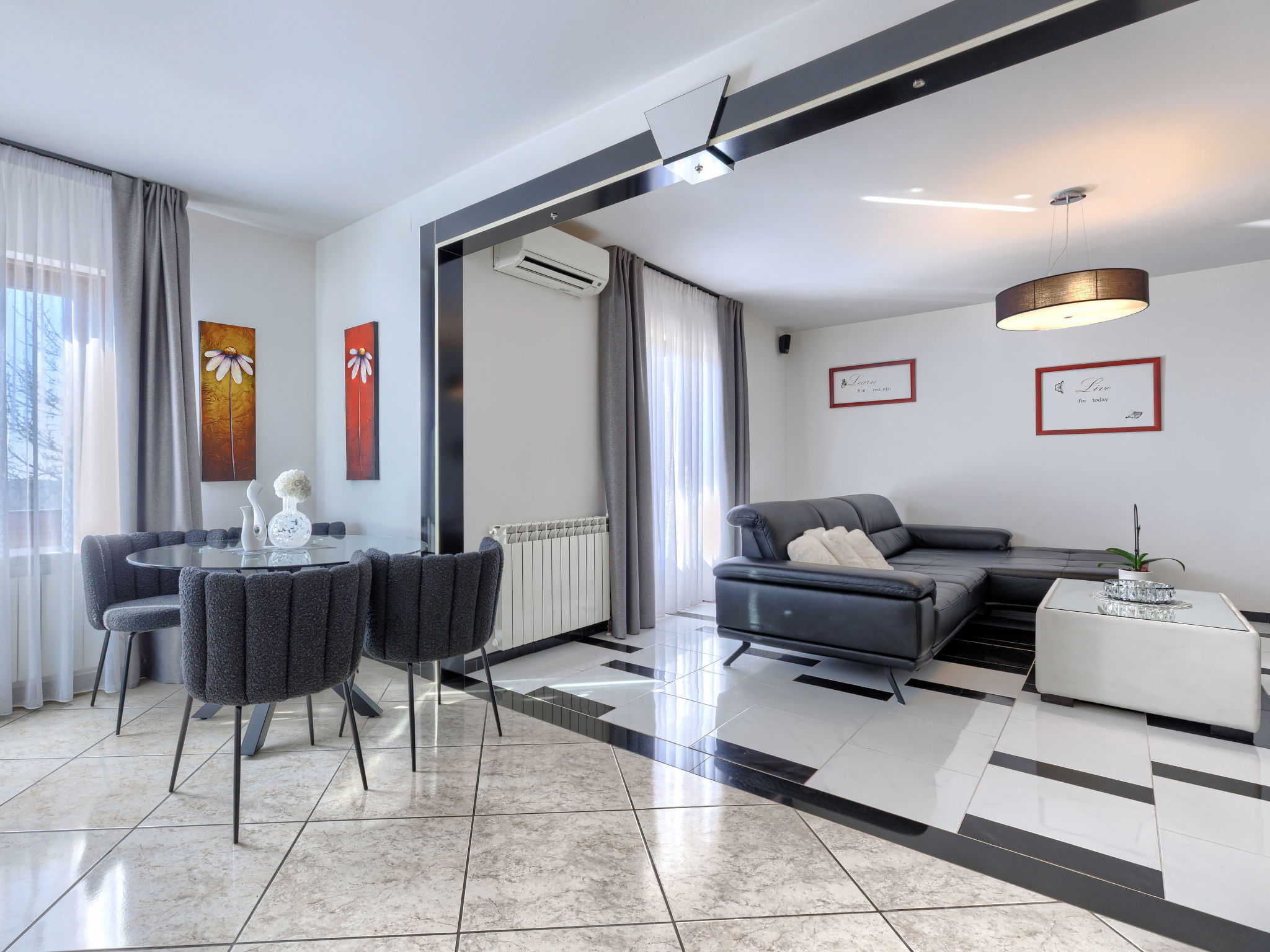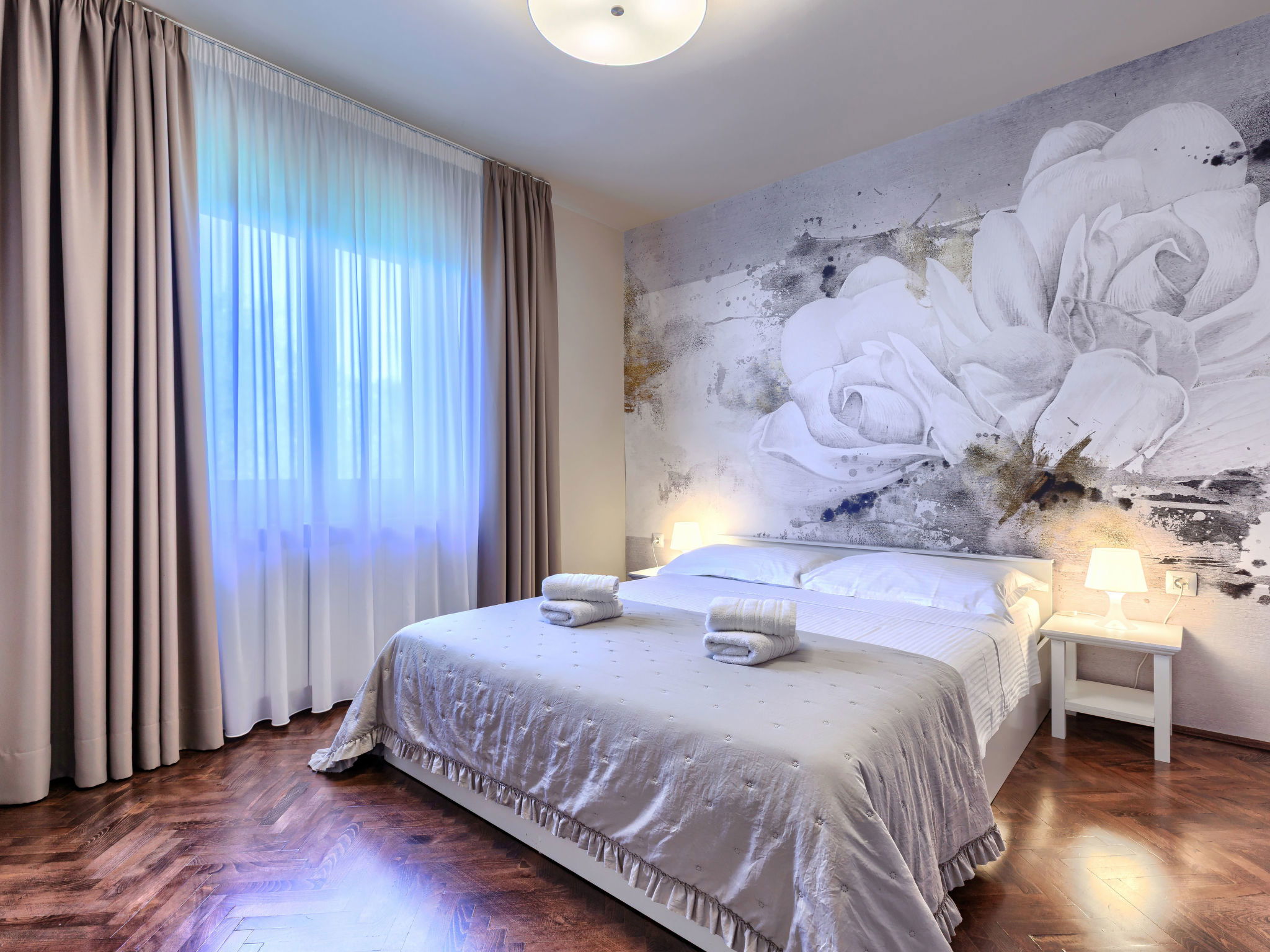Bašići 12 km from Poreča: Villa "Elli", 2 storeys. 3 km from the centre of Tinjan, in a sunny position, 12 km from the sea, located by a road. Private: property 2'255 m2 with lawn and trees, swimming pool angular (4 x 8 m, depth 140 cm, seasonal availability: 01.May. - 01.Oct.) with internal staircase. Outdoor shower, terrace (25 m2), garden furniture, barbecue, children's playground (slide, swing), pool maintenance by the owner/gardener. In the house: internet access, washing machine. Parking (for 4 cars) at the house on the premises. Shop 3 km, supermarket 7 km, restaurant 100 m, bus stop 3 km, pebble beach 12 km, rocky beach 12 km. Surf school 12 km, walking paths from the house, cycle lane 100 m. Nearby attractions: Adrenalin Park Kringa 5 km. The owner does not accept any youth groups.