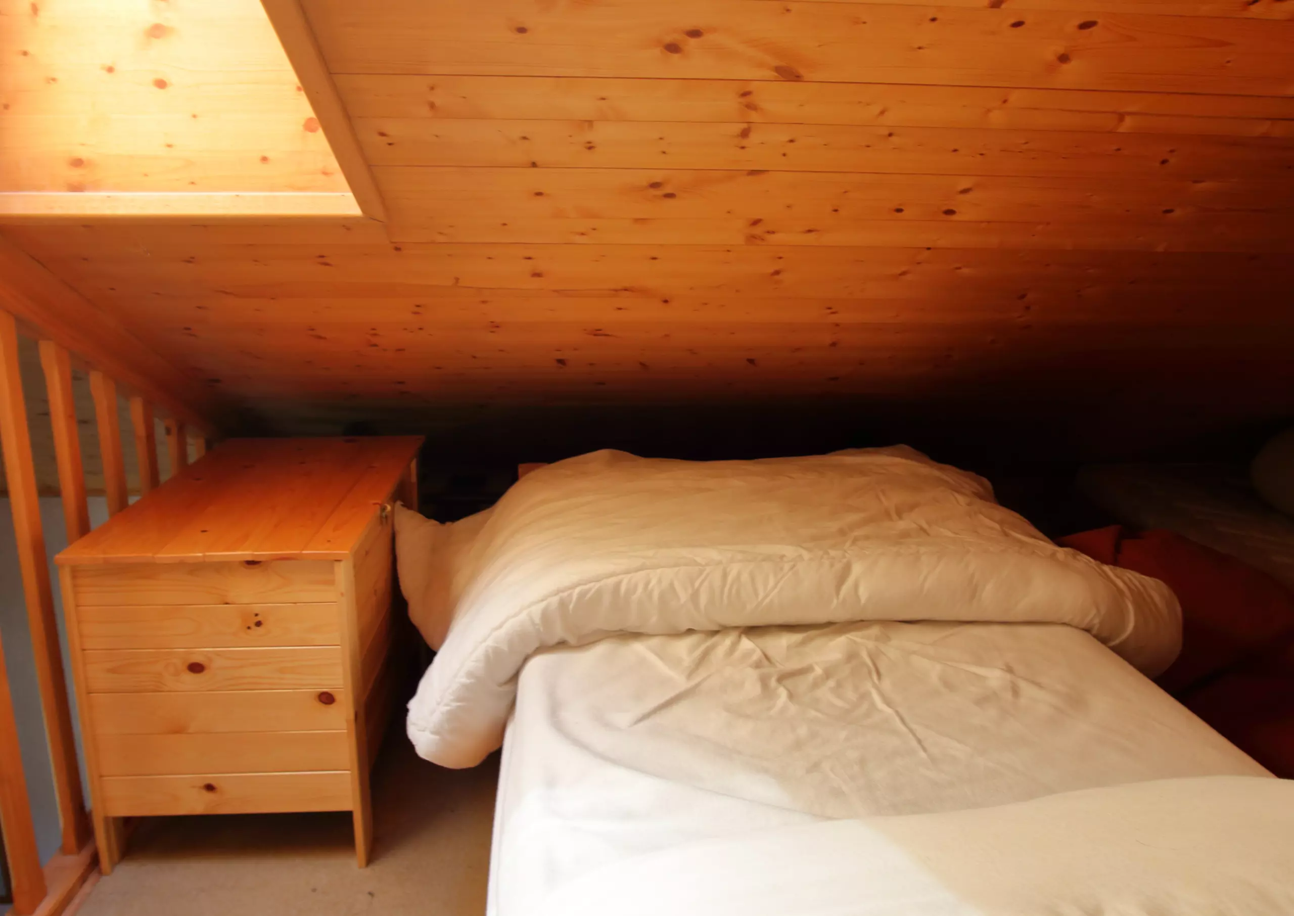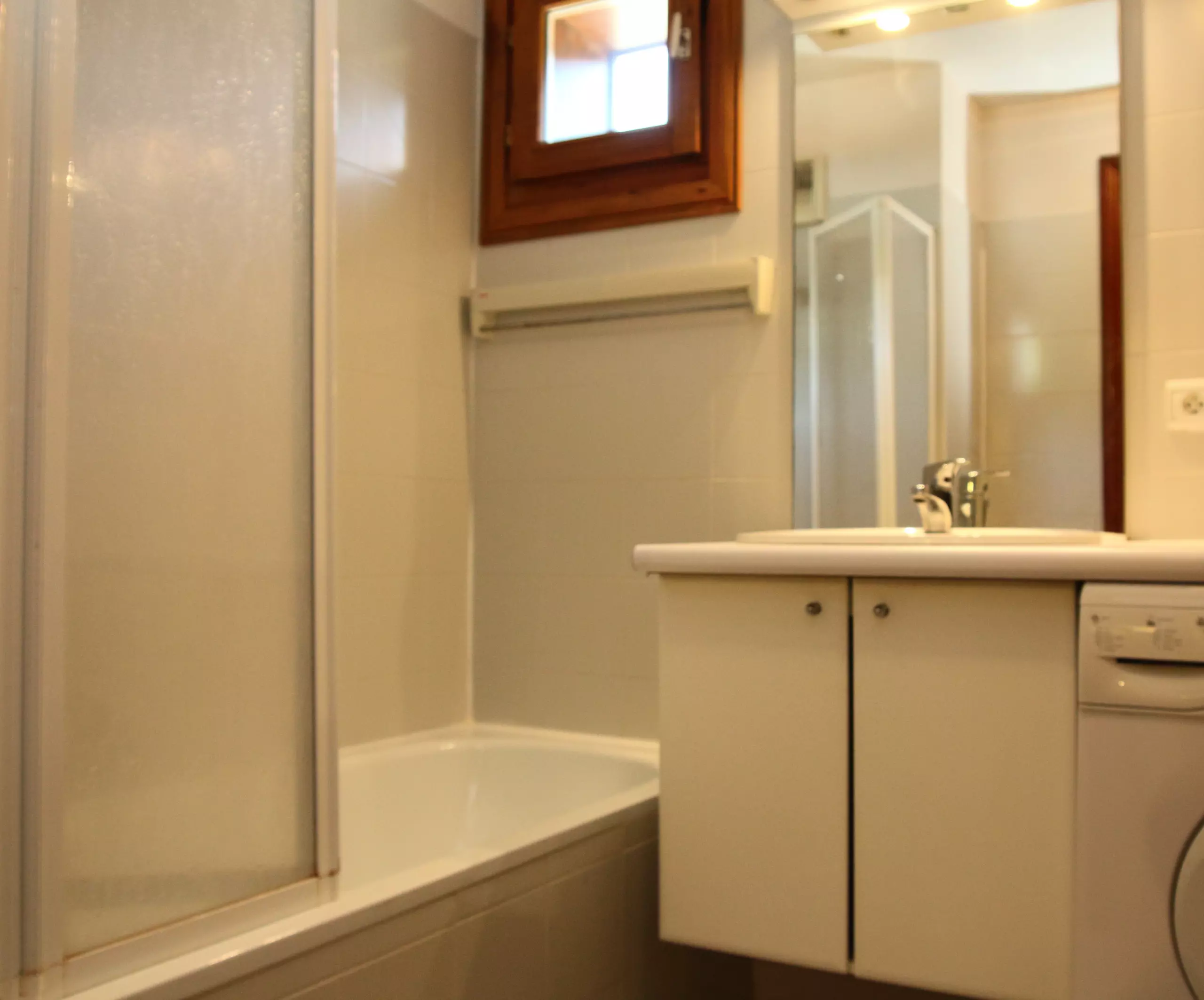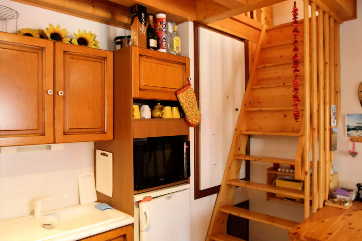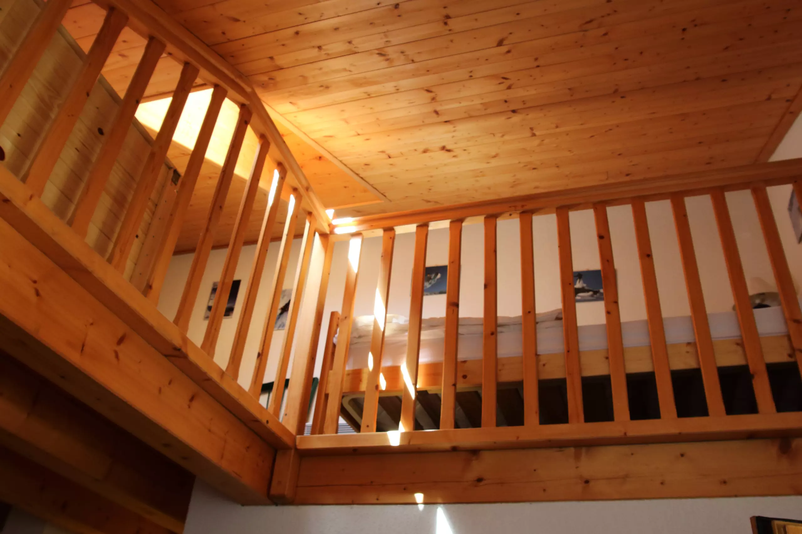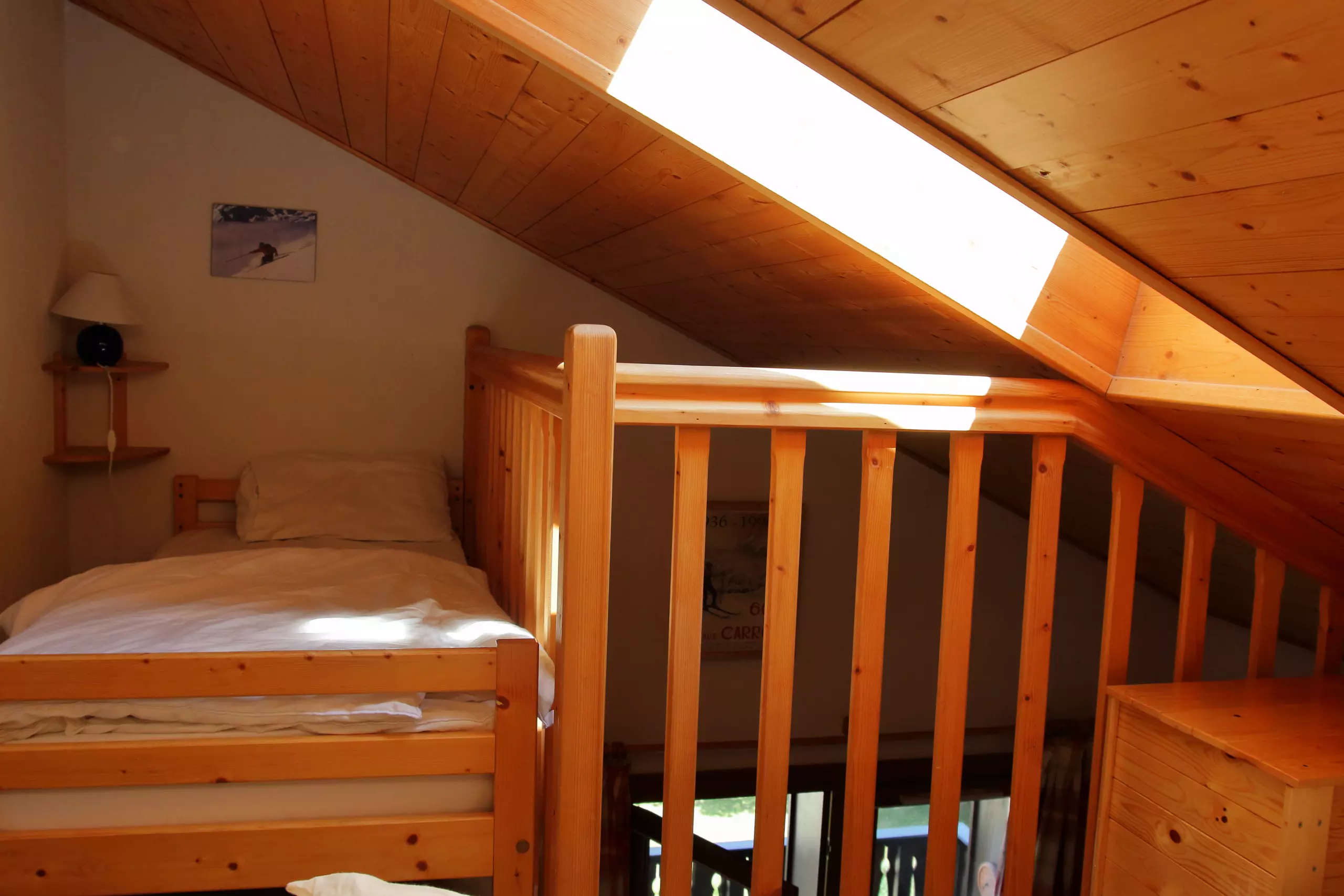 Apartment on the 3rd floor with elevator in the "Sabaudia" residence in the village center, with a living area of 36 m² + 10 m² with a ceiling height of less than 1.80m. This apartment comprises 3 sleeping areas, accommodating 6 people: a bedroom (1 double bed), a cabin (2 bunk beds), and a mezzanine (2 single beds). Please note that access to the mezzanine is via a very steep staircase. East-facing balcony with views of the village and the Timalets ski slope.