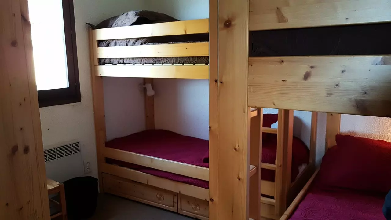 Rented for up to 6 people, it comprises an entrance hall, a bedroom with two sets of bunk beds, a bathroom with a washer-dryer and separate WC, and a separate kitchen opening onto a dining area that comfortably seats 6. The living room is furnished with a set of pull-out beds and separated from the rest of the apartment by a curtain, creating a separate sleeping area.