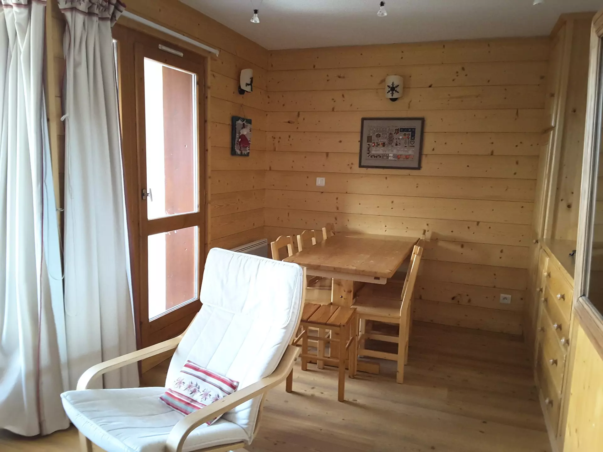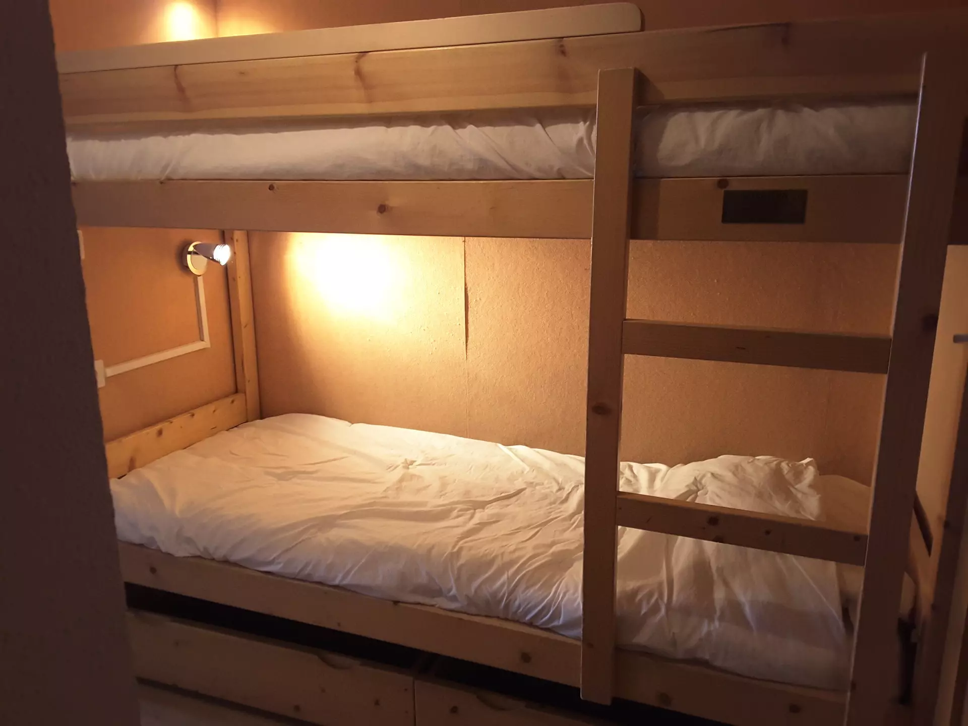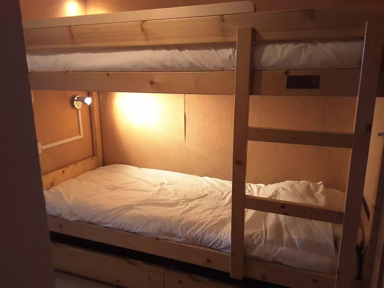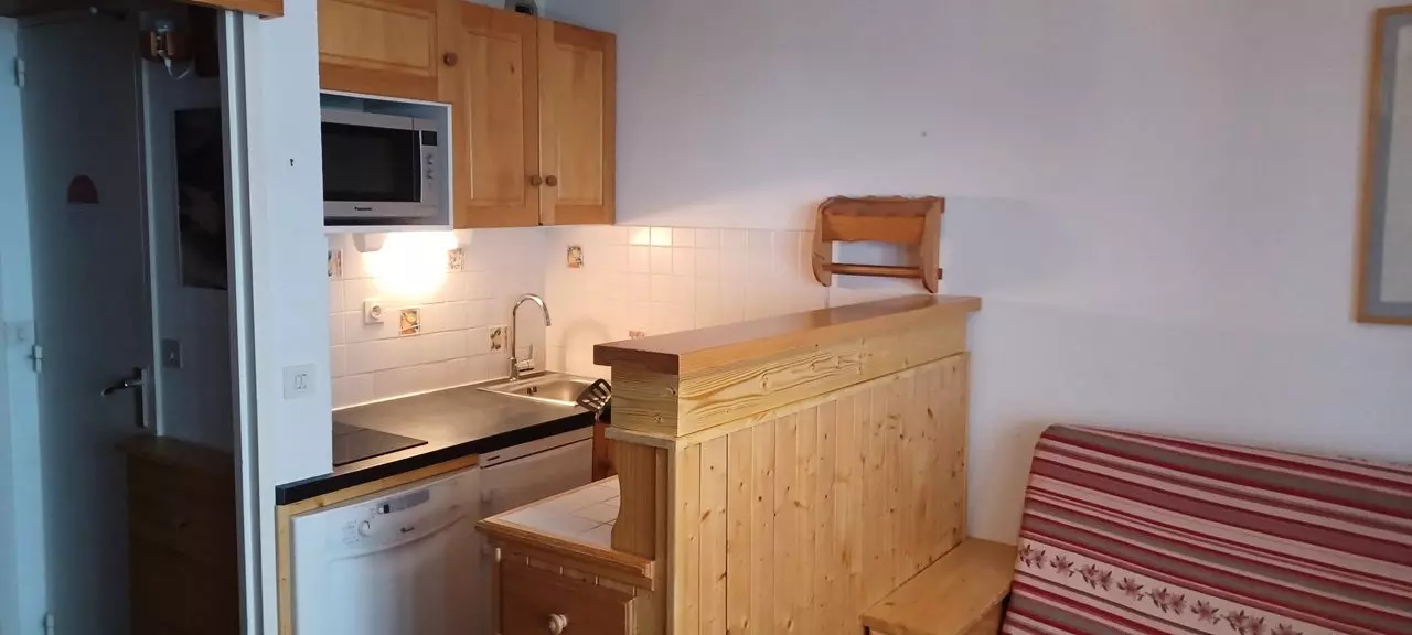 Apartment of 36m², in a residence located in the heart of Plan Peisey. Rented for 4 to 6 people, it consists of a bedroom with 1 double bed, a mountain alcove with two bunk beds, a bathroom (with washing machine) and separate toilet, and a kitchen area open to the living room.
