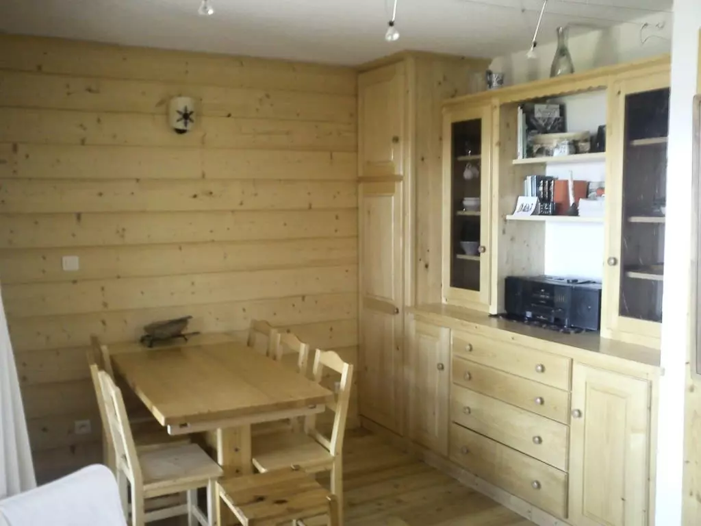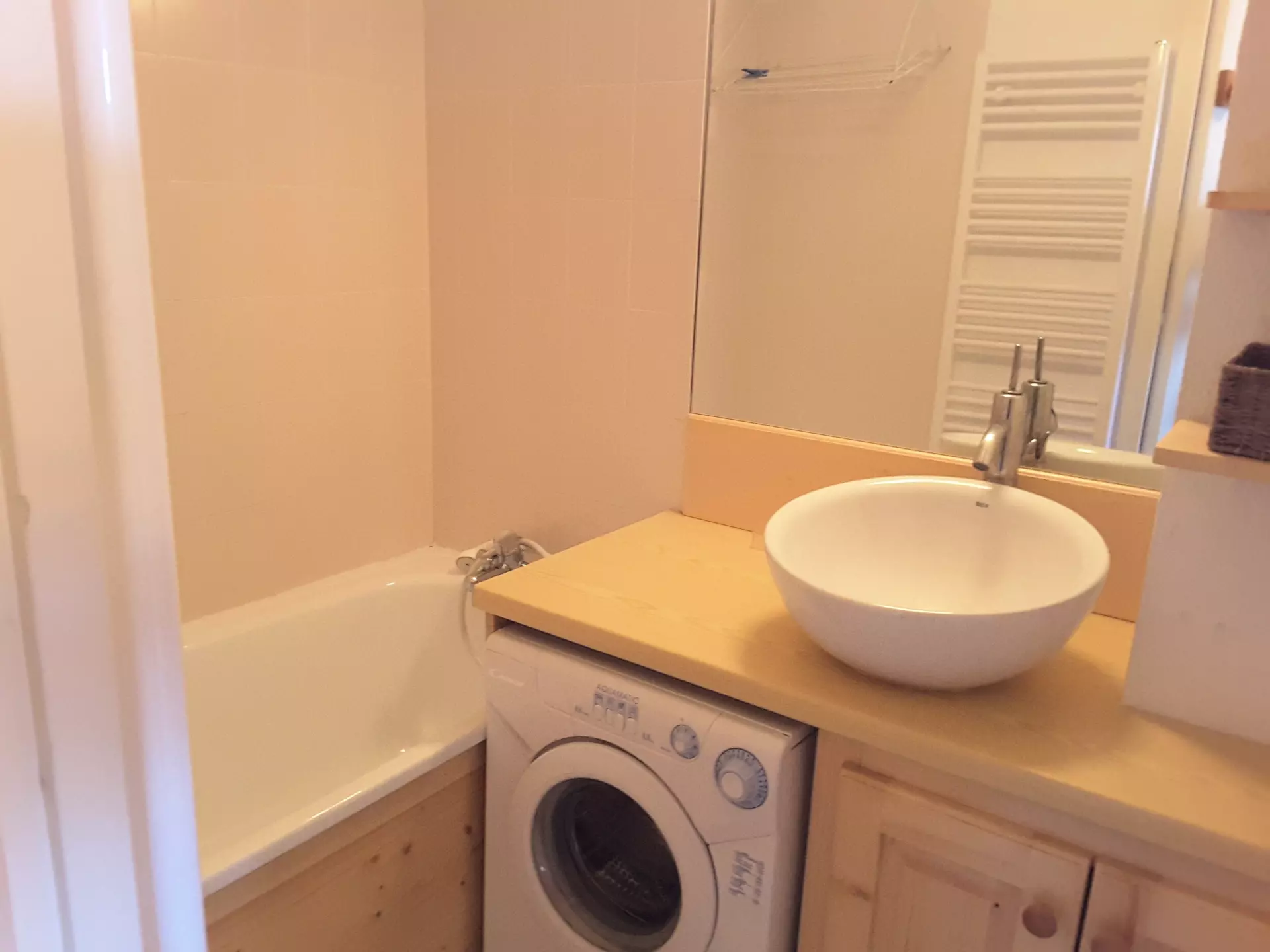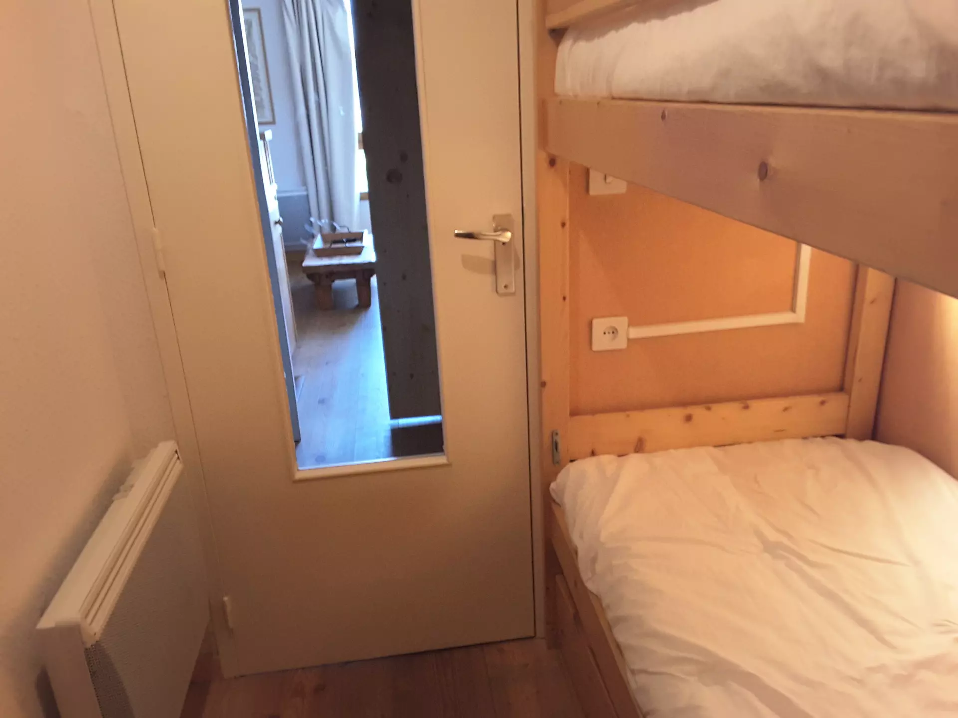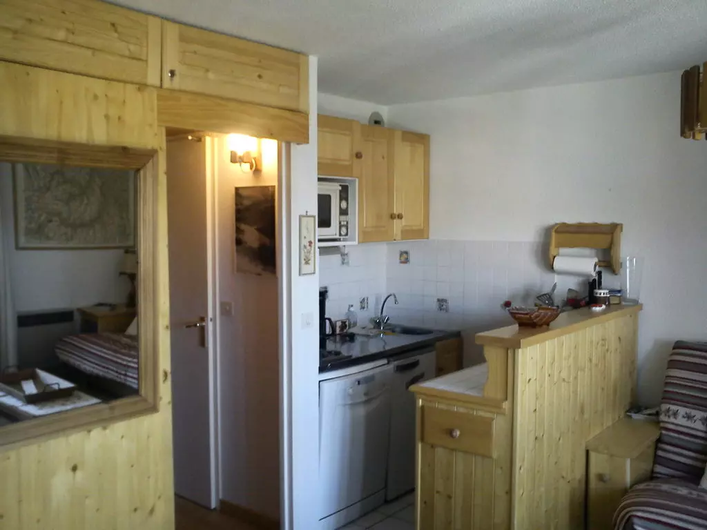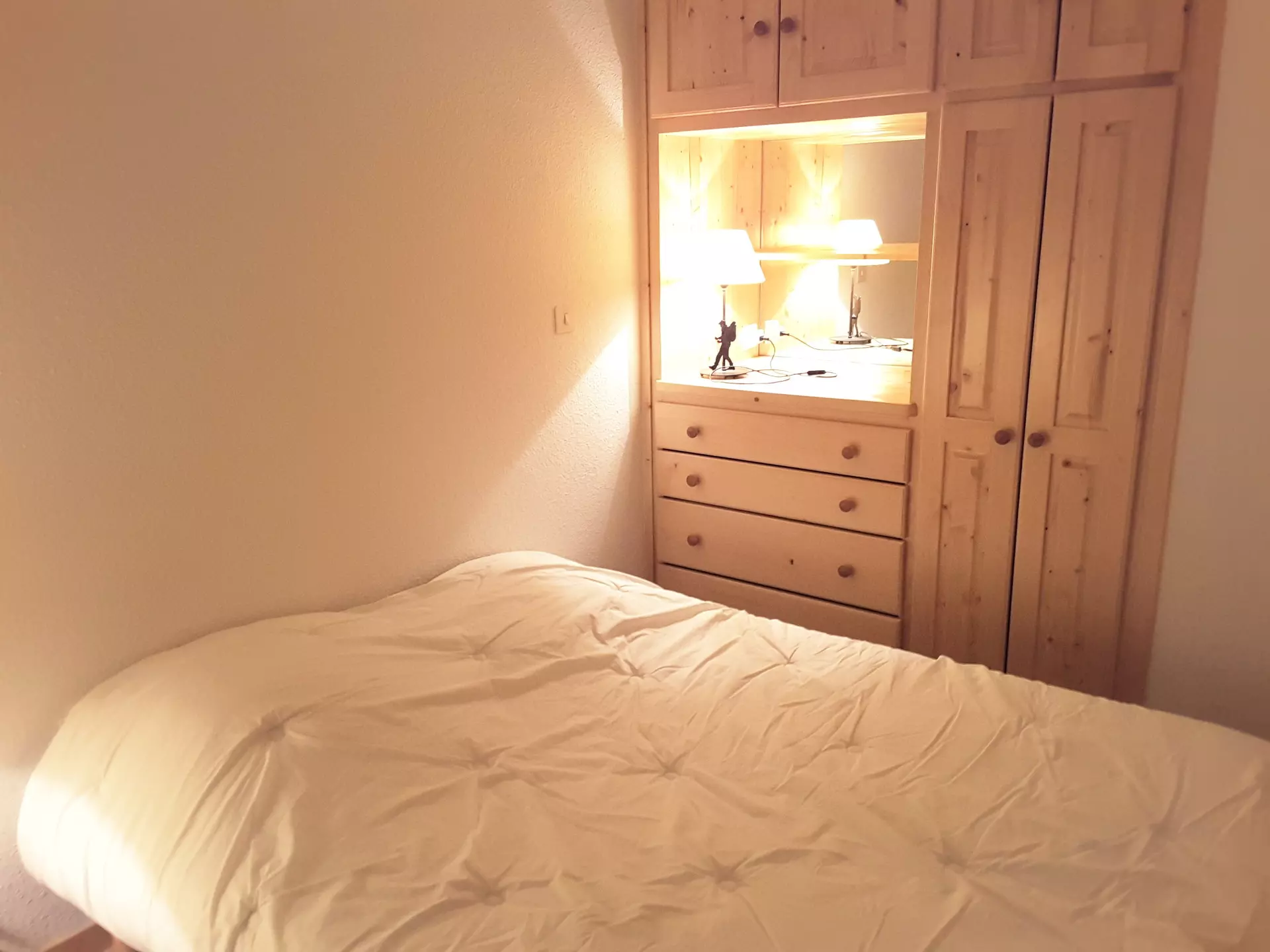 Apartment of 36m², in a residence located in the heart of Plan Peisey. Rented for 4 to 6 people, it consists of a bedroom with 1 double bed, a mountain alcove with two bunk beds, a bathroom (with washing machine) and separate toilet, and a kitchen area open to the living room.